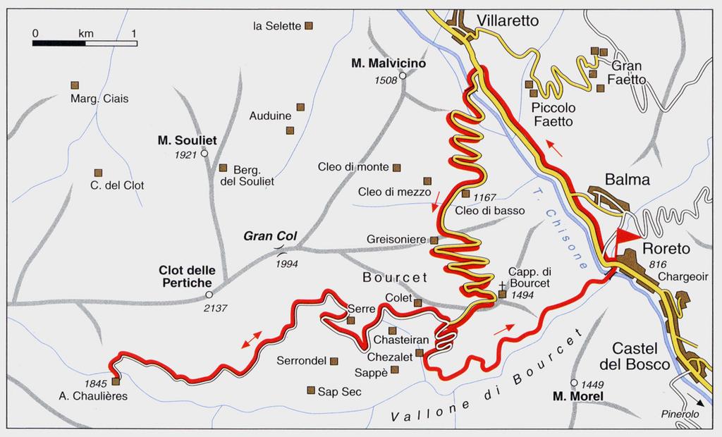Da Villaretto si discende per qualche centinaio di metri la strada statale, fino ad incontrare sulla destra un cartello indicante Rifugio Serafin, dove si svolta ancora in discesa fino al Ponte che attraversa il fiume Chisone. Per un breve tratto la strada è sterrata e costeggia in piano il fiume stesso.