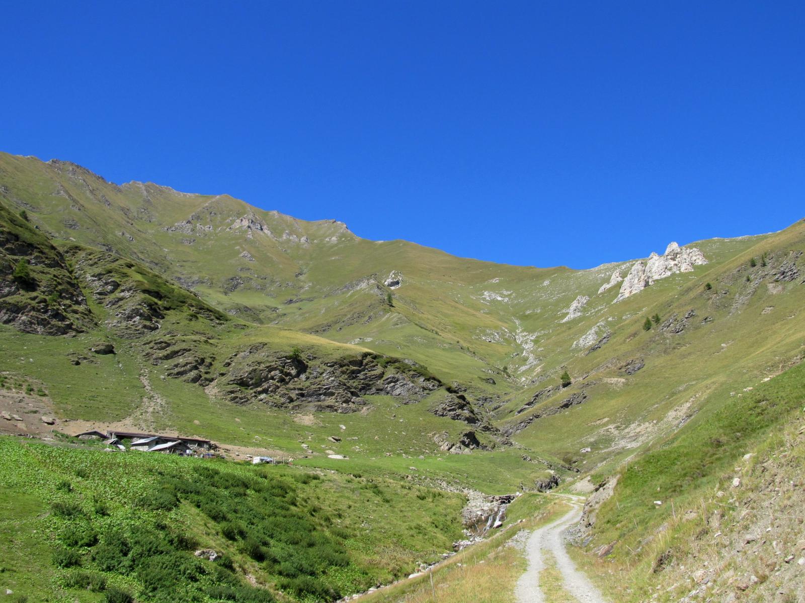 Rimane soltanto un ultimo lungo traverso a mezza costa sulle pendici del Clot delle Pertiche, che con alcuni saliscendi porta al fondo del vallone di Bourcet, dove la strada termina agli alpeggi Chaulieres km.14 m.1843, che si vedono solo all’ultimo.