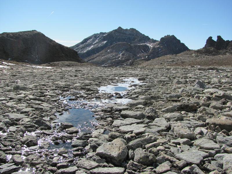 Proseguire costeggiando il lago fino ad incrociare l’Alta Via n.1. Prima della devizione per il Col Fenetre du Tzan, salire a destra un ripido canale seguendo dei segni gialli. Si raggiunge un ripiano con torrente in ambiente himalayano, a fianco del cordone morenico alle cui spalle è posto uno splendido laghetto.