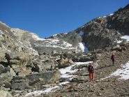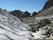 Seguire gli ometti ed imboccare una larga rampa tra grandi blocchi, giungendo alla base del grande accumulo detritico su cui poggia il colle. Si rimonta l’ultimo tratto fino a raggiungere la larga sella del Col de Chavacour.