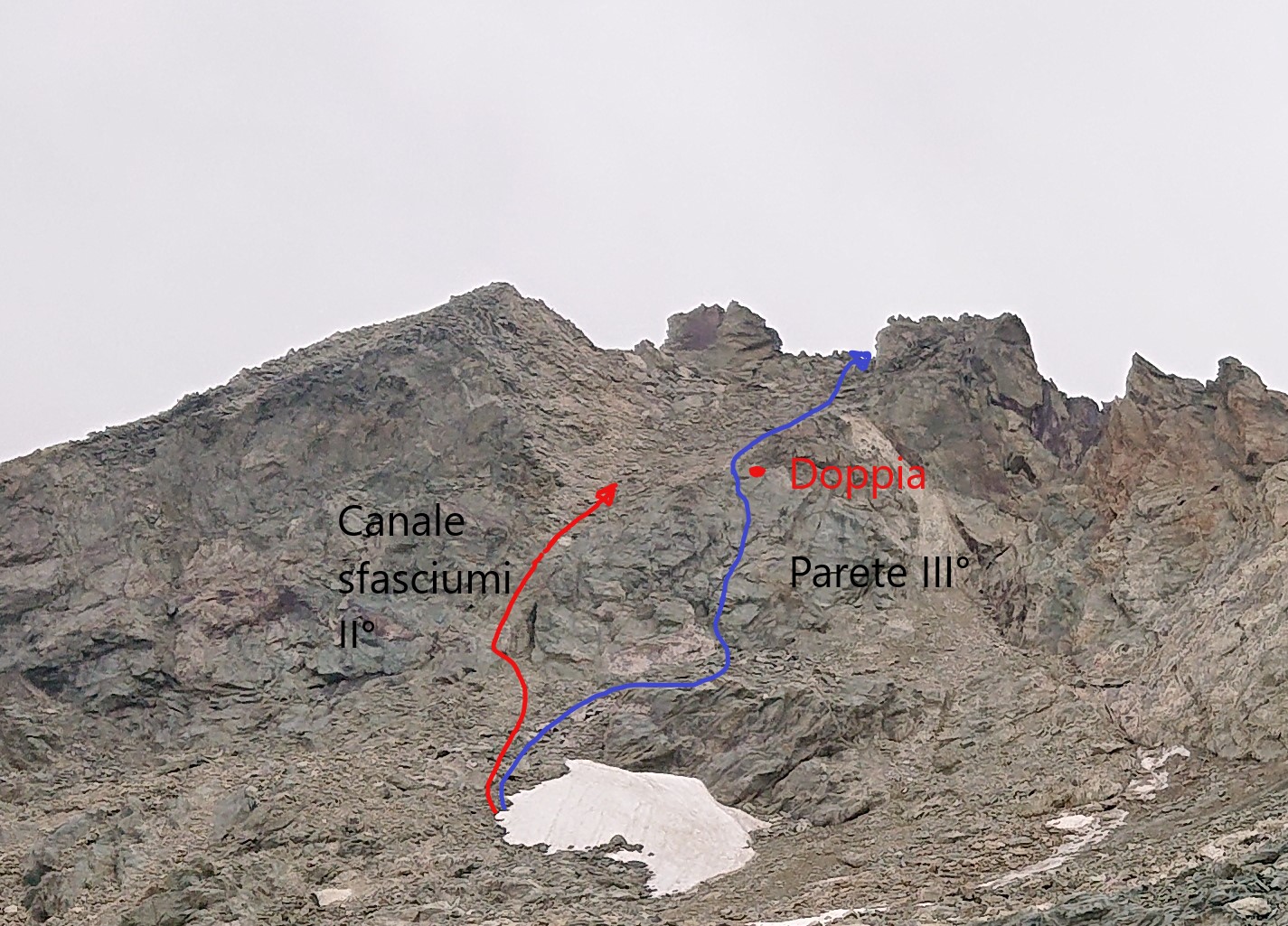 Dal colle di Chavacour salire la dorsale nord della vetta sino a circa 3000 metri, poi con lungo traverso verso sinistra sul ghiacciaio ormai estinto portarsi verso l’unico punto debole che permette la salita in cresta, un canale detritico appena a destra della quota 3186 (allego foto con indicazioni). Raggiunta la base del canale si potrebbe salire la paretina iniziale con probabili passi di II° per poi sbucare sulla parte superiore detritica, vista la poca stabilità del pendio preferibile salire la paretina alla sua destra (passi di III°) per sbucare a metà canale e proseguire sul suo lato destro su sfasciumi sino in cresta.