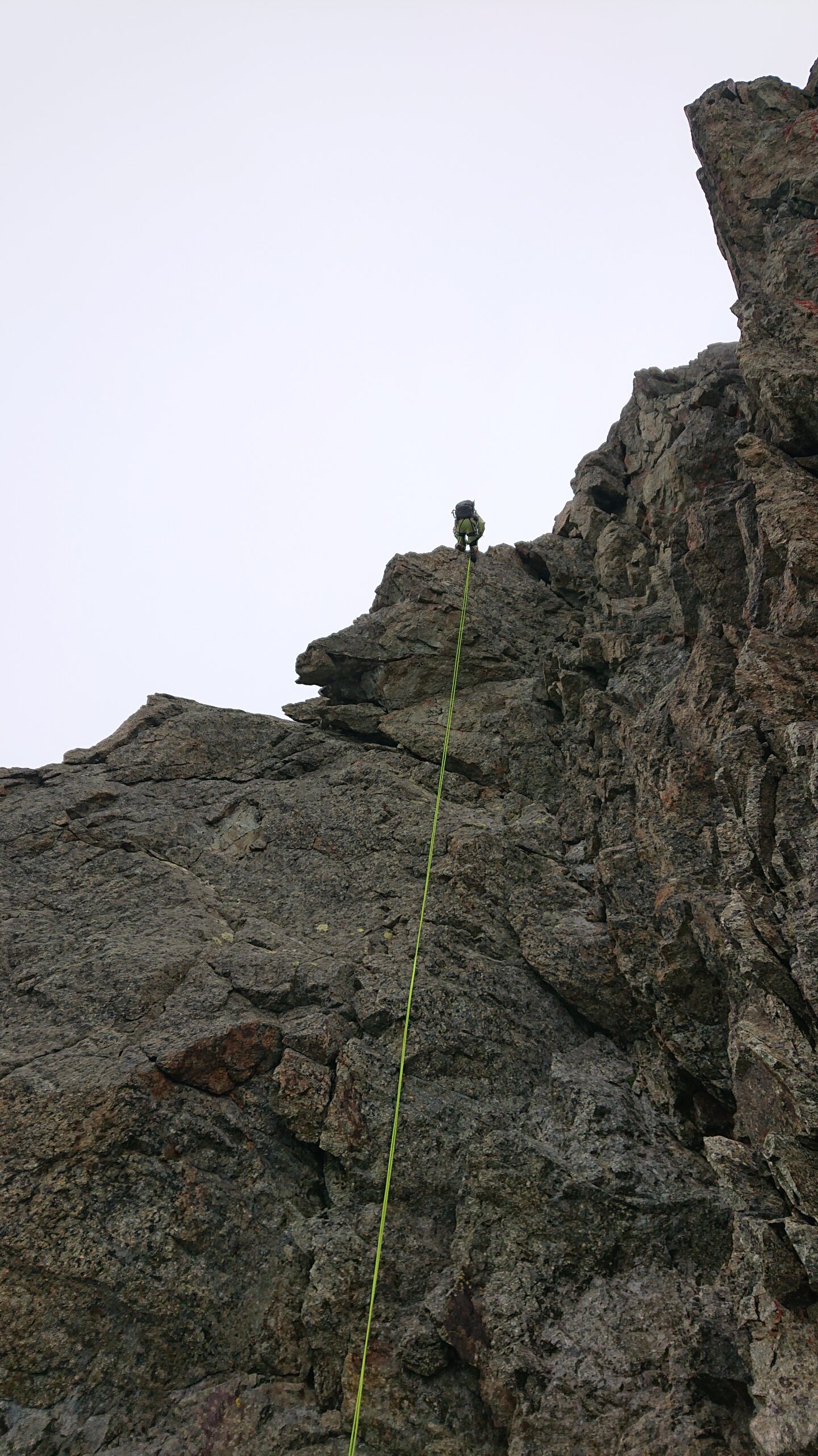 DISCESA, lungo la via di salita. Attrezzato doppia (30 metri) per la calata del torrione. Altra doppia (30 metri) per scendere la paretina di III° evitando così il canale insidioso.