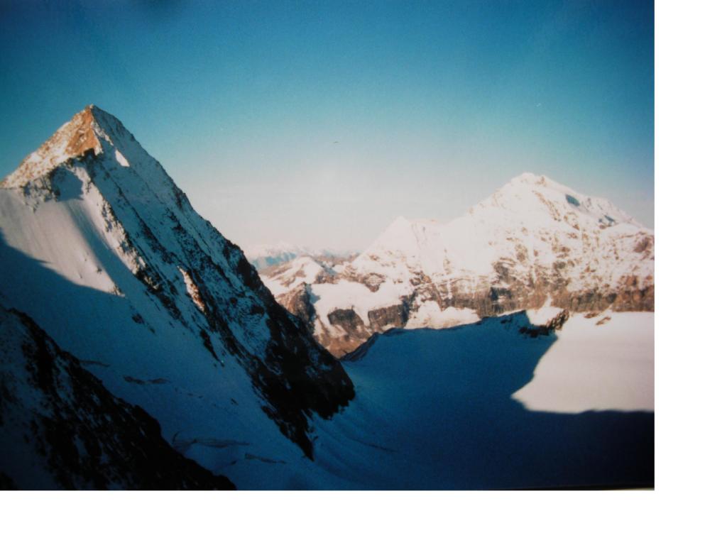 Prendere sulla sx su neve o, se c’è ghiaccio, proseguire ancora su roccia fino a 3650 m, quindi traversare verso NE fino alla sella fra la vetta e la quota 3827. Seguire infine la cresta SO, rocciosa, affilata, talvolta esposta ma non difficile fino in vetta (passo di III finale non evitabile, 4-5 h dal rifugio).