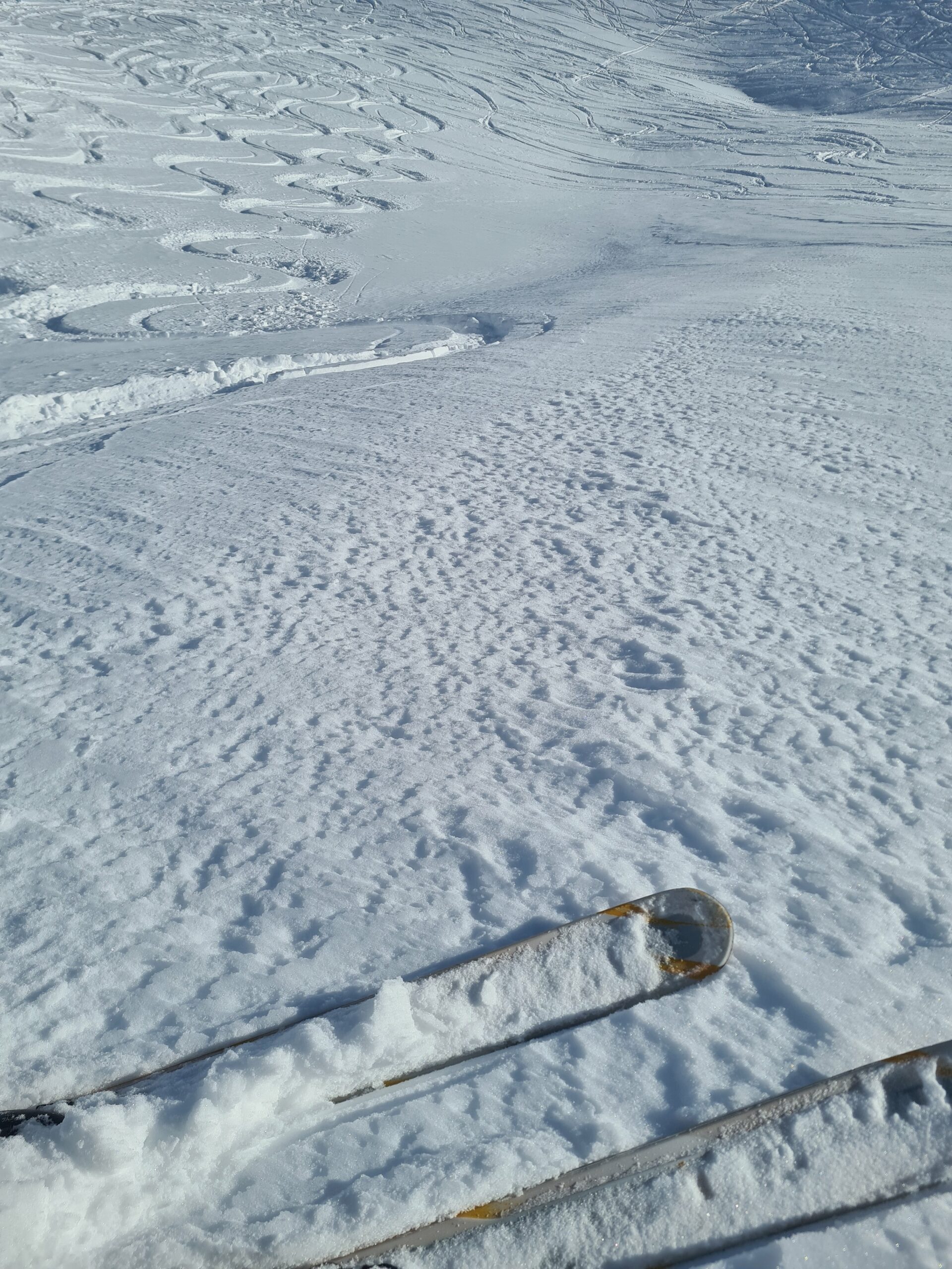 150 macchine, fortunatamente tutti per il colle. Salito con vento gelido, in discesa scegliendo linee non convenzionali si trova ancora spazi intonsi di farina molto bella e veloce, dal pianoro in giù su comoda stradina fino alla macchina