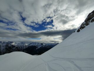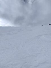 Discesa prima parte un po’ obbligata e tritata, purtroppo la luce era un po’ piatta e bisognava scendere abbottonati,dal colle si apre un ampio ventaglio di possibilità e vallette poco tracciate con neve come detto veloce e divertente anche sul piano,solo un filo inumidita e appesantita.