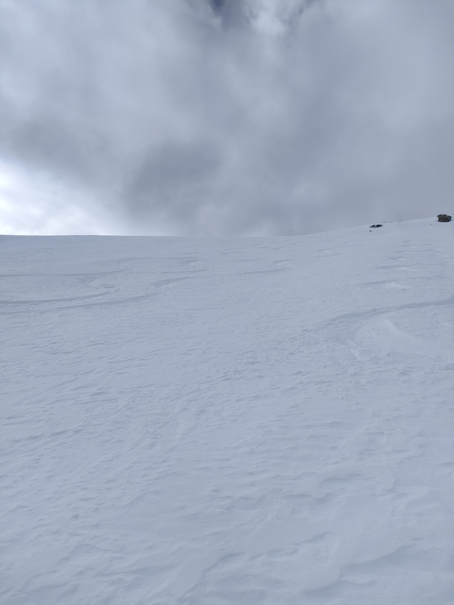 Dal colle o poco prima si volta a dx in salita,buona traccia ma un po’ ricoperta dal vento,per noi saliti per primi,dal colle all anticima in questione sciistica vento forte e freddo,preso bella gelata nel cambio,ma sotto nulla.