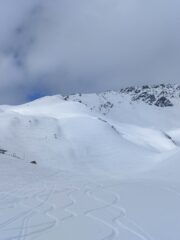 Come si gira nella conca il vallone ha un ottima copertura,molto tracciato al colle con varie linee di salita più o meno dirette,ma comunque ancora ampi spazi per la discesa.qualche strappo più ripido porta al colle,quasi tutti diretti lì.
