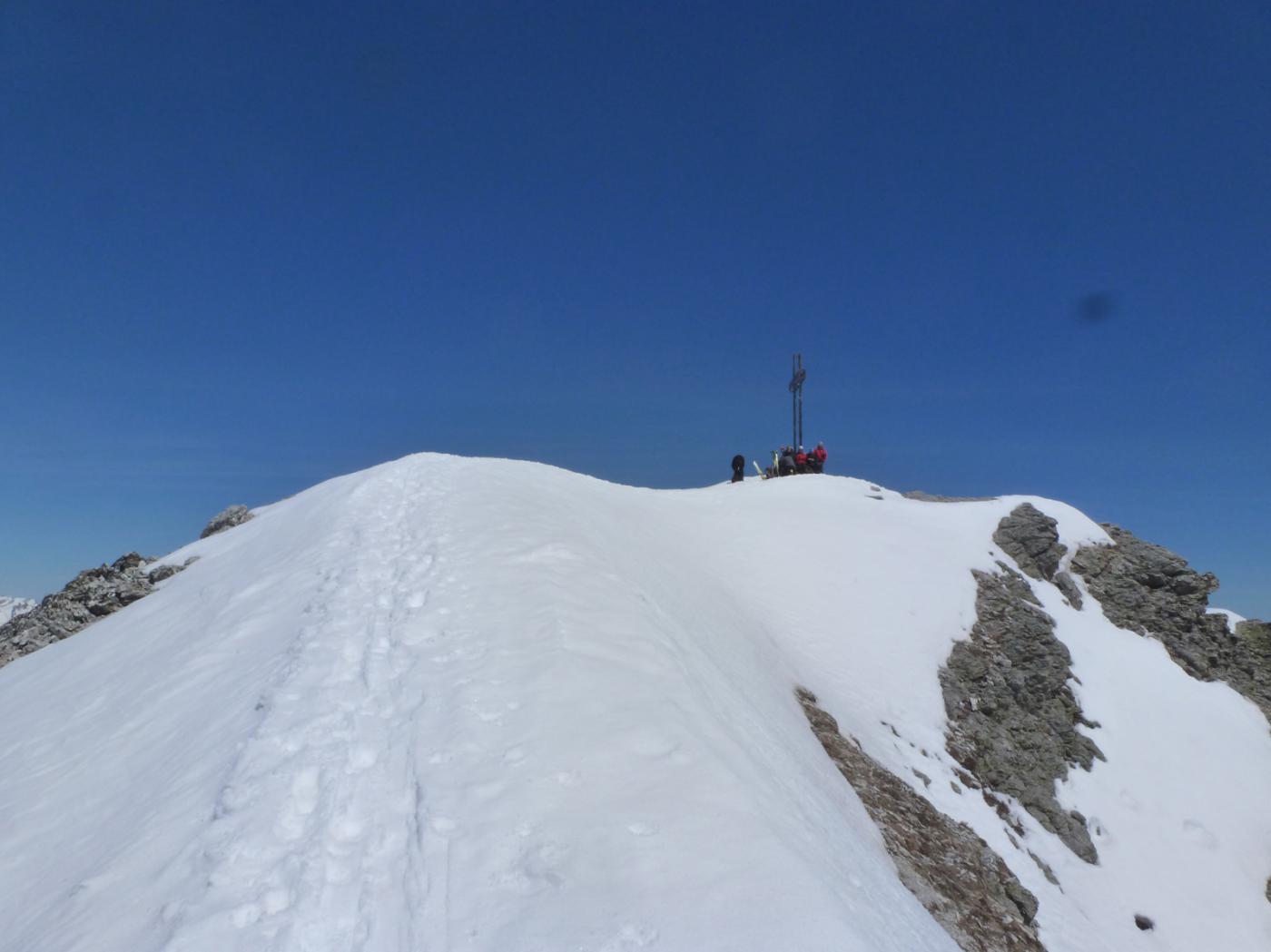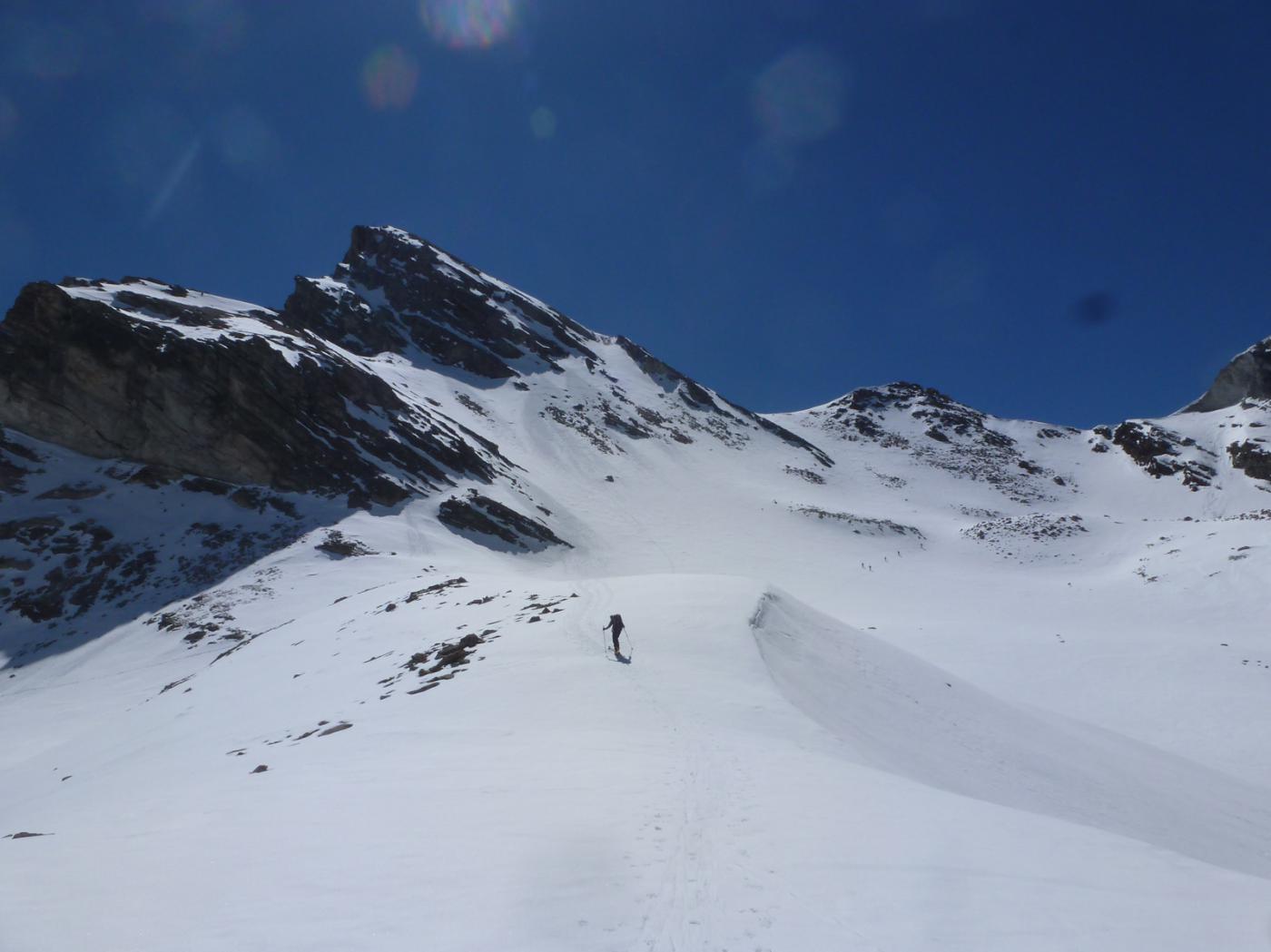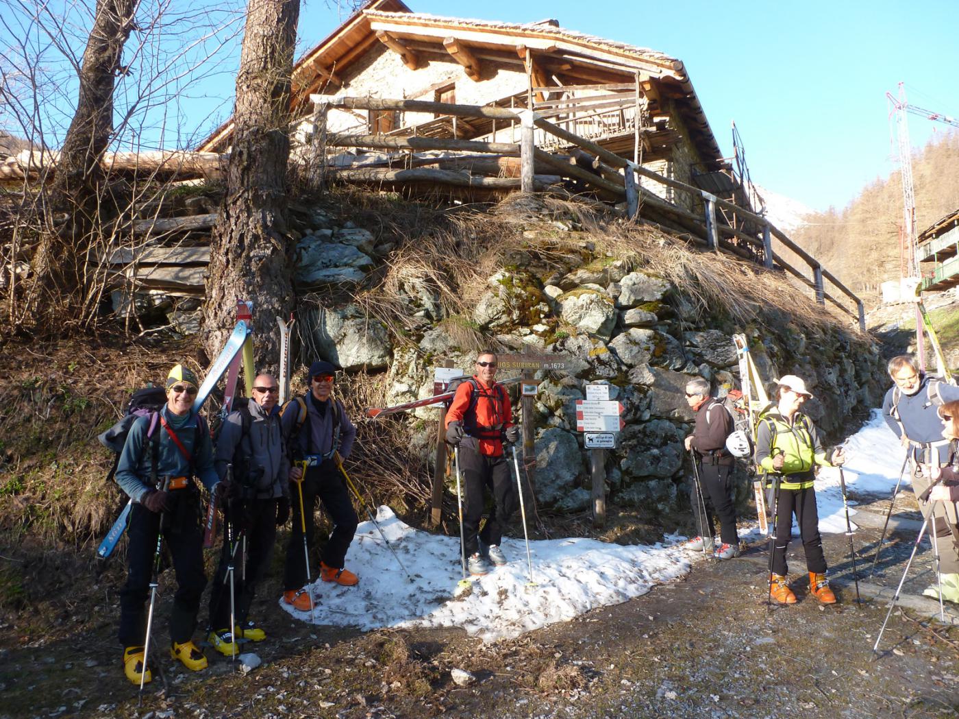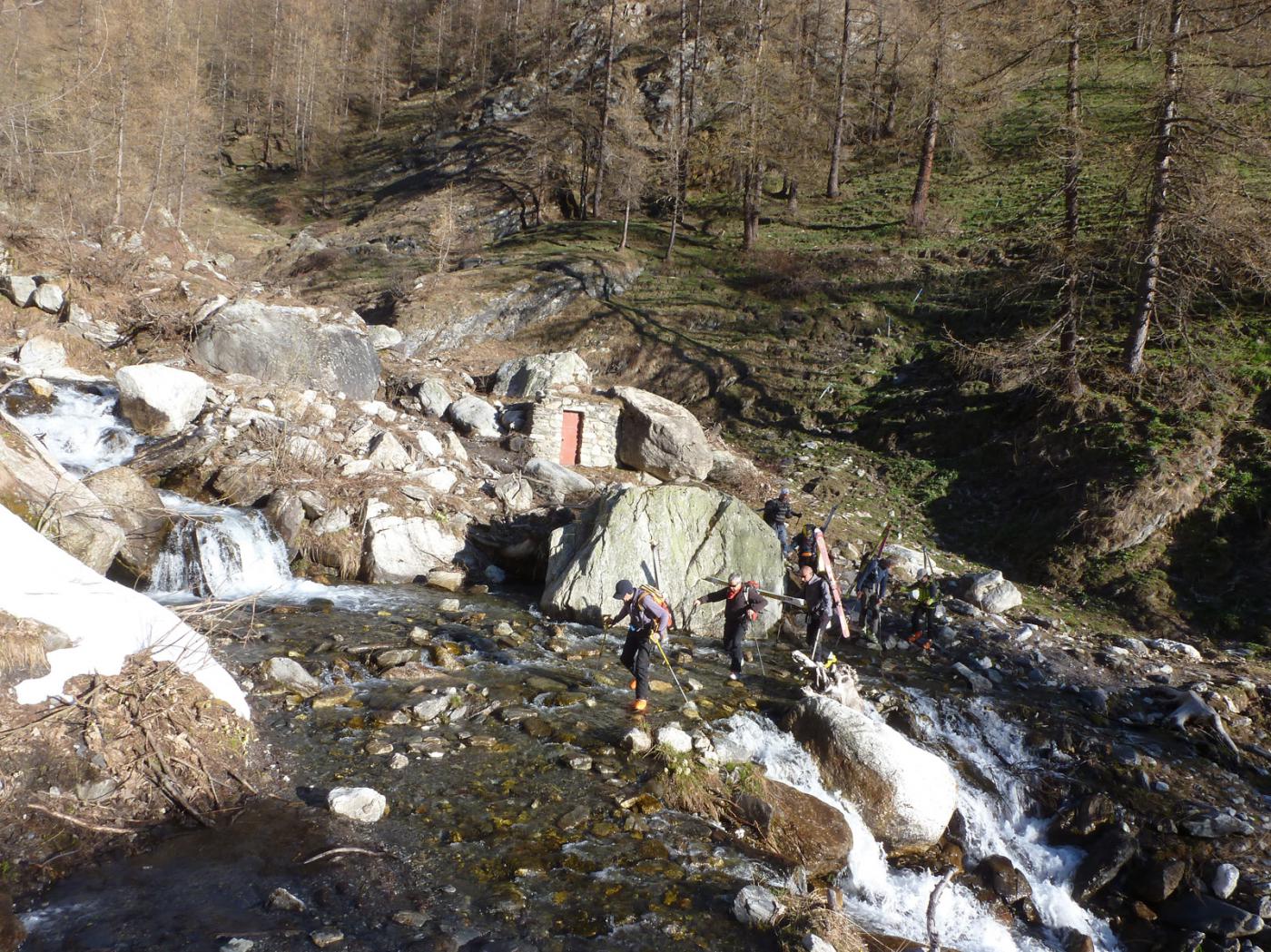 Il Chersogno da un vallone poco battuto. Portage fino alla grangia Chiotrosiere, proseguimento nel bosco su poca neve, ma sufficiente fino al vallone di Gias vecchio. Il percorso per il Monte Camoscere di qui è molto magro oramai. Il pendio-canale di salita è in ottime condizioni (di fianco una vecchia valanga a lastroni che ricorda la pericolosità del luogo se non è a posto) chi lo sale con gli sci chi con i ramponi. Nei valloni successivi la neve è perfetta, dura il giusto senza essere ghiacciata fino al passo Sud-Est del Chersogno. Crestone finale perfetto, si arriva in cima sci ai piedi senza nessun problema. Discesa attorno alle 14 (dovevamo pur arrivare tutti) su neve che non aveva mollato quasi niente, i 2 canali entusiamanti ed il resto, compreso il tratto nel bosco con quasi nessun sfondamento. Per un canale arrivati al torrente (attraversato davanti alla presa d’acqua) e di qui tra i prati pieni di crocus in un quarto d’ora a Chiosso.