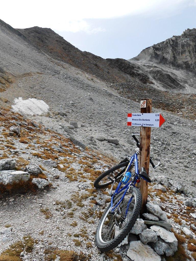 Chiariamo subito: nè anello nè vetta integrale con la bici x me, ma partenza dal colle di Sampeyre ove ero salito per uscire dalle nebbie senza meta precisa e poi, un pezzo alla volta (e parecchio spintage, ma questo vale x me che la bici la uso pochissimo) son giunto al Bonfante. Da qui il Chersogno mi ha strizzato l’occhiolino e allora su, lasciando il biciclo al nevaio prima del ghiaione finale. Ultimo sole sulla cima in perfetta solitudine, poi ritorno per il sentiero di salita con tratti che richiedono un pò di tecnica (che non ho) ed altri davvero divertenti, in particolare il traverso sotto la conca del Pelvo, propi bel!