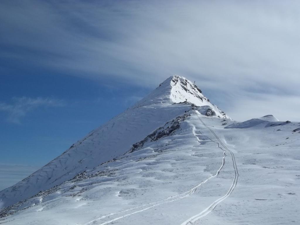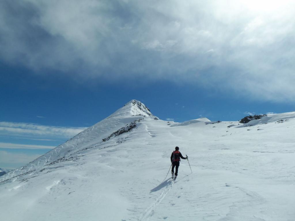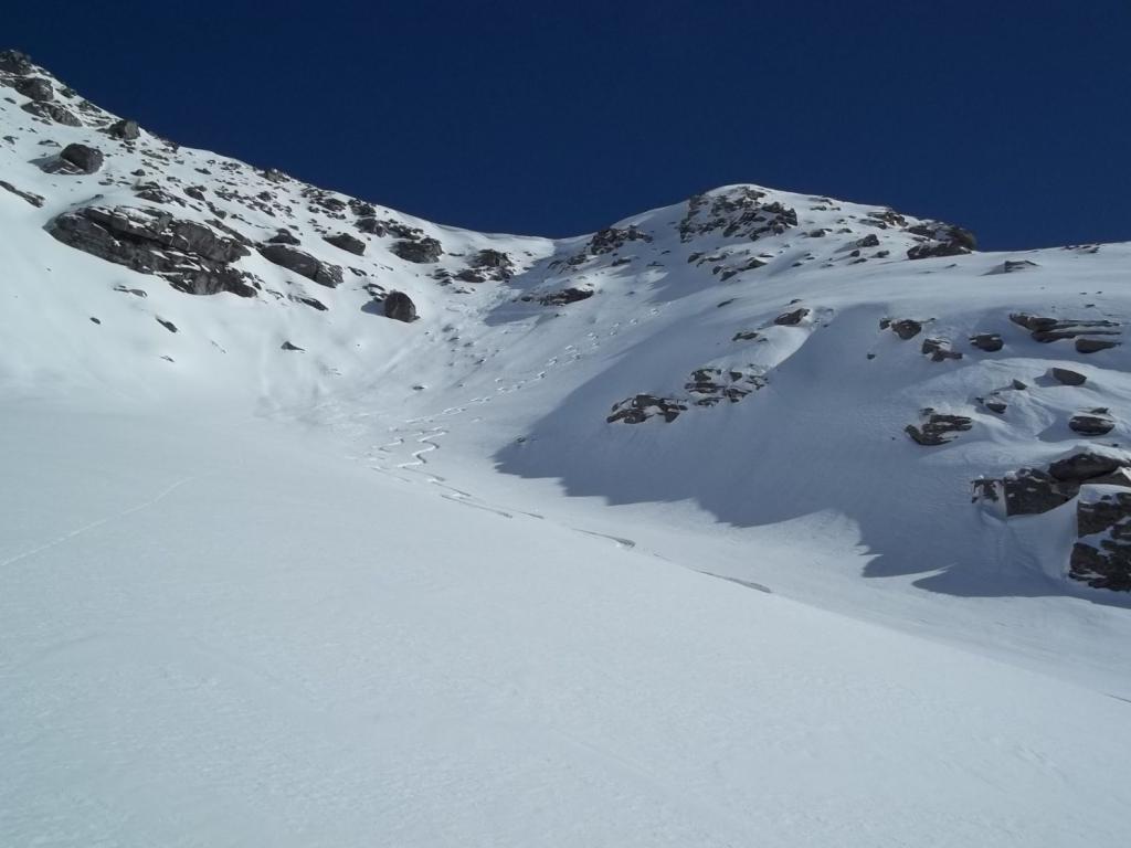 In condizioni ottimali si può risalire direttamente la parete (400mt Max 35°) per uscire in cresta oppure dritti in punta (Max 40°), altrimenti aggirare il dosso Schwarze-Tschugge e con percorso meno esposto raggiungere il valico di Alpjenpass (mt2858) dal quale in breve si perviene alle facili roccette sommitali dal versante NE.