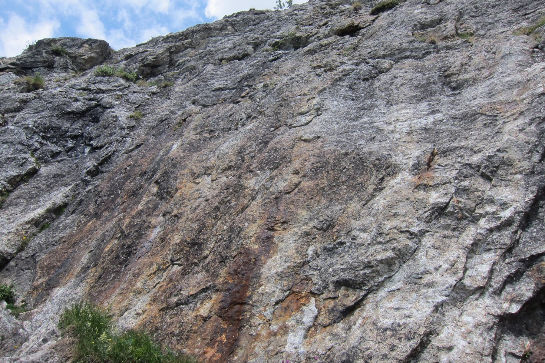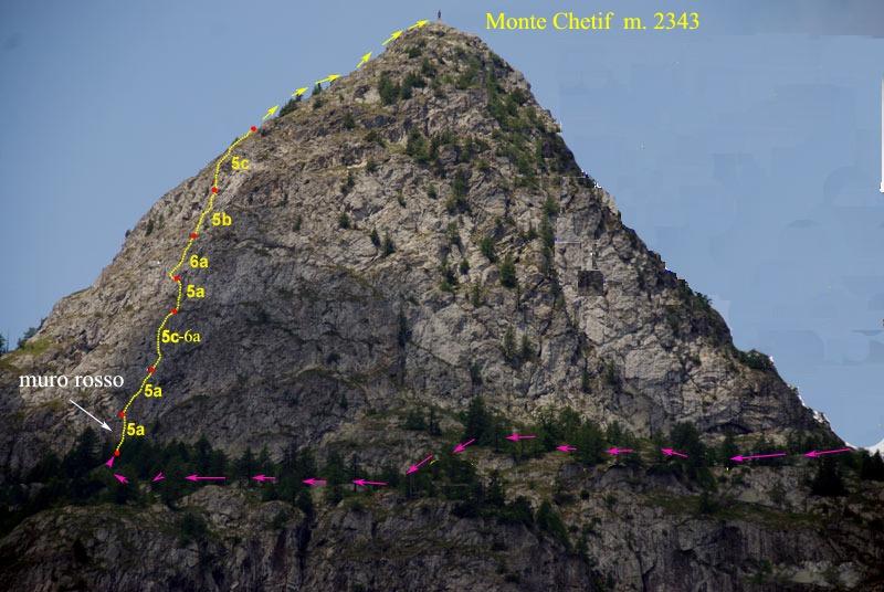Di qui prendere il sentiero che sale dietro il piccolo chalet della Scuola di sci, alcune catene ed una scaletta portano alla parte pianeggiante del sentiero rivolta verso Courmayeur, continuare fino ad incontrare altre catene in discesa, scendere e dopo una cinquantina di m. si trova un ometto sulla sinistra, di qui salire dritti alla parete verso un muro rosso ben visibile. 45 min.
