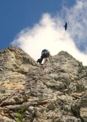 Bella via, roccia ottima, chiodatura buona nei tiri più impegnativi, un po’ più ariosa dove più facile. Soste comode, protezioni mobili inutili e poi, una volta in vetta, il mondo davanti.
