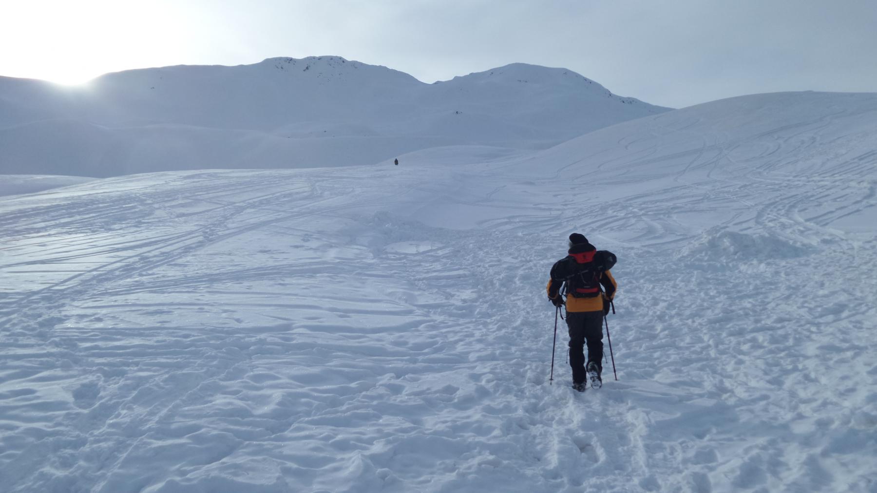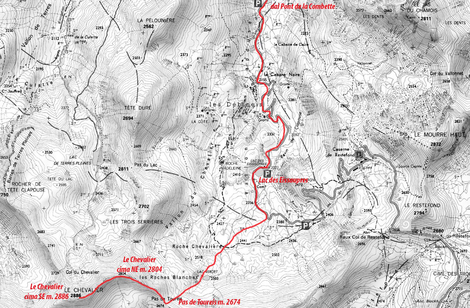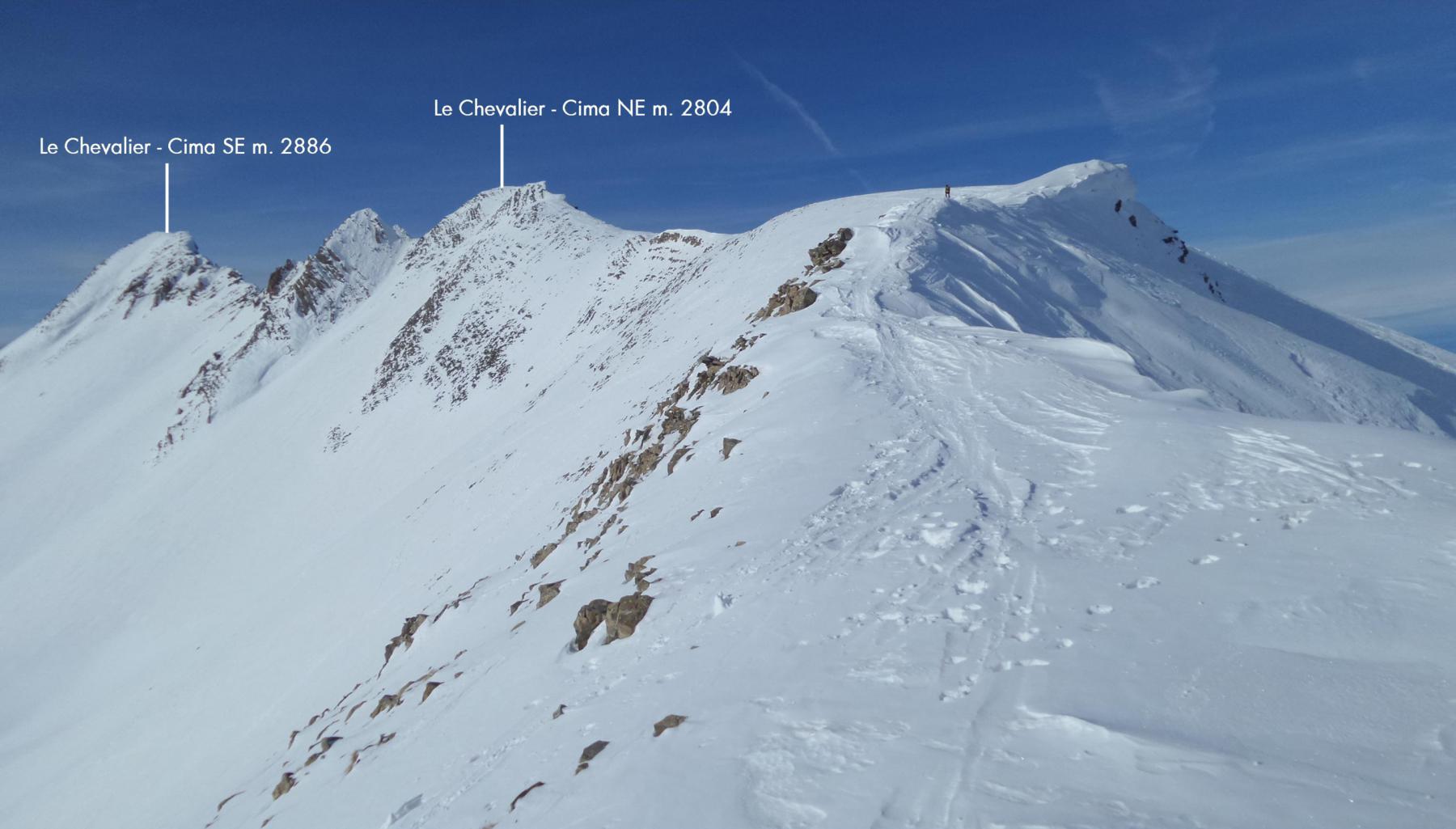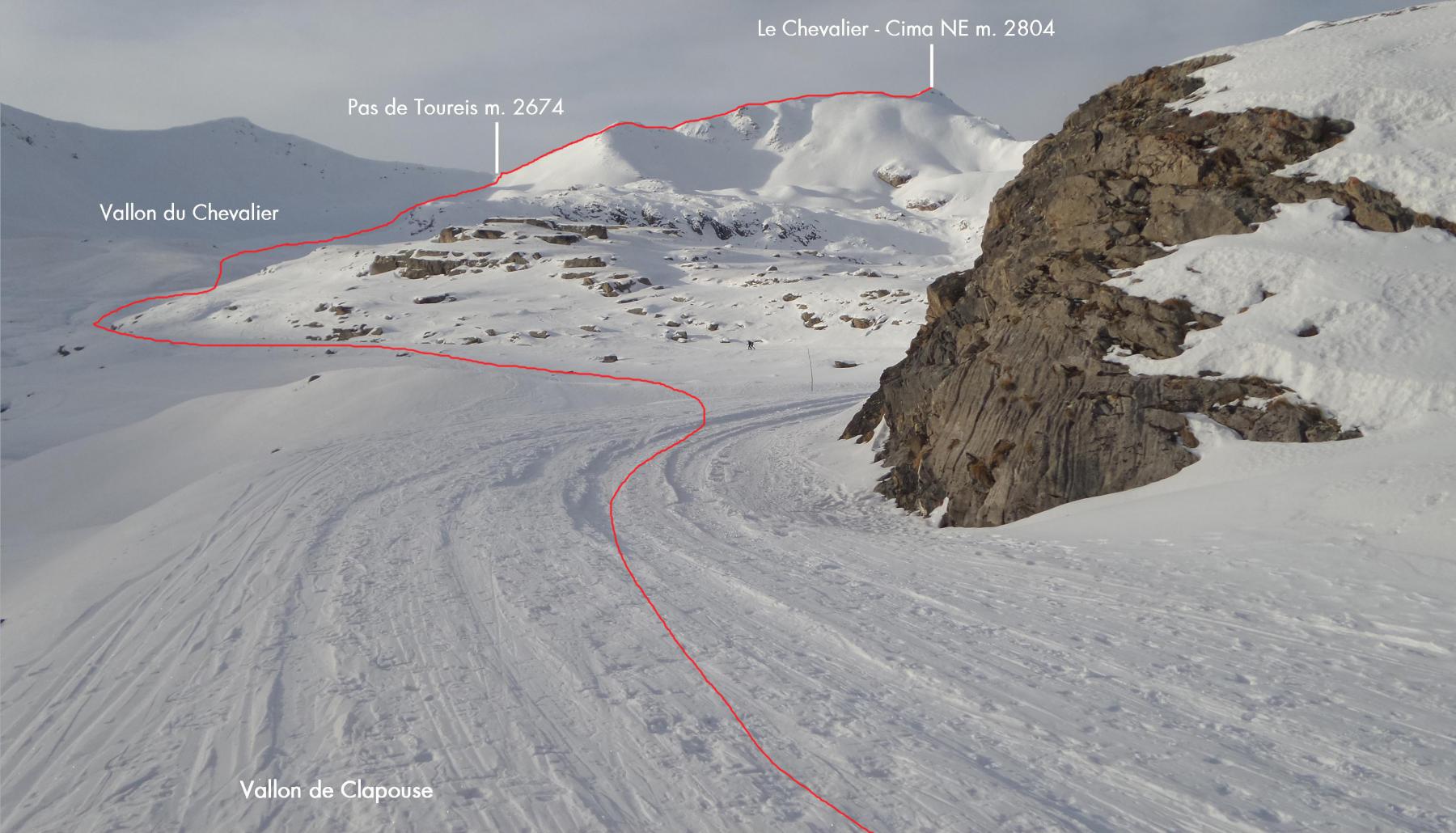 Dal Pont Ravin de la Combette 1650 m si segue la strada che sale a mezzacosta prima e con una serie di tornanti successivamente, prendendo quota e raggiungendo un tratto pianeggiante a quota 2050 m (dove è possibile arrivare in auto a maggio). Proseguendo lungo la strada si raggiunge un ponte e una piccola costruzione in pietra (Cabane de Clapouse 2140 m). Si attraversa il ponte, e si prosegue lungo la strada innevata, oltrepassando una seconda piccola costruzione in pietra (la Cabane Noire 2155 m) inoltrandosi nell’ampio Vallon de Clapouse. Si supera il piccolo Lac des Eissaupres (non sempre visibile) e si segue ancora per un breve tratto la strada, fino alla conca terminale del vallone, dove si abbandona la strada che s sinistra sale verso il Col de Restefond, si volge a destra e si punta ad un colle ben visibile, posto tra la Tetasse (a sinistra) e Le Chevalier (a destra). Si seguono le ondulazioni del Vallon du Chevalier sulla destra, con alcuni saliscendi fino ad arrivare al pendio terminale abbastanza ripido, che va superato direttamente o con una serie di diagonali, raggiungendo il Pas de Toureis 2674 m. Dal Passo si prosegue a destra lungo la cresta NE, inizialmente larga e facile, con un tratto ripido si raggiunge uno spallone a quota 2750 m, poi la cresta gradualmente si restringe e diventa nuovamente ripida, un ultimo tratto più affilato ed aereo (attenzione alle possibili cornici) porta in vetta all’anticima NEdel Chevalier 2804 m (grande ometto di pietre), vetta tradizionale per gli scialpinisti. Si prosegue scendendo un tratto di misto aereo e non banale raggiungendo un colletto, qui si può scavalcare sul filo un gendarme roccioso (attenzione ad una placca spesso ricoperta da neve instabile) oppure traversare a destra (lato Restefond) su terreno esposto e infido raggiungendo un tratto di cresta costituito da dentini e pinnacoli rocciosi, che si aggirano a sinistra sempre su terreno esposto fino a raggiungere un altro colletto, dove la cresta si allarga e con percorso più agevole conduce in vetta alla cima SE (punto culminante) del Chevalier 2886 m.