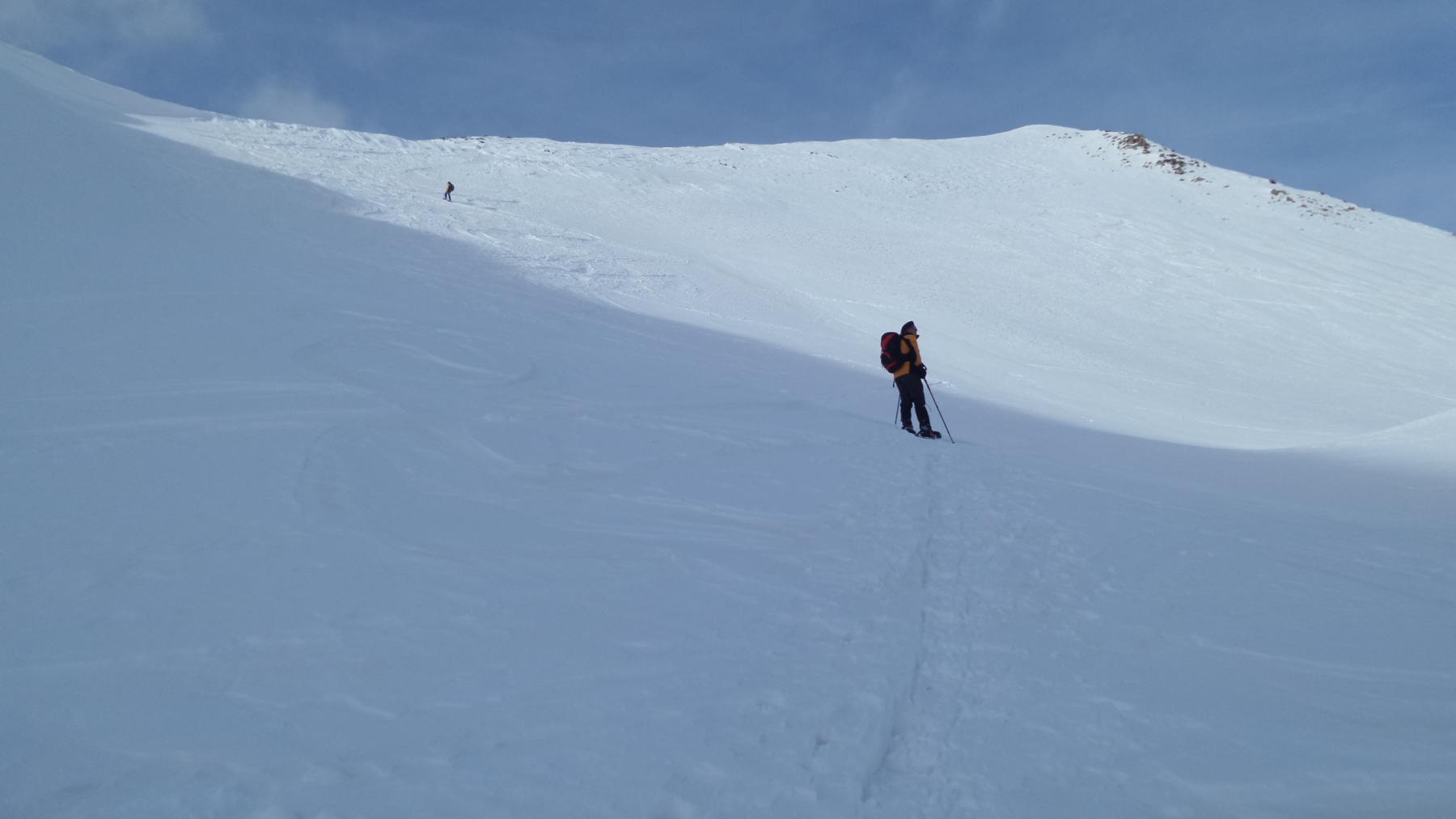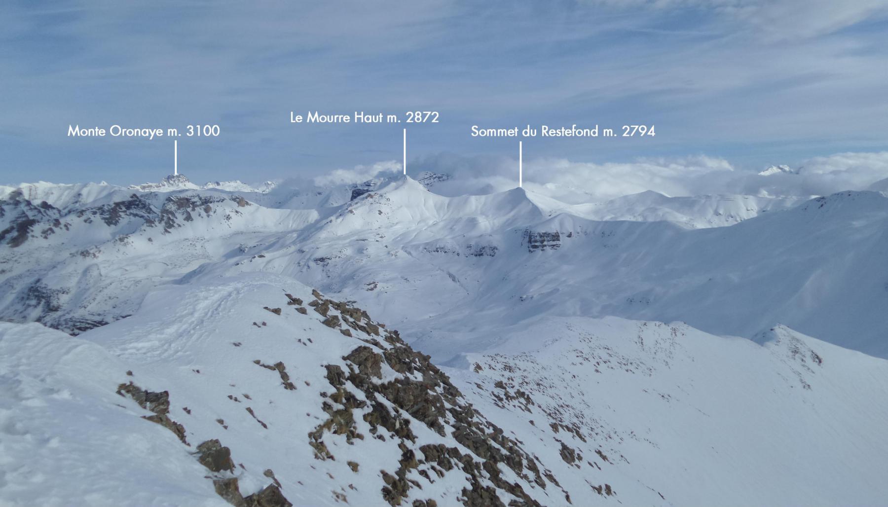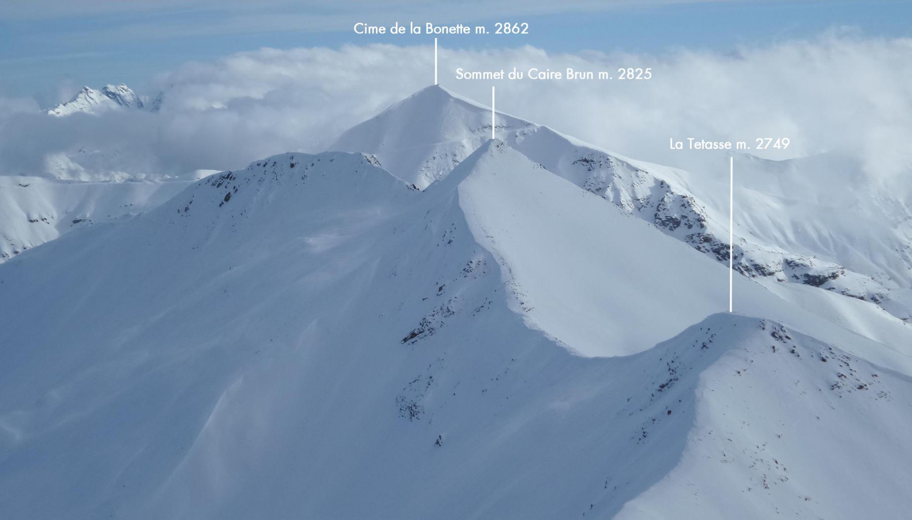 Oggi le previsioni meteo non erano propriamente esaltanti per molte zone del Nord Italia, una delle poche zone con meteo discreto sembrava la parte alta della Valle Stura e della Valle Ubaye! Memore della gran bella salita fatta al Mourre Haut quest’anno, mi sono venute in mente due possibili gite! Proposte le due cime ai mie soci, loro hanno accettato con entusiasmo la mia idea, quindi siamo partiti decisi e motivati come è giusto essere, altrimenti è meglio rimanere a casa! Certo che nella parte bassa della Valle Stura di Demonte il cielo ancora nuvoloso non sembrava confortare la nostra scelta…però man mano che si saliva verso il Colle della Maddalena finalmente ampie schiarite, cielo quasi sereno e sole!! Vuoi vedere che abbiamo visto giusto a venire da queste parti?! Arrivati al Pont de la Combette, ci siamo resi conto che in Ubaye c’era molta meno neve rispetto alle Valle Stura, infatti con l’auto ci siamo portati a quota 2150 m. Parcheggiata l’auto, oltre a noi erano presente almeno 30 scialpinisti francesi, divisi tra le Mourre Haut, le Trois Serrieres e le Sommet du Caire Brun e qualcuno anche sul Chevalier. Siamo saliti lungo la stradina ben innevata, seguendo un traccione ben battuto dai numerosi passaggi precedenti, arrivando fino alla conca terminale del Vallon de Clapouse, dove abbiamo piegato a destra entrando nel Vallon du Chevalier, trovando neve in buone condizioni, generalmente compatta e portante, solo in qualche tratto c’era neve ventata su un fondo duro, seguendo la traccia di 4 scialpinisti che sono saliti prima di noi, con una bella serie di serpentine abbiamo superato il ripido pendio che ci ha condotti al Pas de Toureis. Dal colle in avanti ha fatto la sua comparsa il vento, ma senza essere davvero fastidioso come in altre occasioni. Dopo una breve pausa al colle per guardarci intorno e fare qualche foto (visibilità ottima e giornata davvero notevole, decisamente una piacevole sorpresa!!) ripresa la salita lungo la bella cresta, il tratto più piacevole e divertente della salita, siamo arrivati con le ciaspole ai piedi fino alla base del tratto finale, dove il terreno diventa più stretto e affilato. Calzati i ramponi abbiamo superato un tratto davvero interessante arriviamo in vetta alla Cima NE a quota 2804 m. trovando l’ometto di vetta in buona parte sommerso dalla neve. Valutando con attenzione il tratto finale per raggiungere la Cima SE (la più alta), di neve non altrettanto buona e sicura come quella trovata per salire fin qui, vedendo una placca gonfia di neve ventata e non particolarmente sicura, oltre al fatto di avere una sola piccozza e senza uno spezzone di corda per fare qualche possibile sicura, dopo una rapida consultazione con i soci, per prudenza abbiamo deciso, di comune accordo, di non osare per stavolta. Ci siamo trattenuti in vetta per 1 ora buona, il vento era calato e la temperatura non era troppo rigida, cielo quasi sereno e visibilità ottima! Panorama vastissimo sulle Marittime francesi (dall’Enchastraya, alla Bonette, al Pelat, alla Seolane, per passare alle Cozie Meridionali con il Gruppo Sautron-Nubiera-Chambeyron, oltre ai più vicini Meyna e Oronaye) e a chiudere l’orizzonte i lontani gruppi degli Ecrins e Pelvoux….niente male per una giornata che era annunciata come molto variabile vero?! Certo, essendo alpinisti era forte il desiderio di proseguire fino alla cima principale ma oggi non era il caso, e a volte è bene sapersi accontentare piuttosto che andare a cercarsi delle rogne con il lanternino e correre rischi inutili. E’ stata una gran bella gita, di piena soddisfazione, da leccarsi baffi aver salito una bella cima di questo genere al 13 dicembre! Scesi con i ramponi ai piedi fino al pendio sottostante il Col des Toureis, da qui nuovamente con le ciaspole ai piedi su neve buona e senza mai sfondare fino a rientrare al parcheggio. Torneremo ancora da queste parti per salire anche un’altra bella cima in questo vallone!