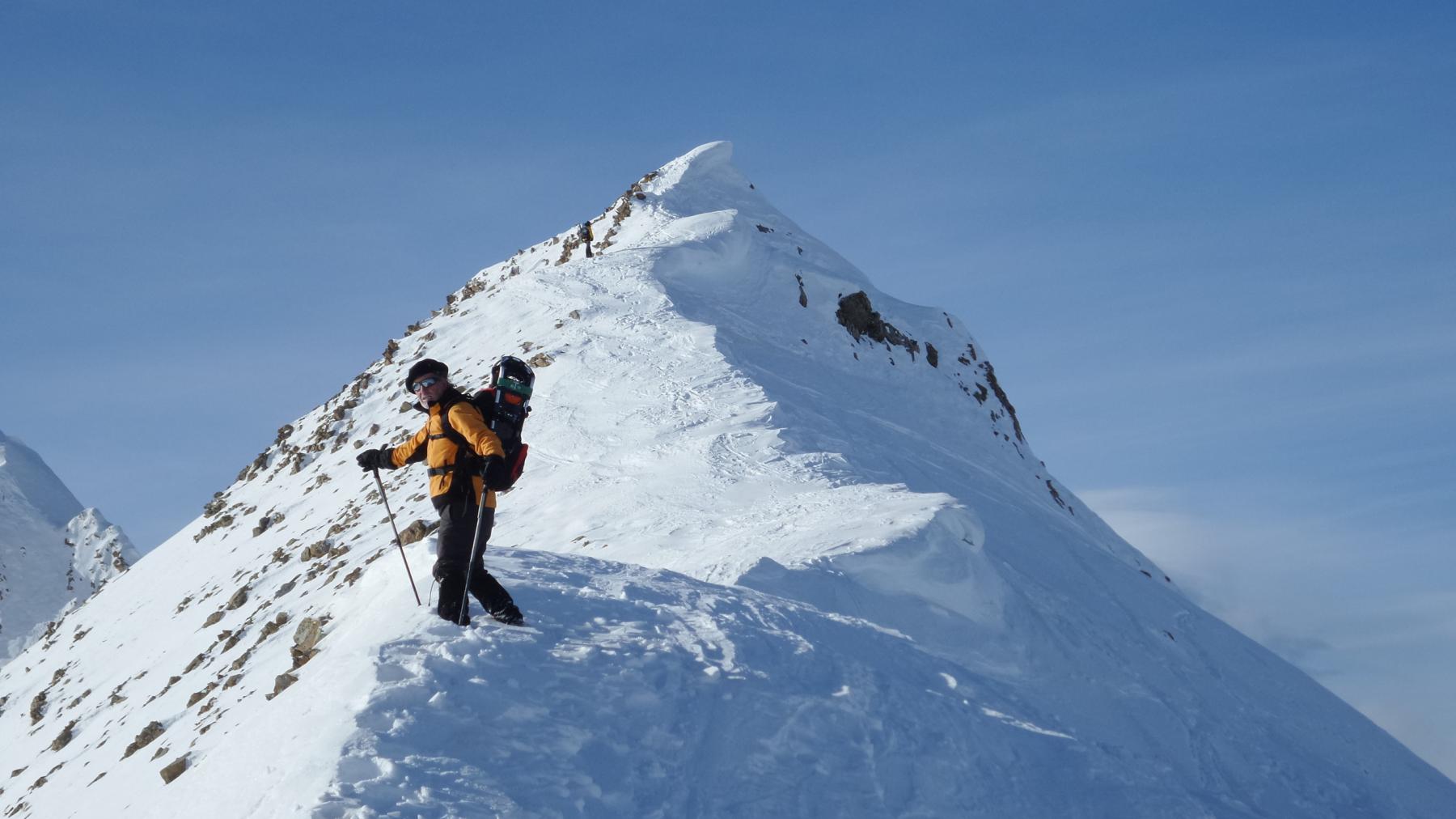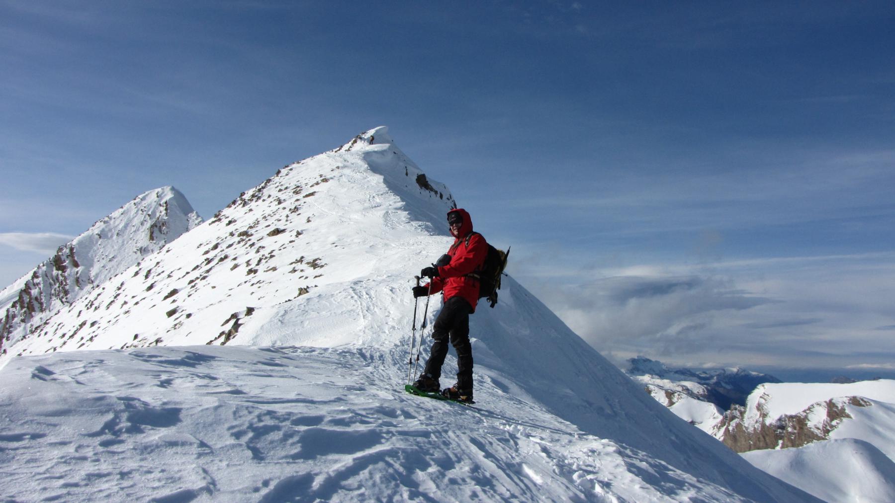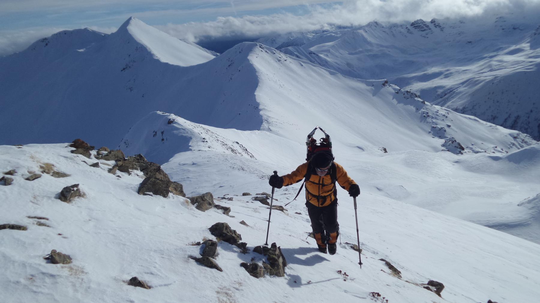 Oggi le previsioni meteo non erano propriamente esaltanti per molte zone del Nord Italia, una delle poche zone con meteo discreto sembrava la parte alta della Valle Stura e della Valle Ubaye! Memore della gran bella salita fatta al Mourre Haut quest’anno, mi sono venute in mente due possibili gite! Proposte le due cime ai mie soci, loro hanno accettato con entusiasmo la mia idea, quindi siamo partiti decisi e motivati come è giusto essere, altrimenti è meglio rimanere a casa! Certo che nella parte bassa della Valle Stura di Demonte il cielo ancora nuvoloso non sembrava confortare la nostra scelta…però man mano che si saliva verso il Colle della Maddalena finalmente ampie schiarite, cielo quasi sereno e sole!! Vuoi vedere che abbiamo visto giusto a venire da queste parti?! Arrivati al Pont de la Combette, ci siamo resi conto che in Ubaye c’era molta meno neve rispetto alle Valle Stura, infatti con l’auto ci siamo portati a quota 2150 m. Parcheggiata l’auto, oltre a noi erano presente almeno 30 scialpinisti francesi, divisi tra le Mourre Haut, le Trois Serrieres e le Sommet du Caire Brun e qualcuno anche sul Chevalier. Siamo saliti lungo la stradina ben innevata, seguendo un traccione ben battuto dai numerosi passaggi precedenti, arrivando fino alla conca terminale del Vallon de Clapouse, dove abbiamo piegato a destra entrando nel Vallon du Chevalier, trovando neve in buone condizioni, generalmente compatta e portante, solo in qualche tratto c’era neve ventata su un fondo duro, seguendo la traccia di 4 scialpinisti che sono saliti prima di noi, con una bella serie di serpentine abbiamo superato il ripido pendio che ci ha condotti al Pas de Toureis. Dal colle in avanti ha fatto la sua comparsa il vento, ma senza essere davvero fastidioso come in altre occasioni. Dopo una breve pausa al colle per guardarci intorno e fare qualche foto (visibilità ottima e giornata davvero notevole, decisamente una piacevole sorpresa!!) ripresa la salita lungo la bella cresta, il tratto più piacevole e divertente della salita, siamo arrivati con le ciaspole ai piedi fino alla base del tratto finale, dove il terreno diventa più stretto e affilato. Calzati i ramponi abbiamo superato un tratto davvero interessante arriviamo in vetta alla Cima NE a quota 2804 m. trovando l’ometto di vetta in buona parte sommerso dalla neve. Valutando con attenzione il tratto finale per raggiungere la Cima SE (la più alta), di neve non altrettanto buona e sicura come quella trovata per salire fin qui, vedendo una placca gonfia di neve ventata e non particolarmente sicura, oltre al fatto di avere una sola piccozza e senza uno spezzone di corda per fare qualche possibile sicura, dopo una rapida consultazione con i soci, per prudenza abbiamo deciso, di comune accordo, di non osare per stavolta. Ci siamo trattenuti in vetta per 1 ora buona, il vento era calato e la temperatura non era troppo rigida, cielo quasi sereno e visibilità ottima! Panorama vastissimo sulle Marittime francesi (dall’Enchastraya, alla Bonette, al Pelat, alla Seolane, per passare alle Cozie Meridionali con il Gruppo Sautron-Nubiera-Chambeyron, oltre ai più vicini Meyna e Oronaye) e a chiudere l’orizzonte i lontani gruppi degli Ecrins e Pelvoux….niente male per una giornata che era annunciata come molto variabile vero?! Certo, essendo alpinisti era forte il desiderio di proseguire fino alla cima principale ma oggi non era il caso, e a volte è bene sapersi accontentare piuttosto che andare a cercarsi delle rogne con il lanternino e correre rischi inutili. E’ stata una gran bella gita, di piena soddisfazione, da leccarsi baffi aver salito una bella cima di questo genere al 13 dicembre! Scesi con i ramponi ai piedi fino al pendio sottostante il Col des Toureis, da qui nuovamente con le ciaspole ai piedi su neve buona e senza mai sfondare fino a rientrare al parcheggio. Torneremo ancora da queste parti per salire anche un’altra bella cima in questo vallone!