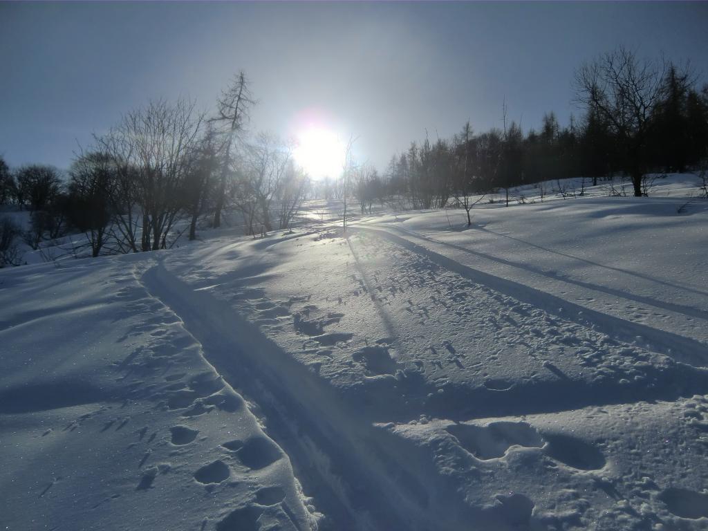 Tempo spettacoloso, con foschie basse. Neve polverosa praticamente su tutto il percorso; solo negli ultimi metri in basso inizia ad appesantirsi e trasformarsi. Necessaria breve risalita al termine della discesa.