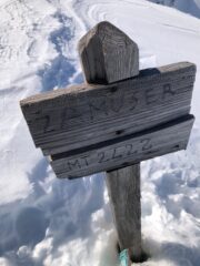 Il modesto ( anzi quasi nullo )rigelo notturno ha permesso di salire le vecchie tracce senza rampant ed arrivare poco sotto la vetta con sci ai piedi ( a piotte ultimi 10-15 metri dislivello ).