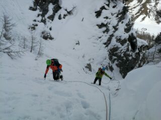 Viste le temperature elevate (+3/+4 per tutto il giorno) e i rialzi dei giorni precedenti abbiamo optato per questa cascata molto incassata e non troppo verticale. Segnalo solo che il fittone inferiore di S2 è un po’ “ballerino” ma quello superiore è bomb-proof” :). Molta neve nei trasferimenti, ma ora è tutto ben tracciato.