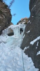 Cascata nel complesso ancora in ottime condizioni. I canali hanno scaricato, quindi la si fa in sicurezza. Primo saltino sulla dx ancora abbondante, per il primo muro abbiamo scelto la linea di sx (più lunga e un po’ più dritta), anche quella comunque già segnata da milioni di passaggi. Ultimo muro ancora carino, con l’uscita un po’ sottile e spaccosa, però tutto ben proteggibile.
