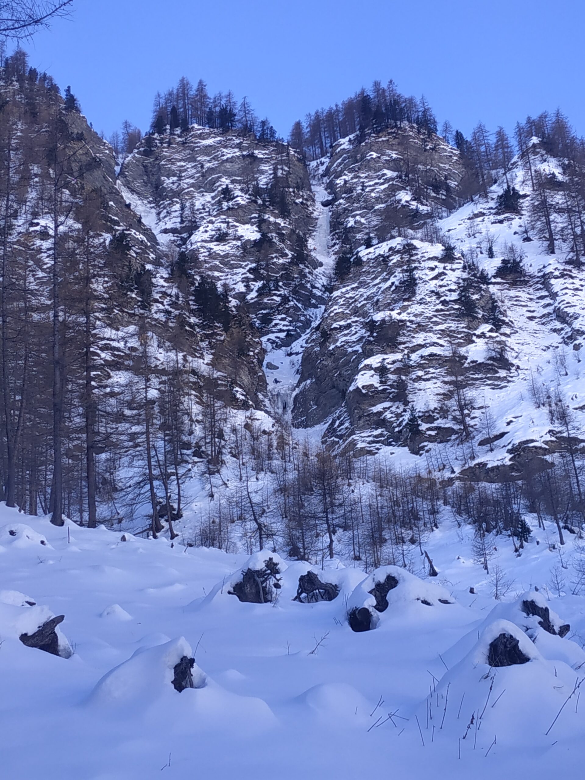 Cascate sufficientemente formate per la scalata, ma non ancora “gonfie”. Soste con catena: ok. Anche la traccia per la discesa a piedi è ben evidente. Parecchia neve sfondosa nei tratti non ghiacciati.