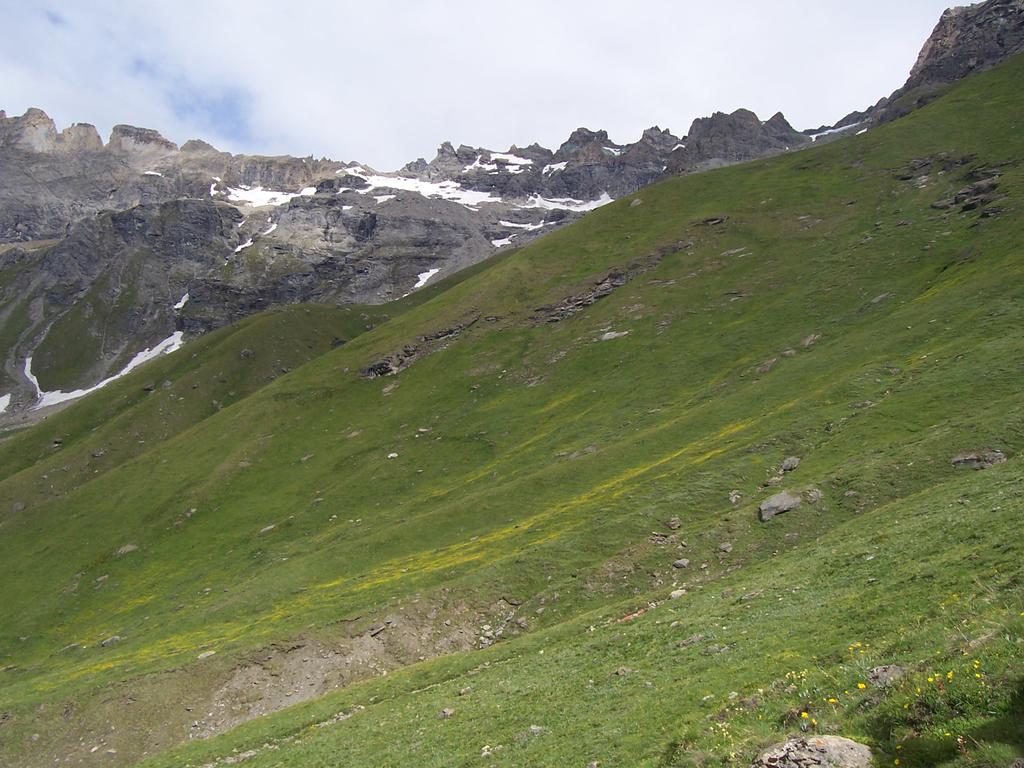 Proseguire in piano attraversando la conca fino all’Alpe di By 2050 m, dove attraversata la pista sterrata il sentiero inizia ad inerpicarsi risalendo per pascoli in diagonale fino agli alpeggi ristrutturati di Tsa Commune 2304 m dove si trova l’ultima possibilità di rifornirsi d’acqua prima del rifugio.