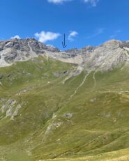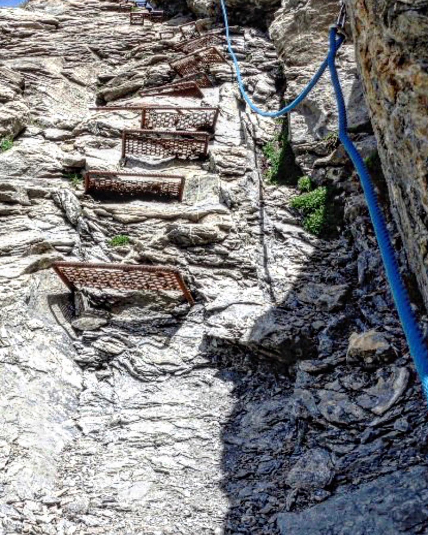 Con un lungo diagonale ascendente il tracciato attraversa due ruscelli ancora nella fascia erbosa, che via via lascia spazio ad un terreno più terroso e detritico. Nella parte superiore del sentiero si sale in maniera più diretta all’interno di una sorta di canalone che culmina con una strettoia dove incontriamo il tratto attrezzato con dei cavi e degli scalini, che facilitano la risalita di una placca rocciosa.