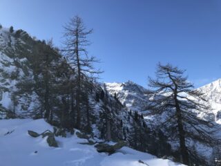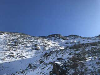La parte mediana della gita presenta abbondanza di neve e il percorso attualmente non è battuto. Abbiamo faticosamente tracciato tutta la risalita fino all’imbocco del canalone, ma qui giunti, la temperatura davvero rigida e la neve farinosa e sfondosa ci ha fatto desistere dall’impresa.