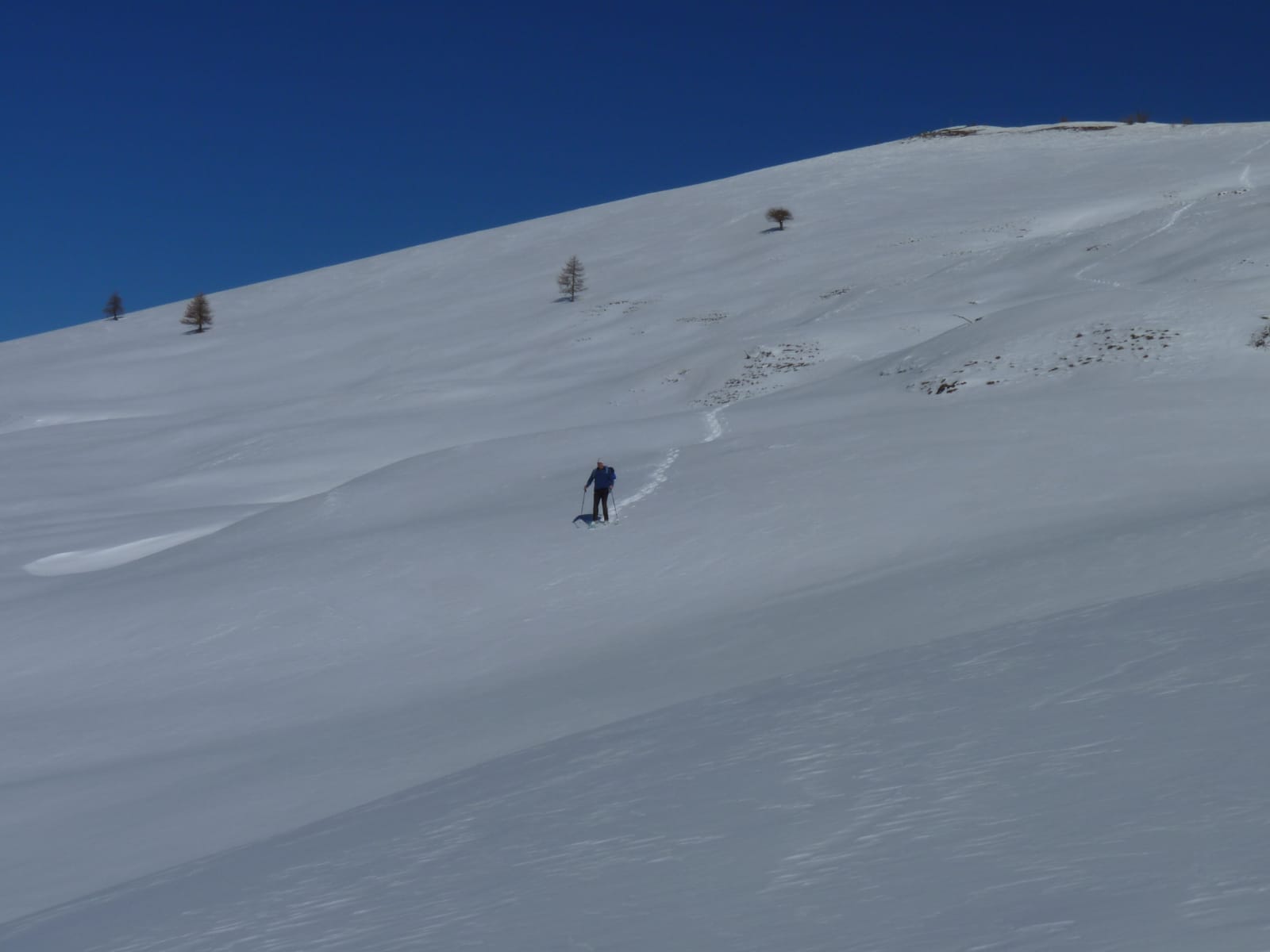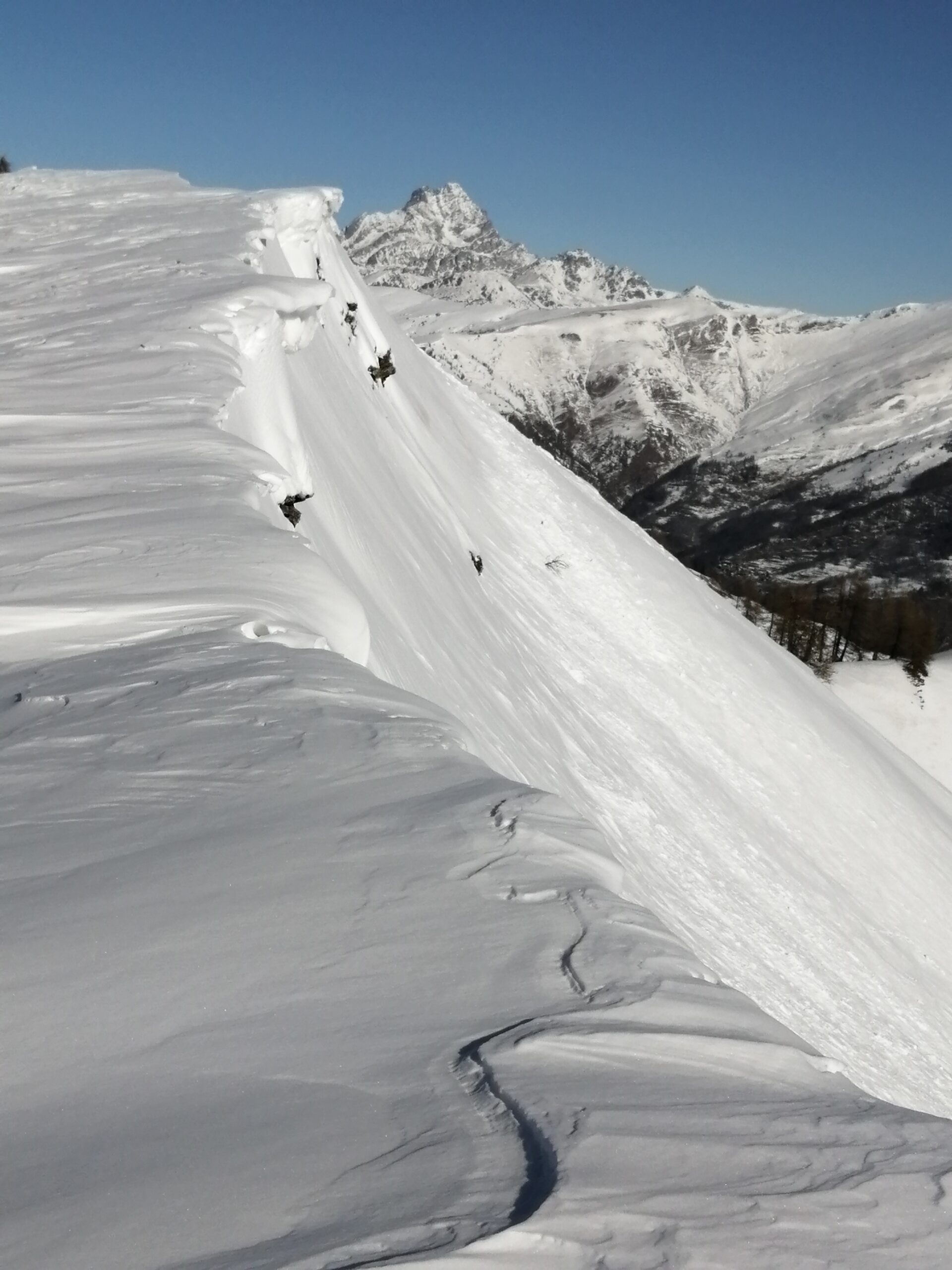 Ottima traccia ricoperta da 5/10 centimetri di farina recente. Passati dal versante Monte Festa, ma senza arrivare al Colle saliti in cresta sul dritto e percorsa la dorsale fino su Costa Chiggia su bella farina, qui è la ventata con alcuni punti spazzolati dal vento. Discesa divertentissima a cercare la farina. Meteo e panorami da spettacolo, 5 stelle quasi che non bastano.