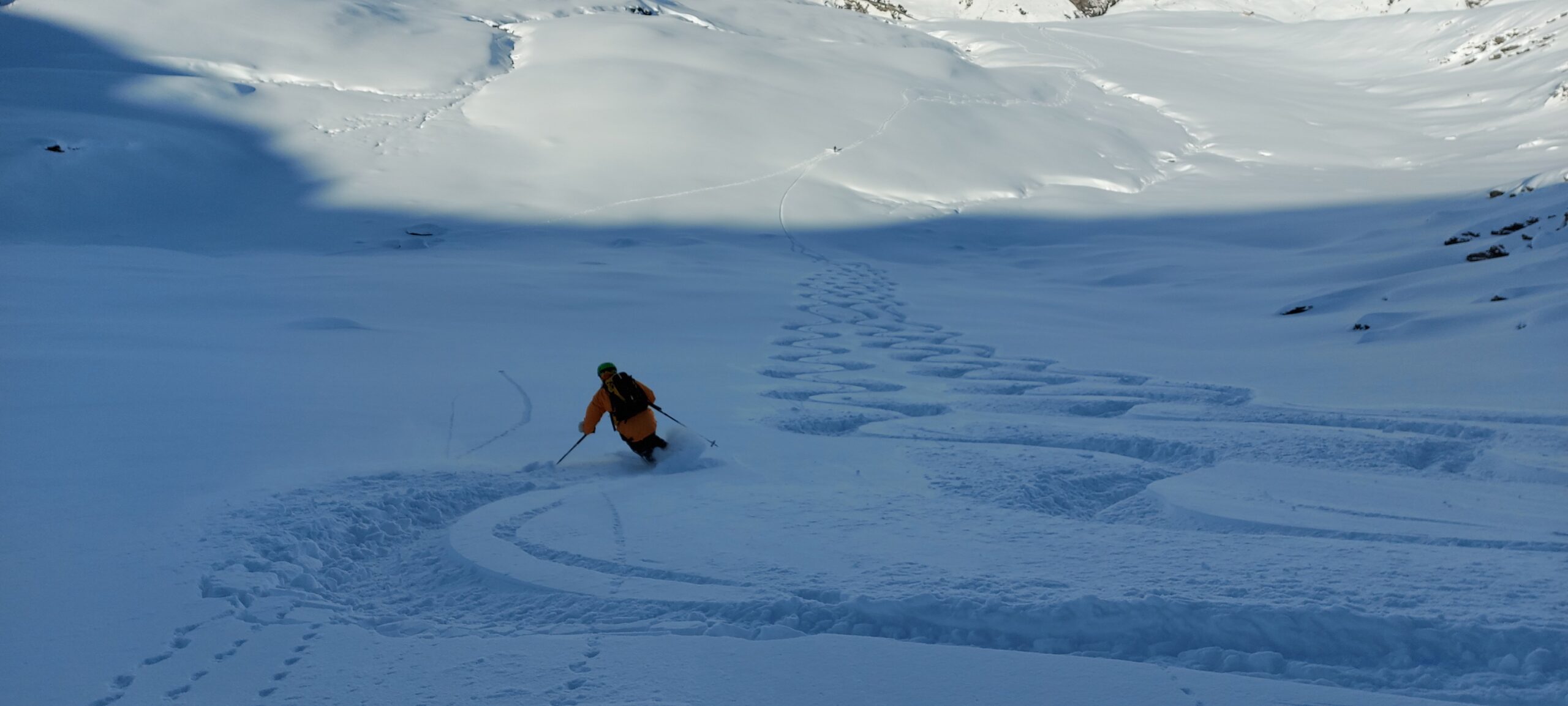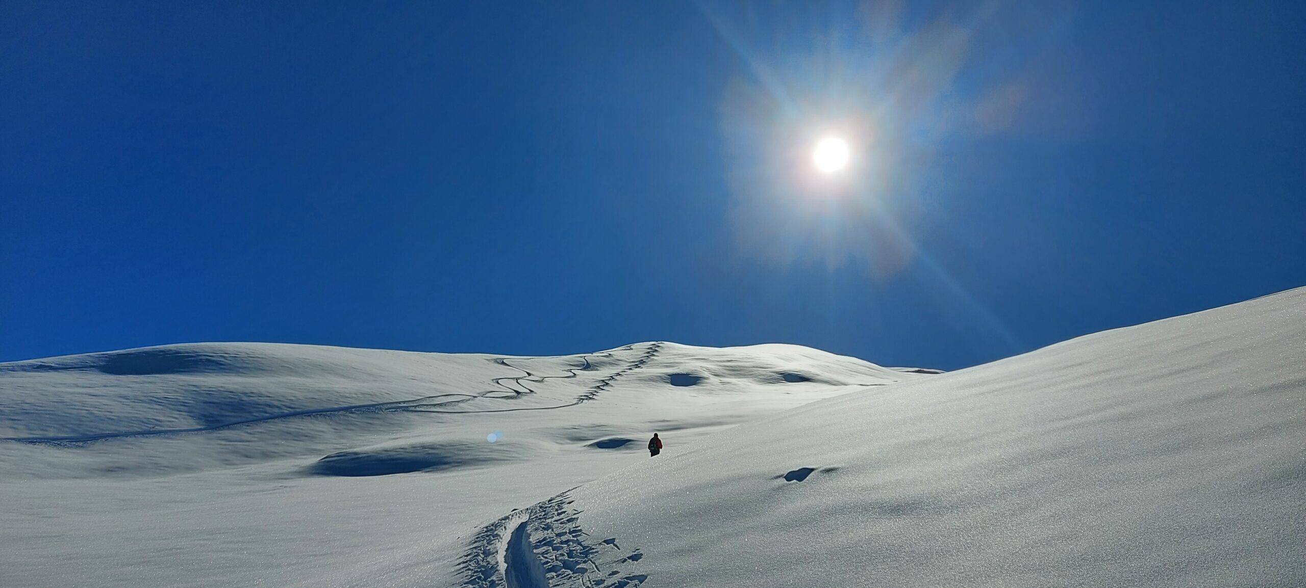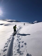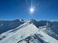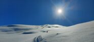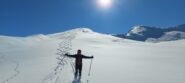 Dalla cima si scende dritti dal bel pendio poi invece di seguire il costone si svolta a sinistra sui bei pendii fino a ricollegarsi alla casetta in legno.