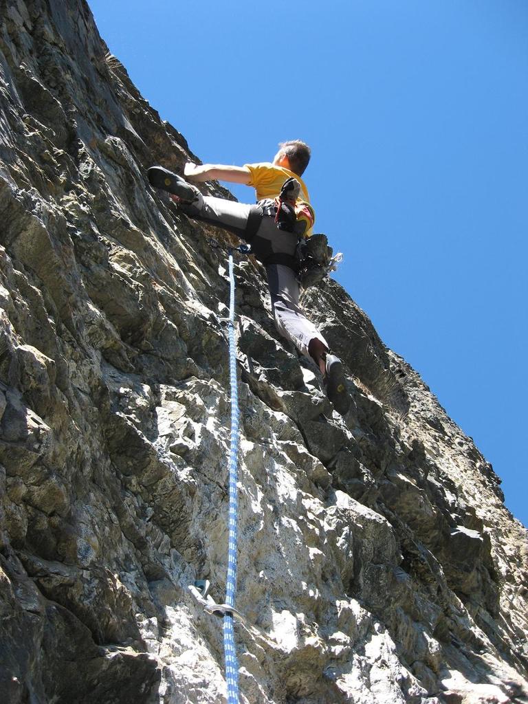 L4:6a seguire in Dulfer verso sx una fessura strapiombante,poi uscire a dx dove si sosta.