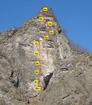 La via(230m) supera la parete nel centro nel punto piu’ logico su parete strapiombante e verticale,su roccia decisamente buona.arrampicata impegnativa,molto esposta di grande soddisfazione