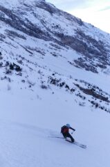 Partiti sci ai piedi dal campeggio di Fraisse, abbiamo seguito la pista/sentiero fino alla baita di Ambrogio. Poi risaliti i ripidi pendii a sinistra del vallone, su neve in parte trasformata e ventata, che teneva bene anche senza coltelli. Partiti sci ai piedi dalla vetta, con un po’ di attenzione nei primi metri con poca copertura nevosa, per poi lanciarci al centro del vallone su ottima neve farinosa, a tratti parzialmente ventata, ma comunque fantastica. Scesi nel bosco passando a destra della baita, su neve molto pesante a causa della temperatura elevata. Guado finale del torrente Chisone per evitare l’andata/ritorno dal ponte.
