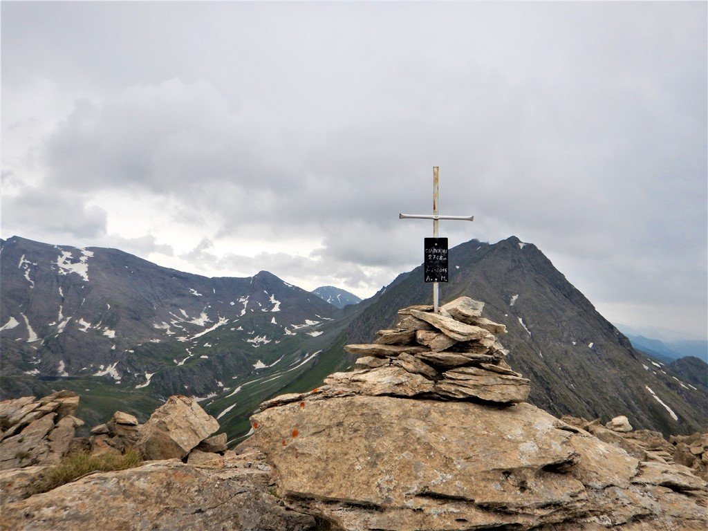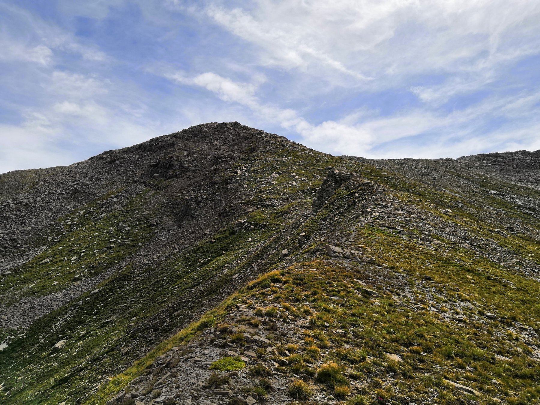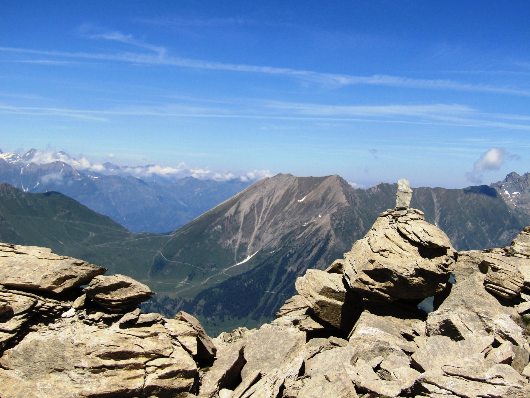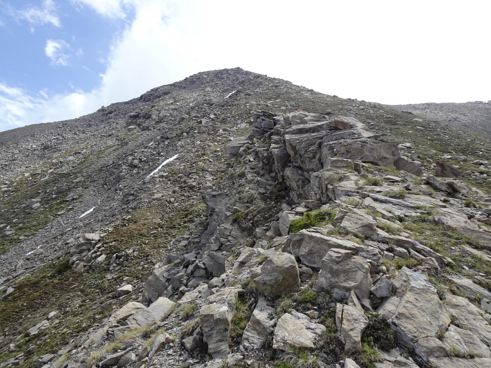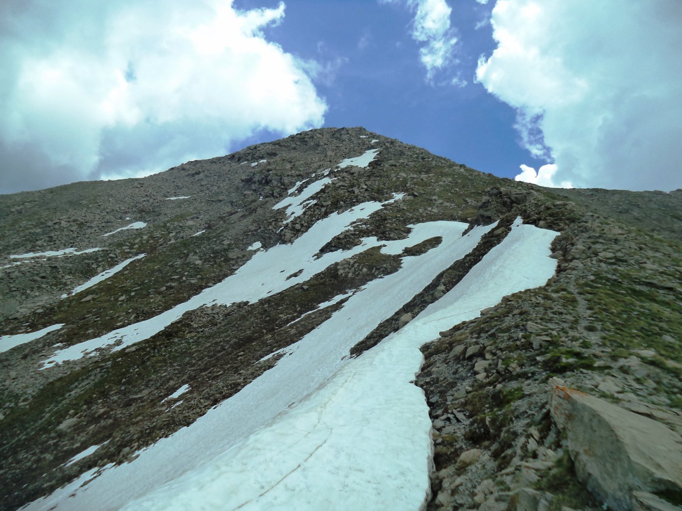 Arrivati nel pianoro erboso della baita andare in direzione della fontana Zalaveja (acqua e tavolo pic-nic) e prendere la tracciolina di sentiero che parte sulla dx (bolli blu). Dopo un breve traverso si devia a sx (freccia e bollo blu, la traccia che prosegue diritta poco dopo muore nei prati) e si risalgono gli erti pendii erbosi e un breve traverso su detrito, che porta al caratteristico colletto a q.2500m circa. Di lì si segue la cresta NW, ora rocciosa ma tutta camminabile, che in breve porta in vetta (croce e diario). Ottimo panorama e versante a picco dal lato Laux.