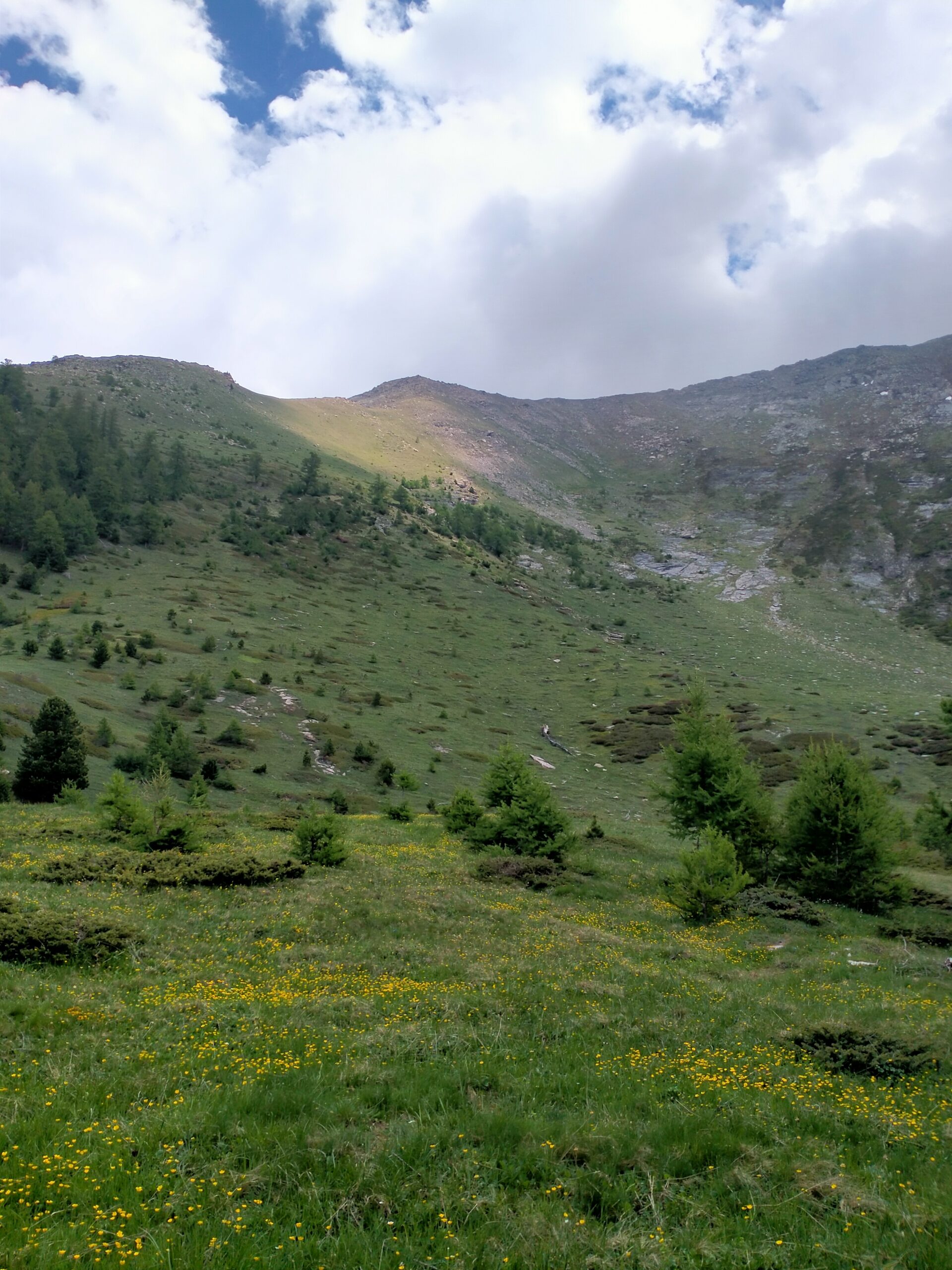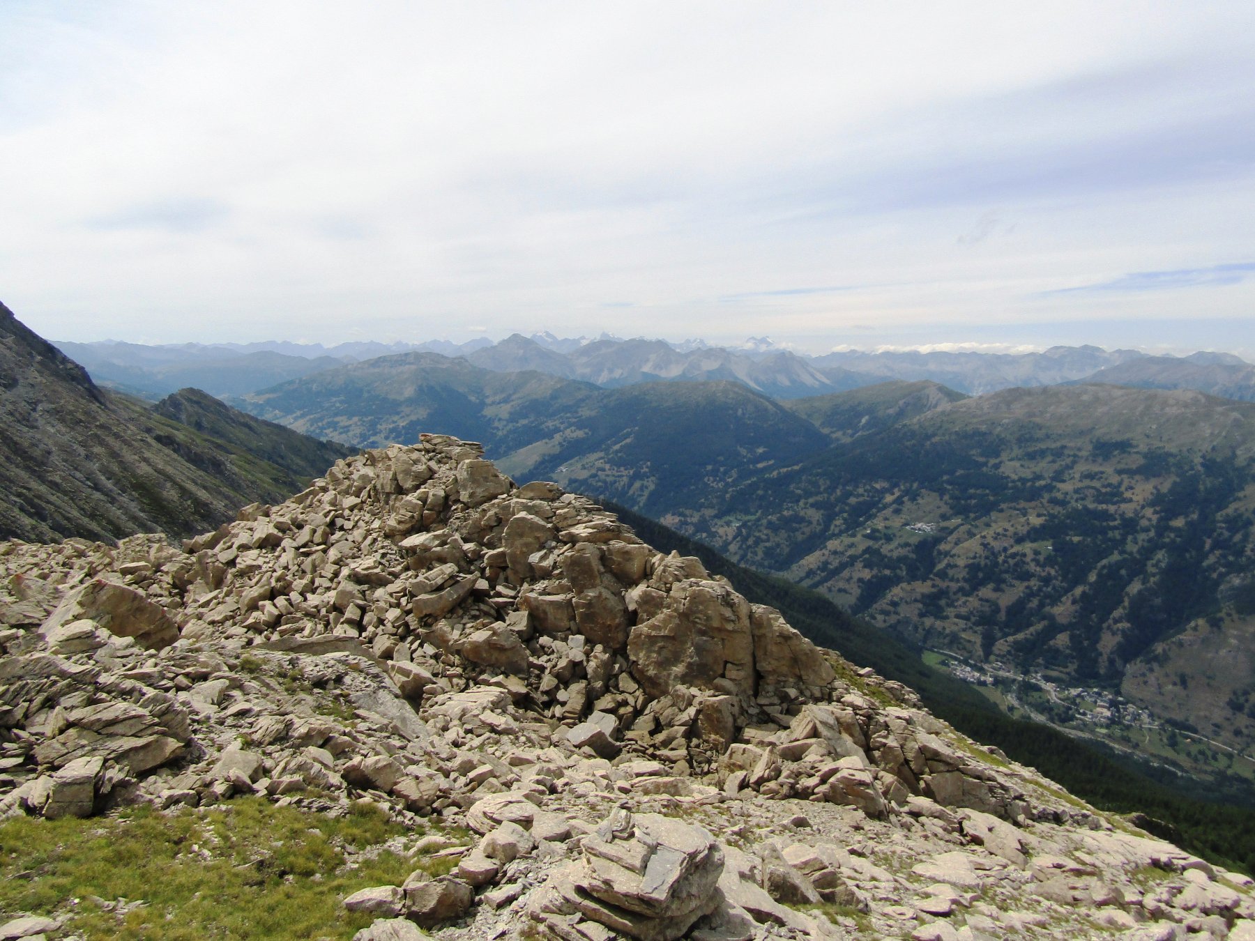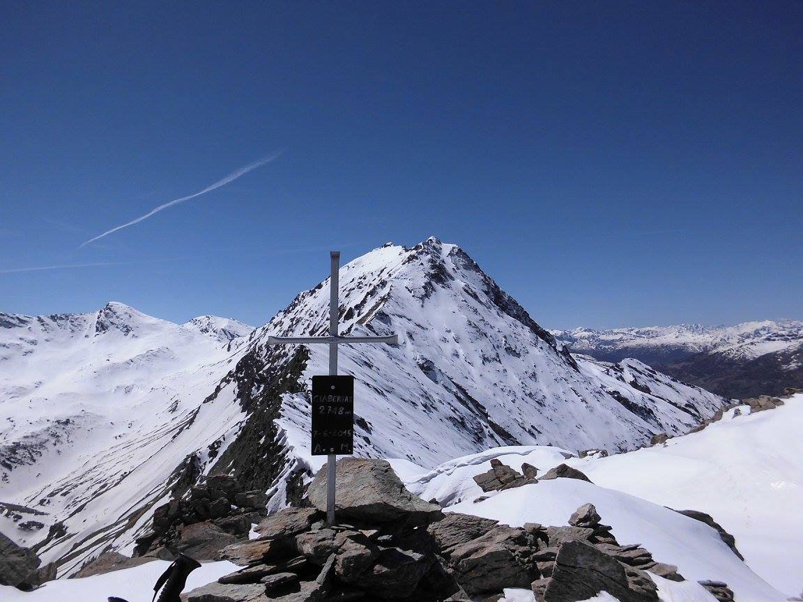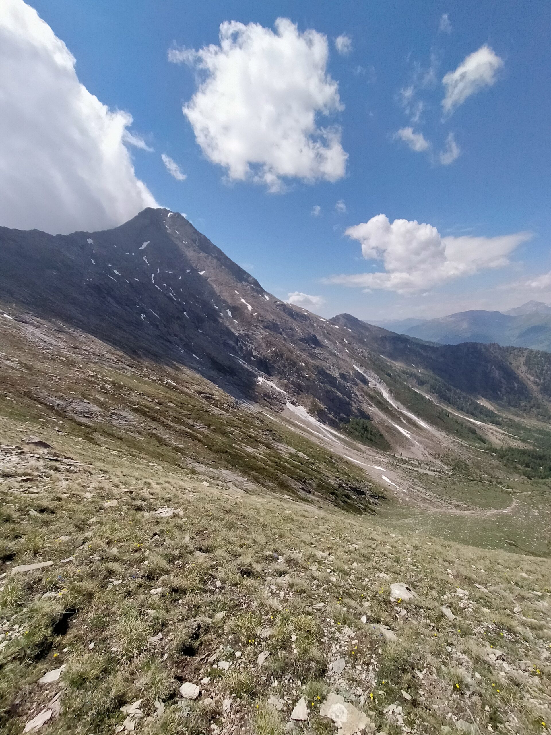 Arrivati nel pianoro erboso della baita andare in direzione della fontana Zalaveja (acqua e tavolo pic-nic) e prendere la tracciolina di sentiero che parte sulla dx (bolli blu). Dopo un breve traverso si devia a sx (freccia e bollo blu, la traccia che prosegue diritta poco dopo muore nei prati) e si risalgono gli erti pendii erbosi e un breve traverso su detrito, che porta al caratteristico colletto a q.2500m circa. Di lì si segue la cresta NW, ora rocciosa ma tutta camminabile, che in breve porta in vetta (croce e diario). Ottimo panorama e versante a picco dal lato Laux.