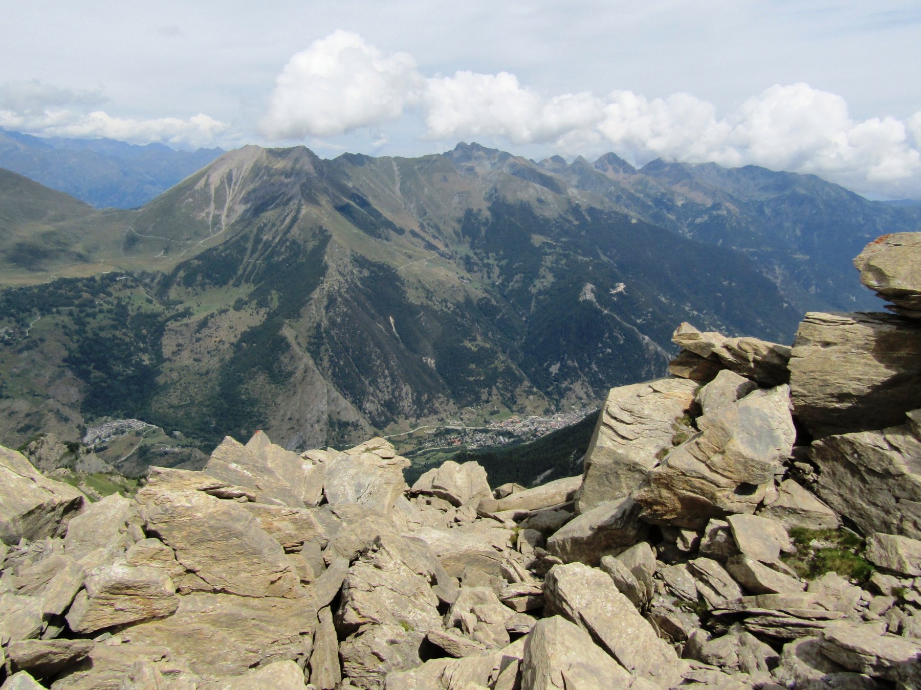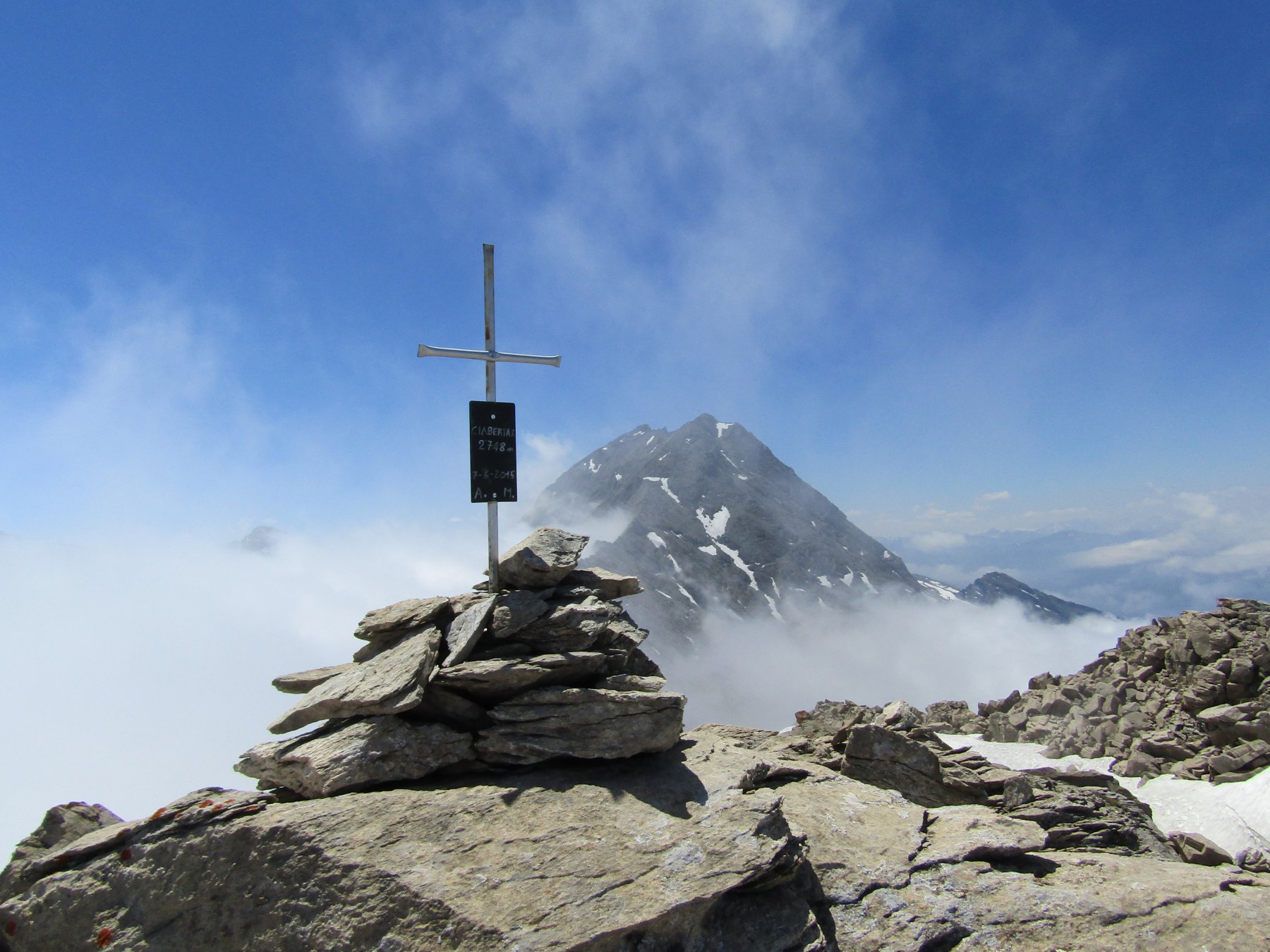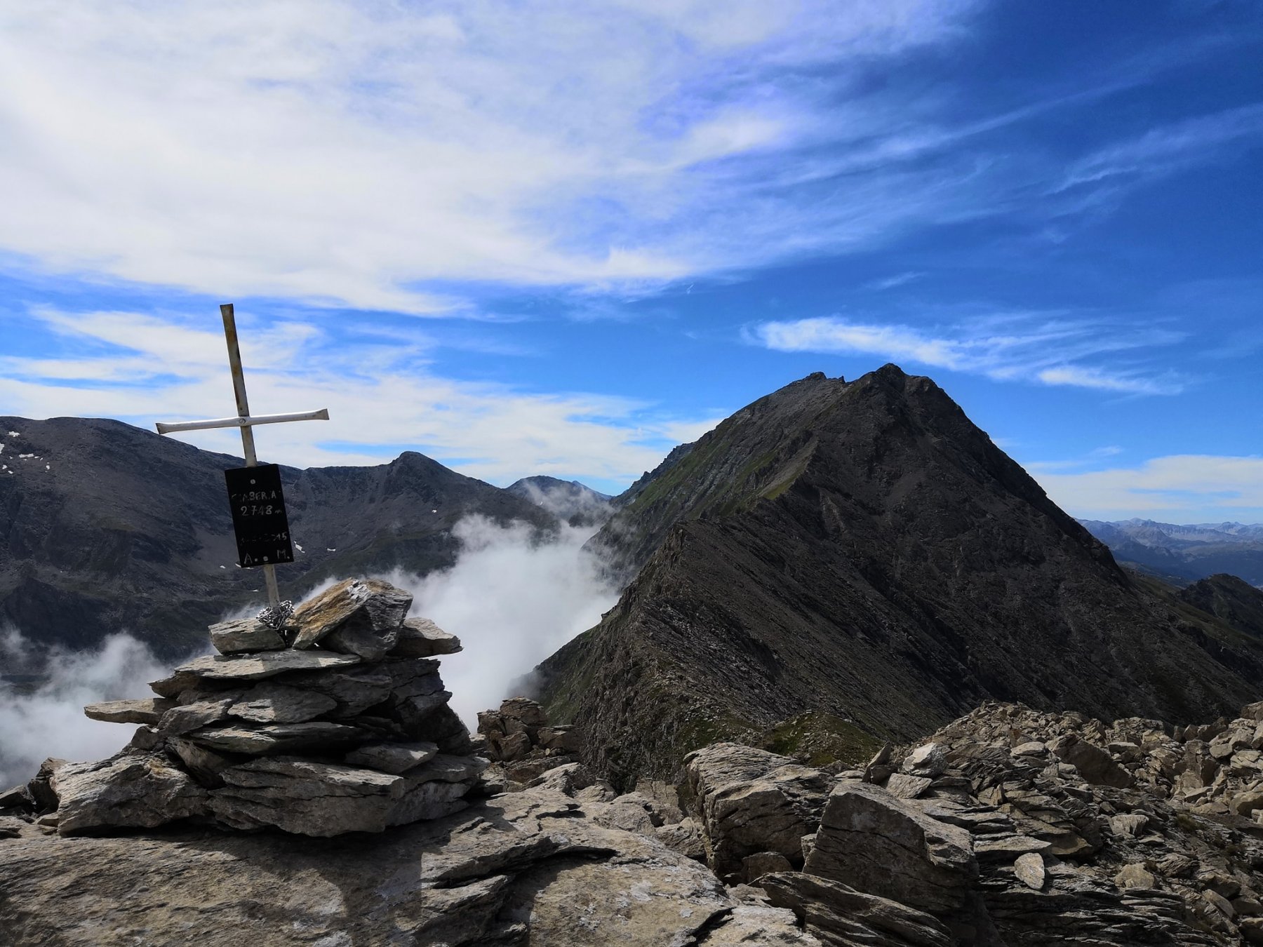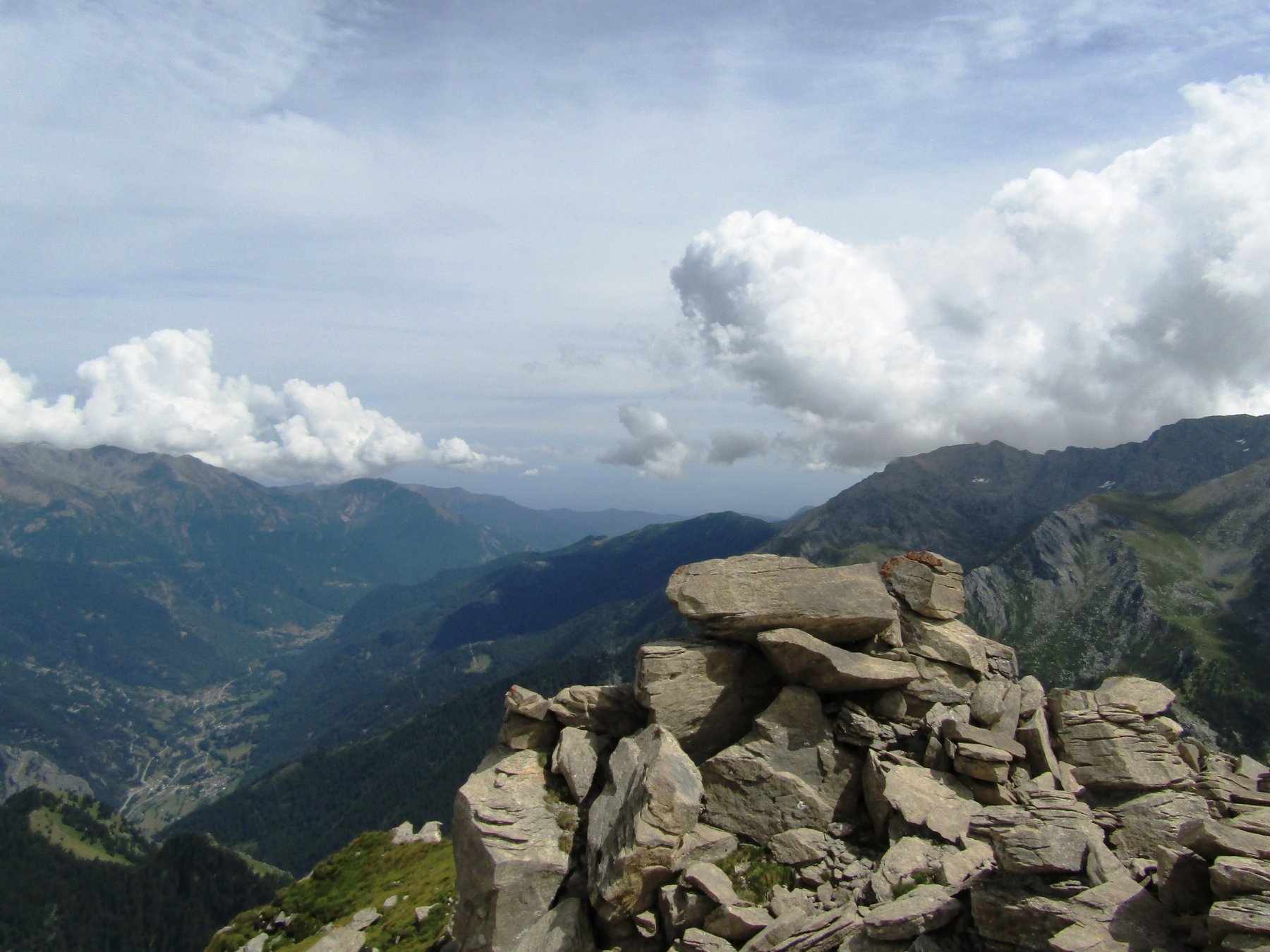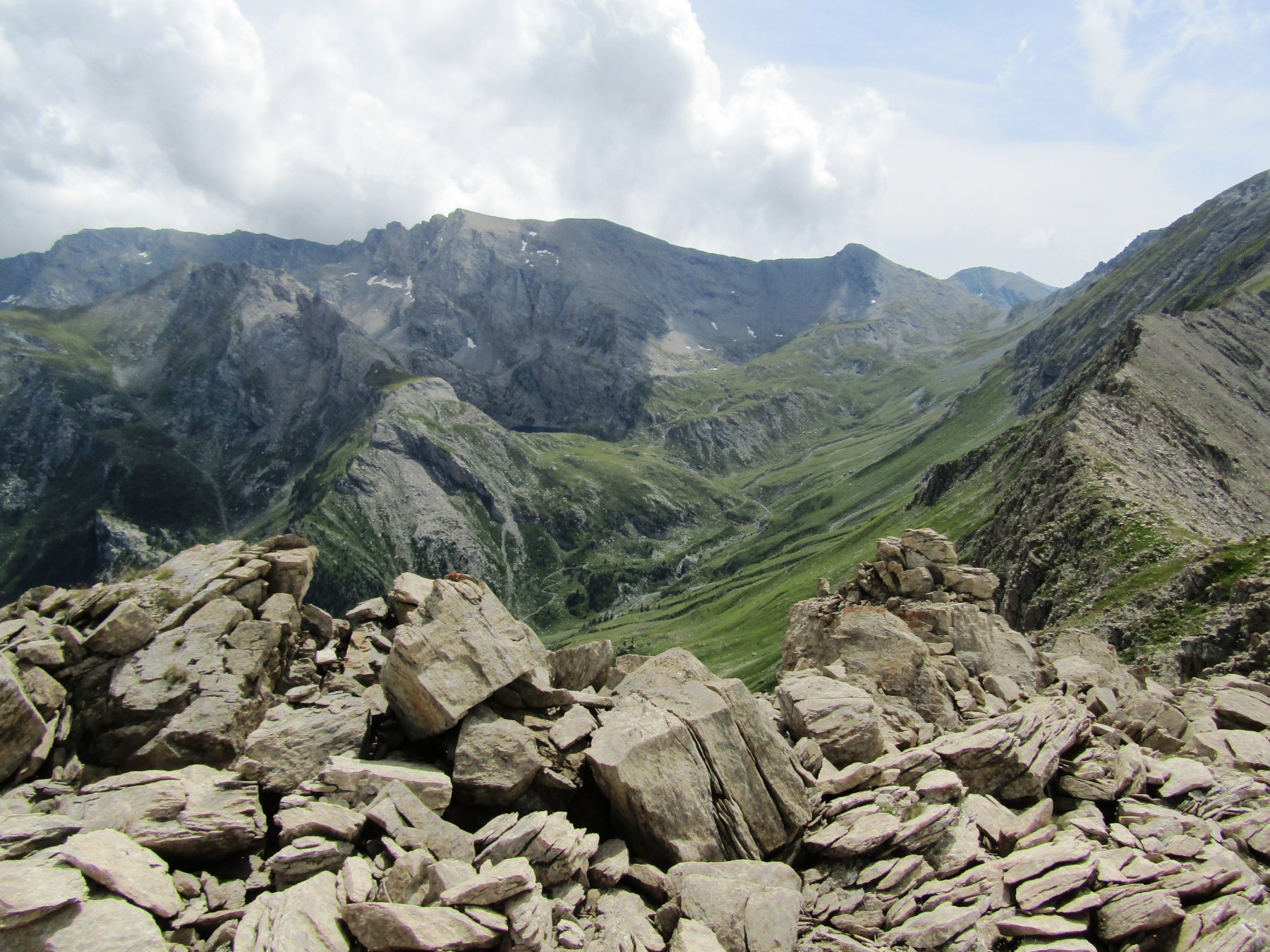 Arrivati nel pianoro erboso della baita andare in direzione della fontana Zalaveja (acqua e tavolo pic-nic) e prendere la tracciolina di sentiero che parte sulla dx (bolli blu). Dopo un breve traverso si devia a sx (freccia e bollo blu, la traccia che prosegue diritta poco dopo muore nei prati) e si risalgono gli erti pendii erbosi e un breve traverso su detrito, che porta al caratteristico colletto a q.2500m circa. Di lì si segue la cresta NW, ora rocciosa ma tutta camminabile, che in breve porta in vetta (croce e diario). Ottimo panorama e versante a picco dal lato Laux.
