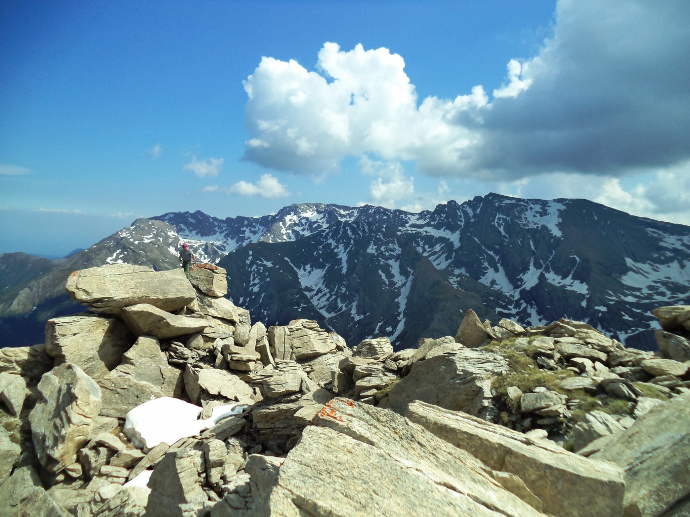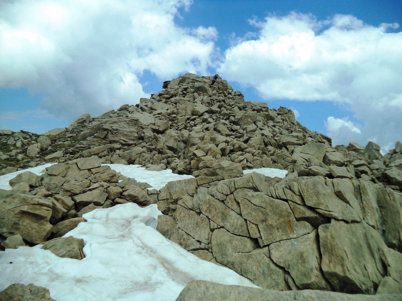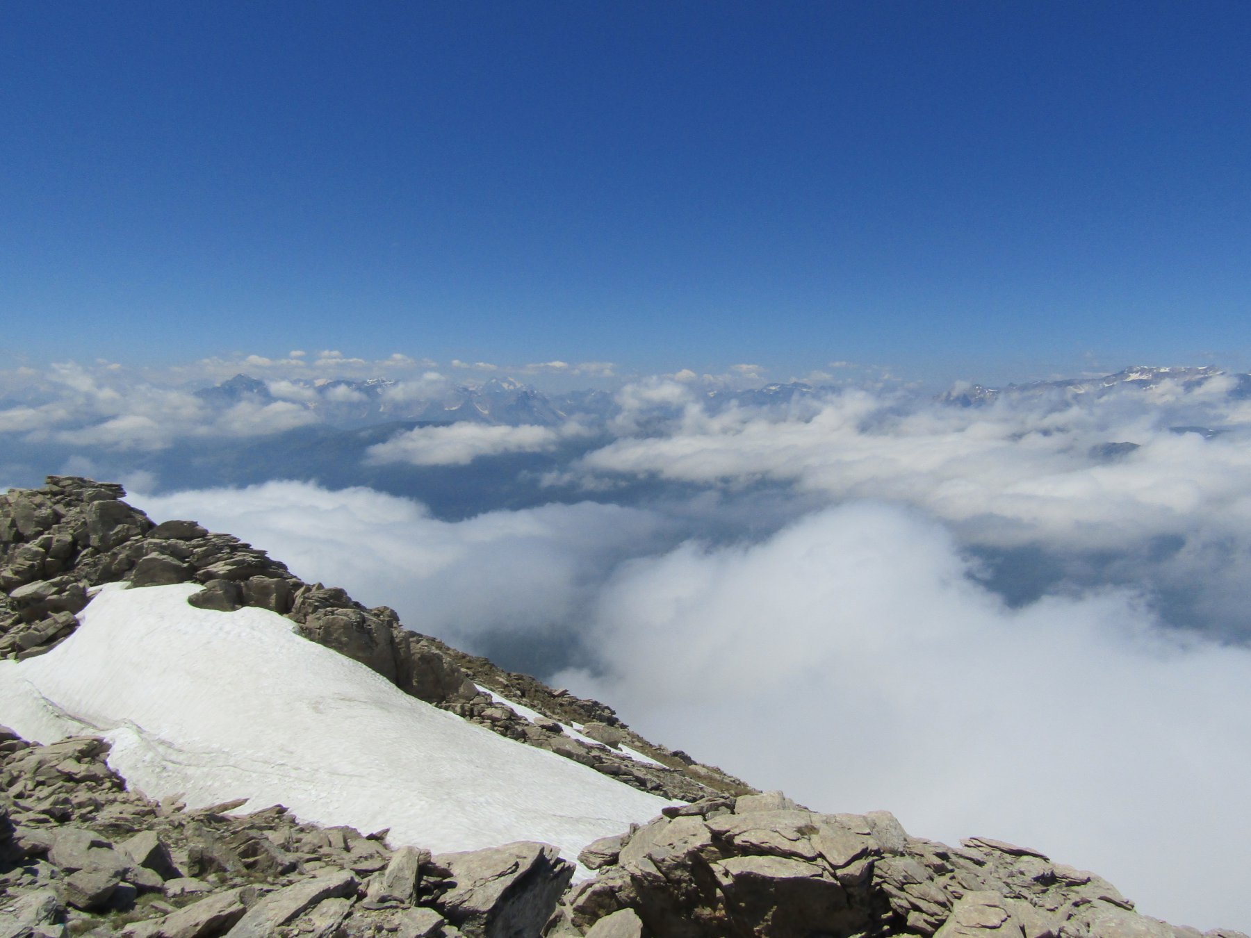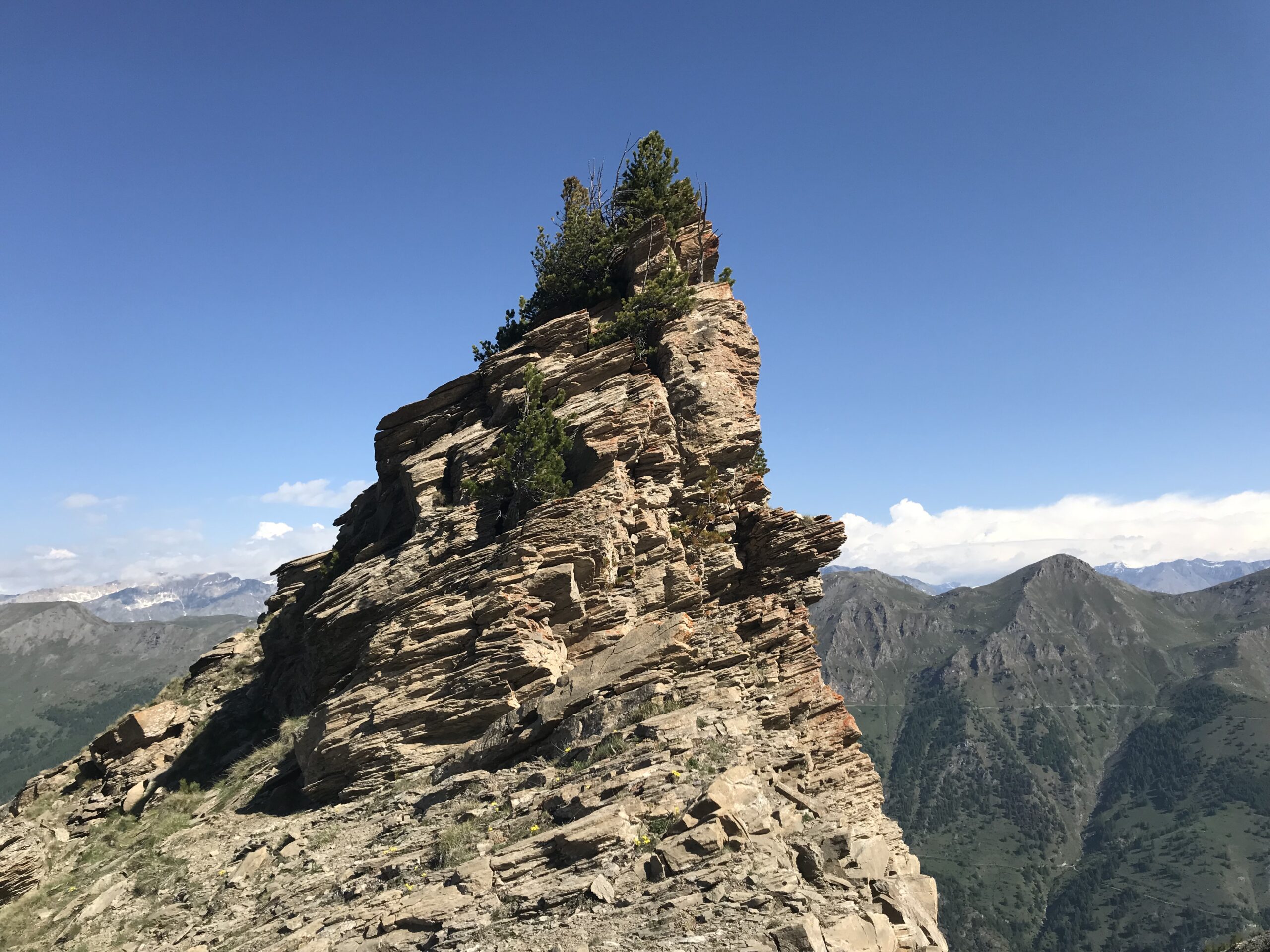 Arrivati nel pianoro erboso della baita andare in direzione della fontana Zalaveja (acqua e tavolo pic-nic) e prendere la tracciolina di sentiero che parte sulla dx (bolli blu). Dopo un breve traverso si devia a sx (freccia e bollo blu, la traccia che prosegue diritta poco dopo muore nei prati) e si risalgono gli erti pendii erbosi e un breve traverso su detrito, che porta al caratteristico colletto a q.2500m circa. Di lì si segue la cresta NW, ora rocciosa ma tutta camminabile, che in breve porta in vetta (croce e diario). Ottimo panorama e versante a picco dal lato Laux.