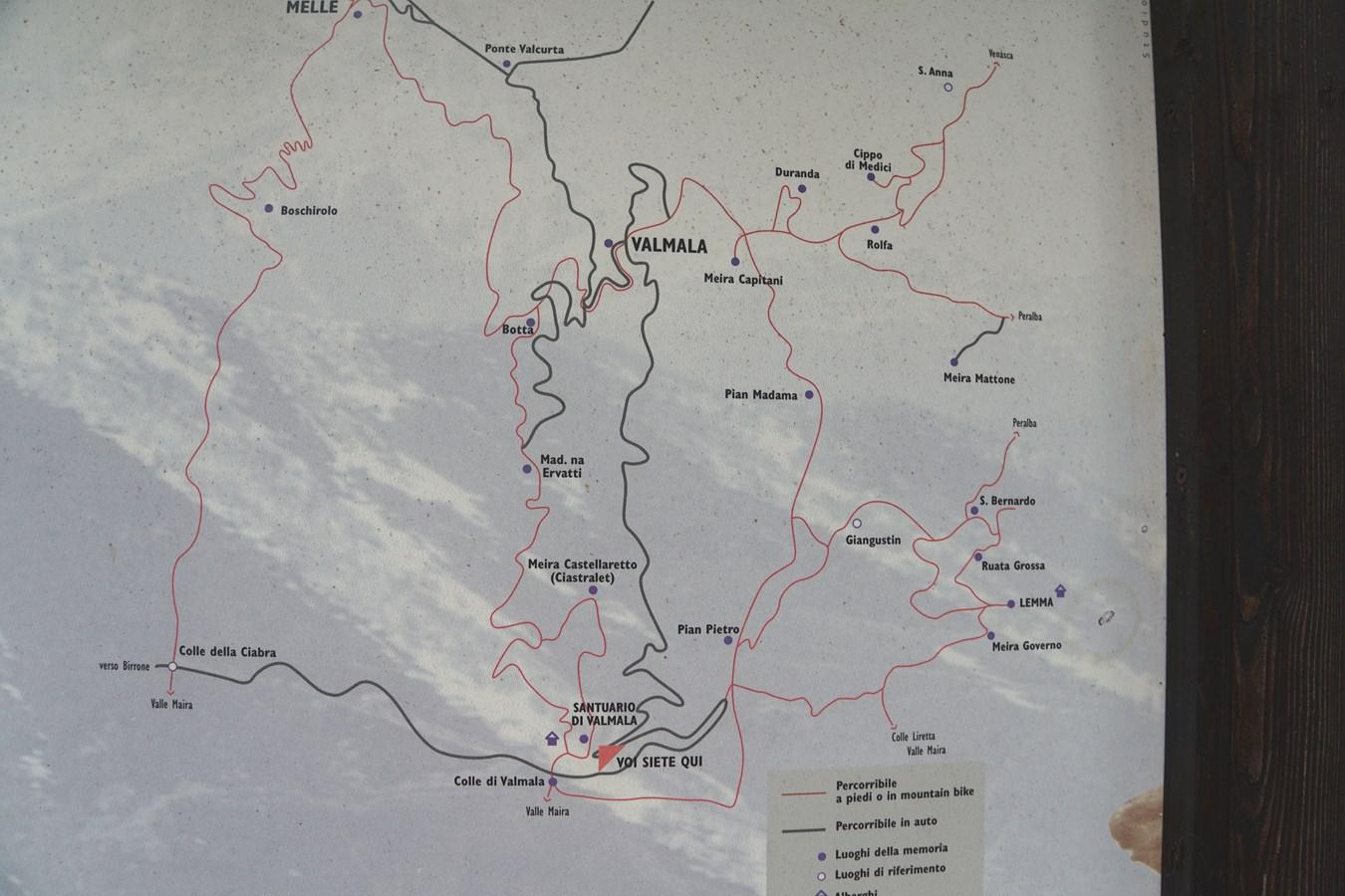 Partenza da Melle su asfaltata che sale verso la borgata Chiappellino che diventa ben presto sterrata .Si attraversano sempre su sterrata progressiva ed ottimamente ciclabile sino al Santuario di Valmala . Oltrepassato il Santuario si prende la dorsale (inizio della famosa “strada dei cannoni”) che porta al Monte Ciabra,e al Colle della Ciabra dal quale si scende percorrendo la Costa d’Amiglione . Si scende su sentiero che raggiunge la frazione Roschirato e poi Melle .