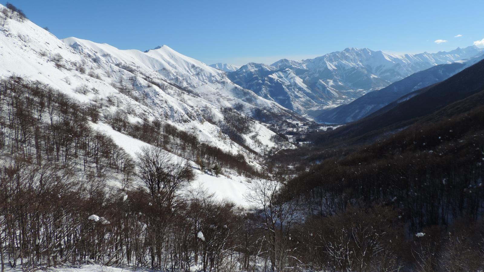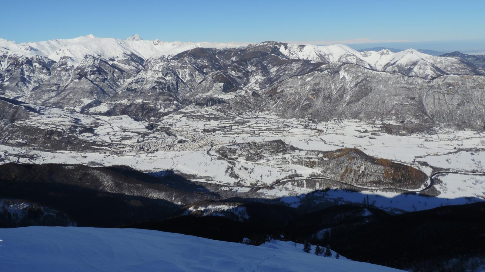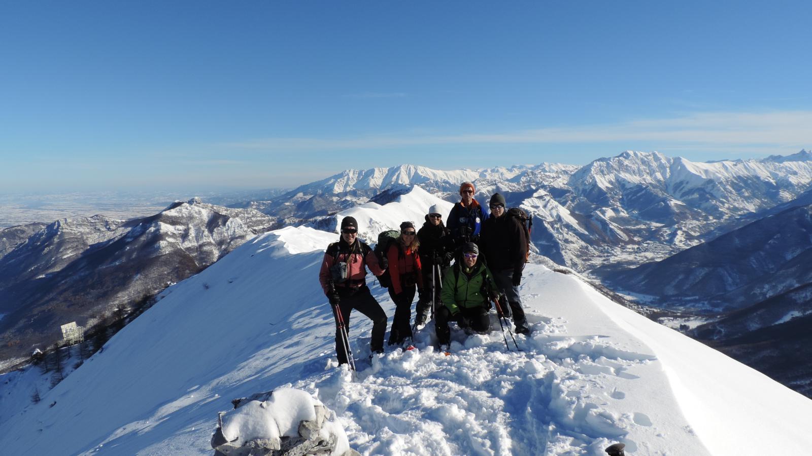 L’arrivo in vetta è incantevole….con questa cima affacciata sulla Valle Stura di Demonte e sulla pianura piemontese in buona parte tutta innevata ! In vetta oltre a noi sono arrivati almeno 10 scialpinisti e altrettanti ciaspolatori, una meta ed una cima decisamente gettonata oggi, ma date le condizioni di innevamento delle Marittime e Cozie era prevedibile l’affollamento. Però non è risultato fastidioso e la cima è rimasta godibile per fortuna. Come già scritto da Andrea pur essendo una cima dalla quota modesta ha offerto una panorama vastissimo e spettacolare, con lo sguardo che spaziava dalle Alpi Liguri al lontano Gruppo del Monte Rosa, e osservando con attenzione si vedevano distintamente grandi vette come il Gran Paradiso, i Lyskamm, tutte le cime del Rosa, Cervino, Dent d’Herens e Weisshorn…niente male direi! Ci siamo trattenuti in cima per circa 1 ora, non c’era vento forte, però la temperatura era frizzante e non invogliava a restare fermi troppo a lungo! Ci siamo goduti la cima come è consuetudine del nostro gruppo e poi siamo scesi, concedendoci una sosta per la pausa pranzo al più riparato sito del Colle dell’Arpione. Poi, dopo aver salutato gli amici scialpinisti che scendevano, ci siamo avviati anche noi con calma per godere fino in fondo la giornata splendida e l’ambiente sempre molto suggestivo fino a San Bernardo di Desertetto! In discesa la traccia di salita è diventata davvero un solco autostradale….era passato proprio il mondo!