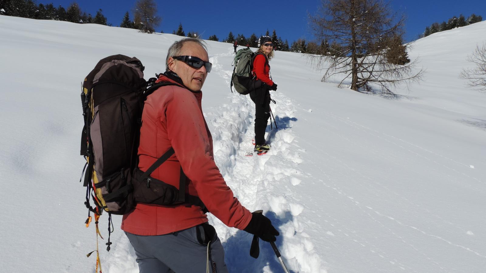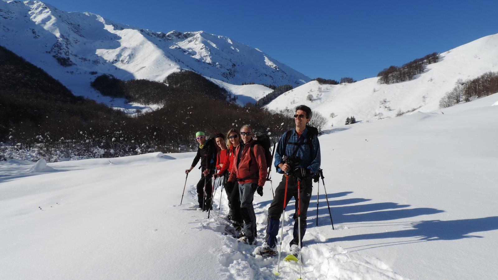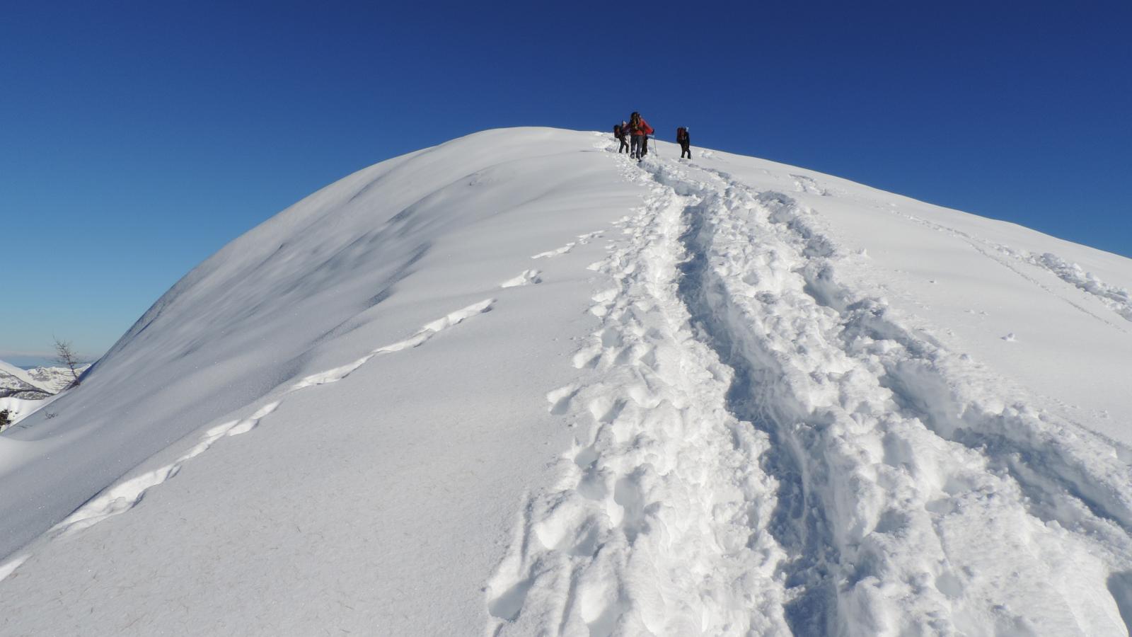 Oggi, data la quantità e la qualità della neve presente già a quote molto basse non c’erano grandi possibilità o alternative, quindi la scelta è caduta sulla Cima Cialancia proposta da Maurizio. Partiti da San Bernardo di Desertetto con il cielo sereno e il sole, la giornata si presenta decisamente bene! Seguita la stradina che si inoltra nel vallone, con 20/30 cm di neve fresca e farinosa, ma potevamo contare su una buona traccia fatta da diversi ciaspolatori passati prima di noi. Sulla pista tracciata si saliva bene, ma appena uno provava ad uscire fuori sfondava senza scampo (ed era prevedibile data la neve caduta ieri !). Davvero piacevole il contesto ambientale dove si snodava il percorso, sempre ben tracciato, man mano che si prendeva quota aumentava lo spessore del manto nevoso, almeno mezzo metro, neve fresca e farinosa, se non fosse stato per la traccia fatta sarebbe stata alquanto dura e faticosa. Arrivati al Colle dell’Arpione, dopo una breve pausa per motivi fotografici riprendiamo la salita per la bella cresta finale, davvero interessante e fotogenica, qui, nella parte alta tra l’anticima e la vetta siamo stati raggiunti dal gruppo di scialpinisti del CAI Ligure composto da Filippo, Enrico e altri volti conosciuti, un incontro piacevole e non certo programmato, insomma una bella sorpresa, sembrava quasi una sorta di mini-raduno del CAI Ligure di Genova.