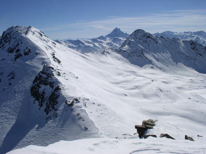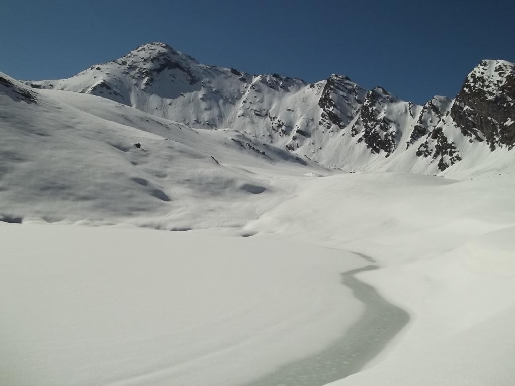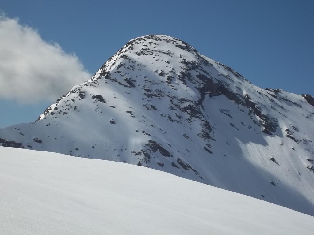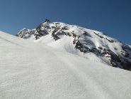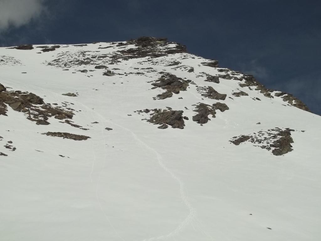 Risalire il vallone preferibilmente sulla sx orografica non troppo sotto alle bastionate laterali. Puntare verso il centro della conca in direzione dei numerosi baraccamenti, risalendo e circondando dune nevose. Puntare all’evidente ripida dorsale contraddistinta alla sua estremità da un masso a forma di cubo (eventualmente picca e ramponi) che si aggira a dx, guadandolo. Risalire gli ultimi metri piuttosto esposti e uscire sulla piatta cima. Percorrere qualche metro di cresta ponendo attenzione alle cornici, fino all’ometto di vetta. Panorama grandioso.