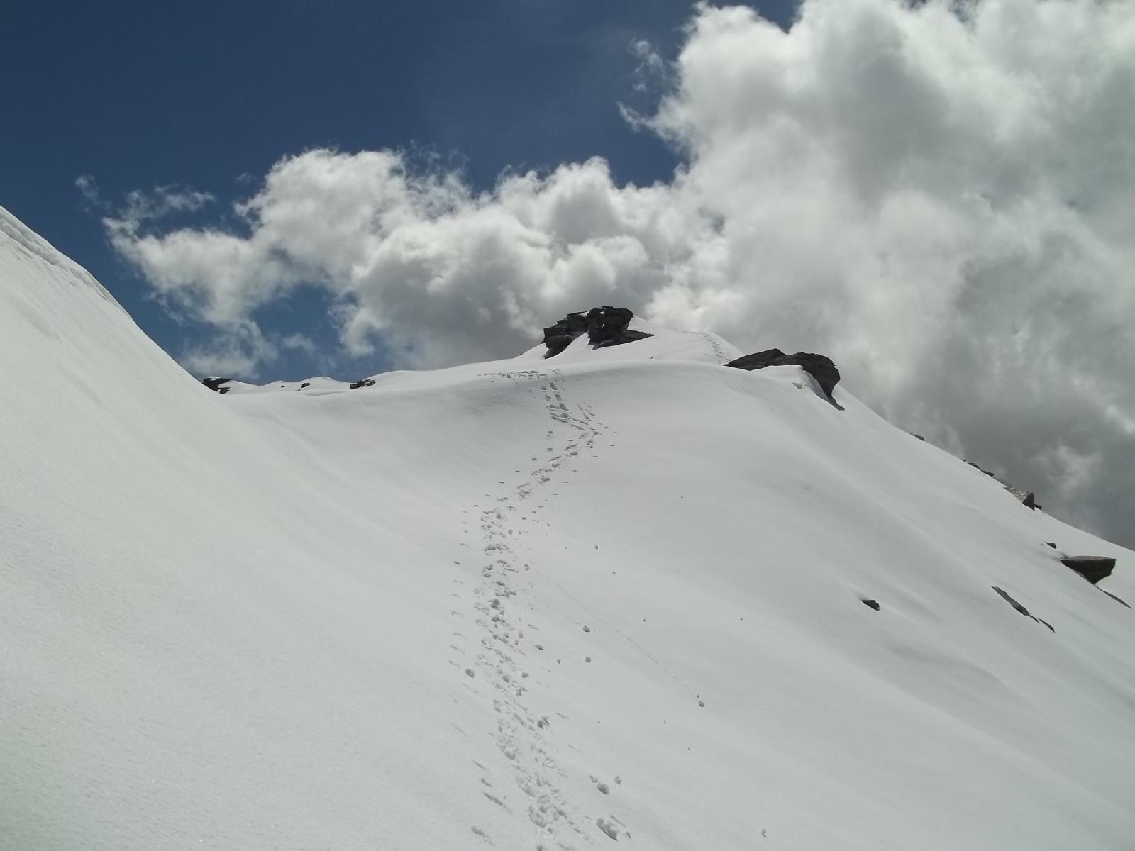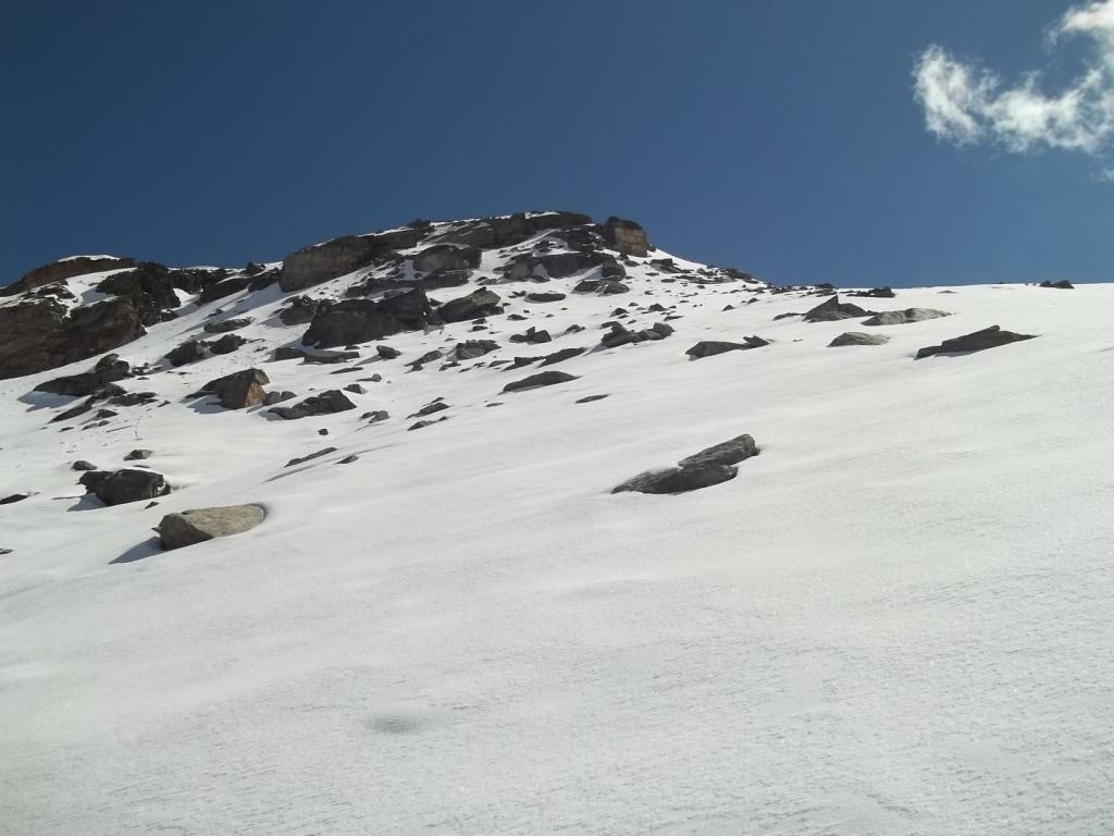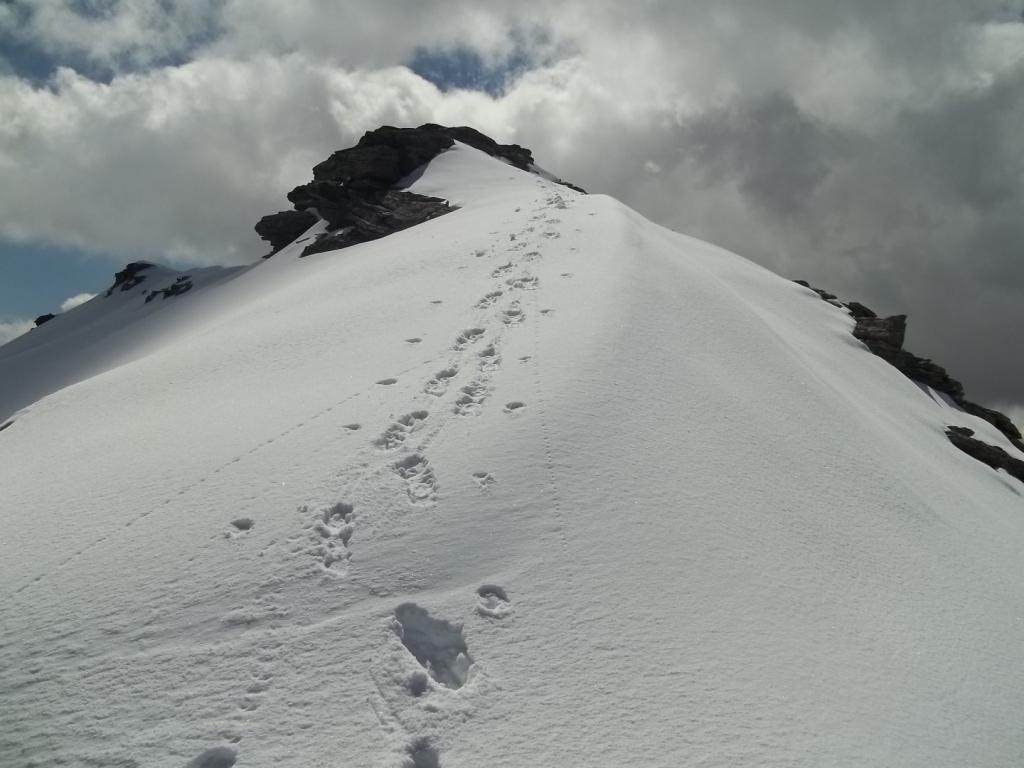 In caso di neve dura sul pendio finale, sono indispensabili picca e ramponi