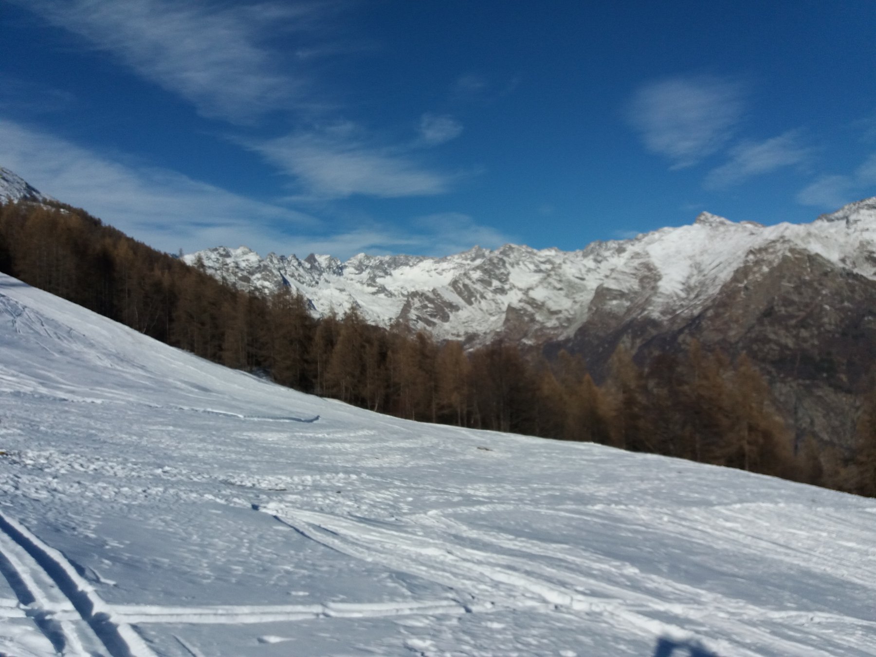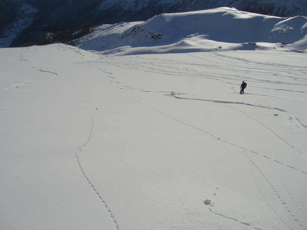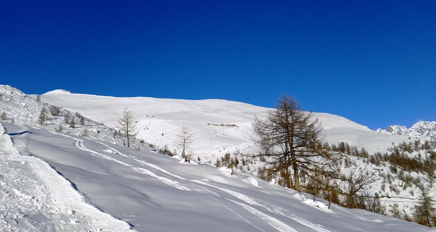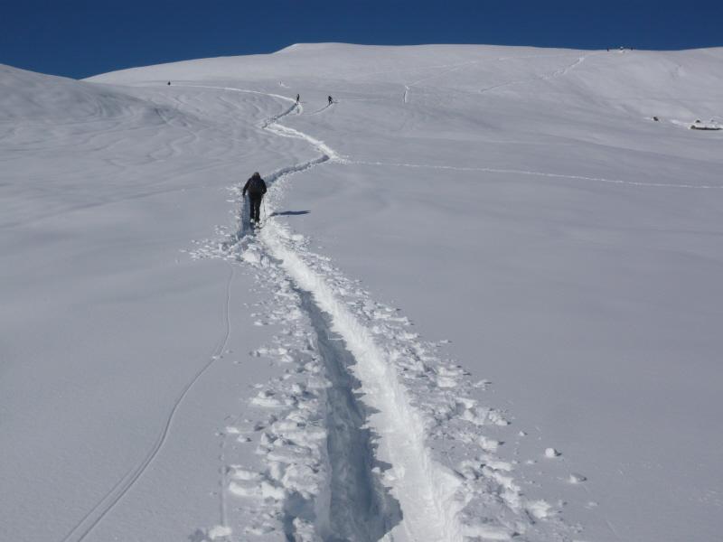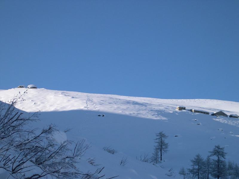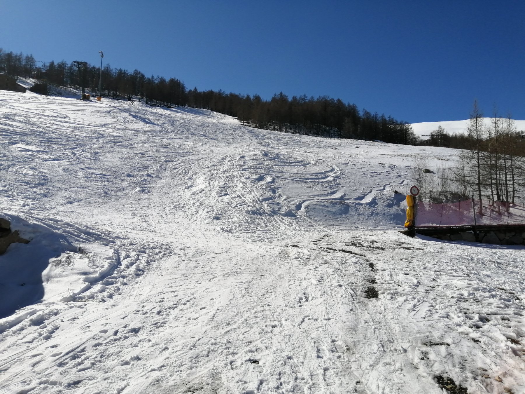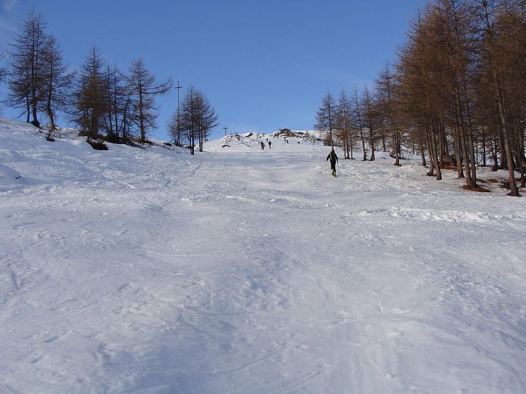 Dal piazzale seguire la pista di discesa più a destra e meno ripida, facendo attenzione agli sciatori.