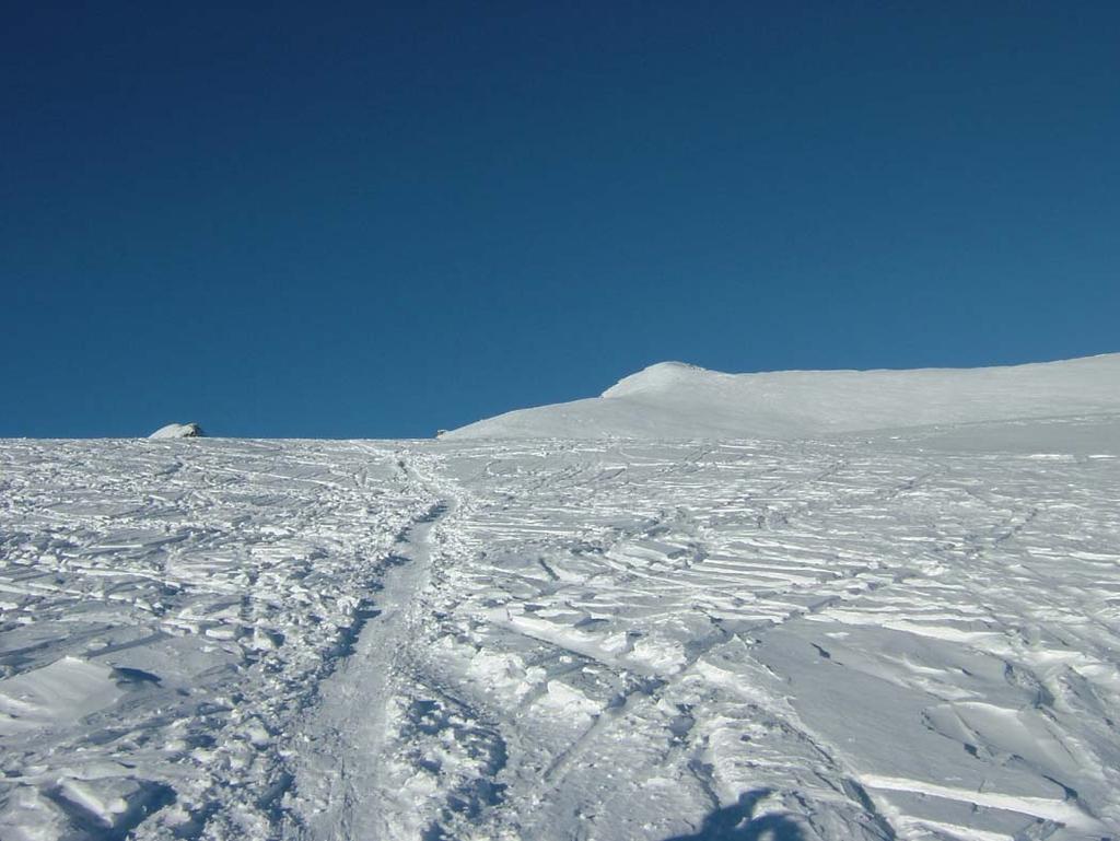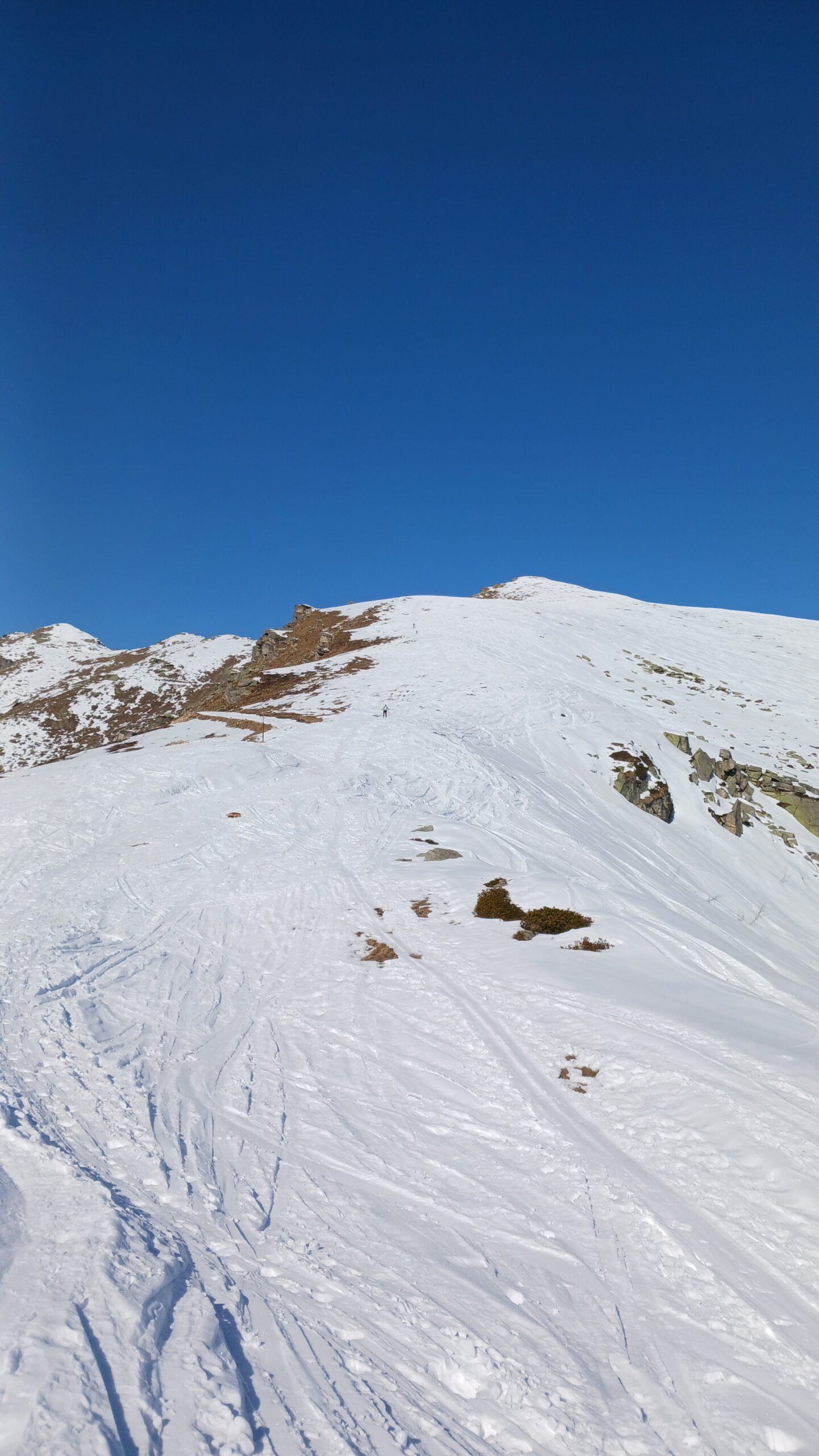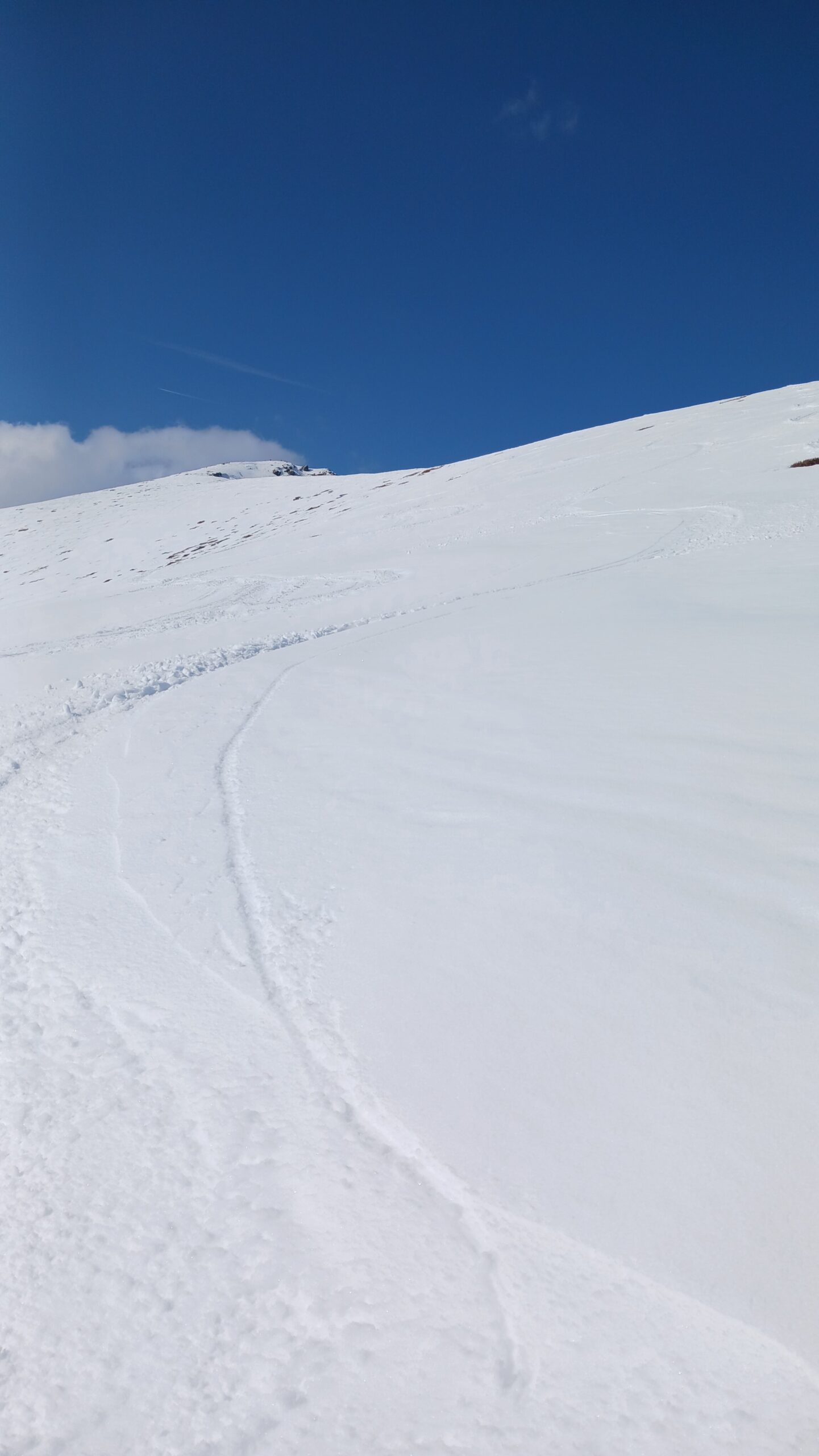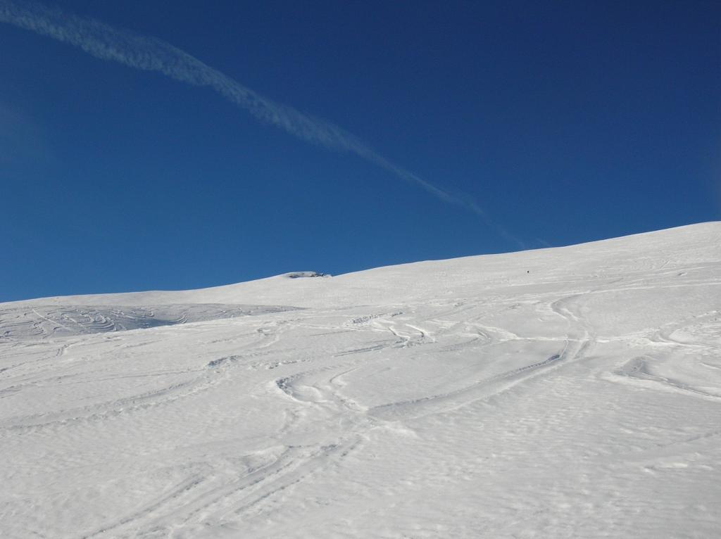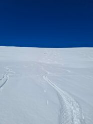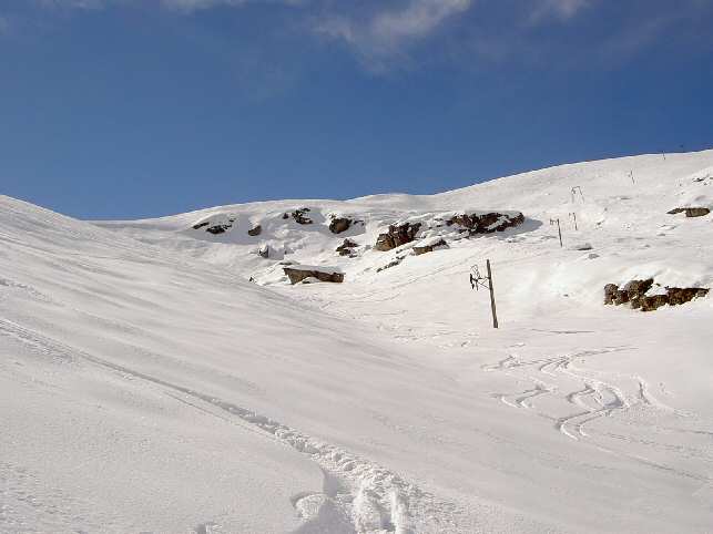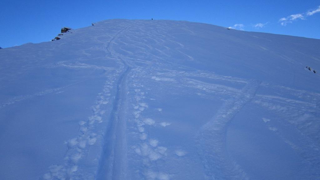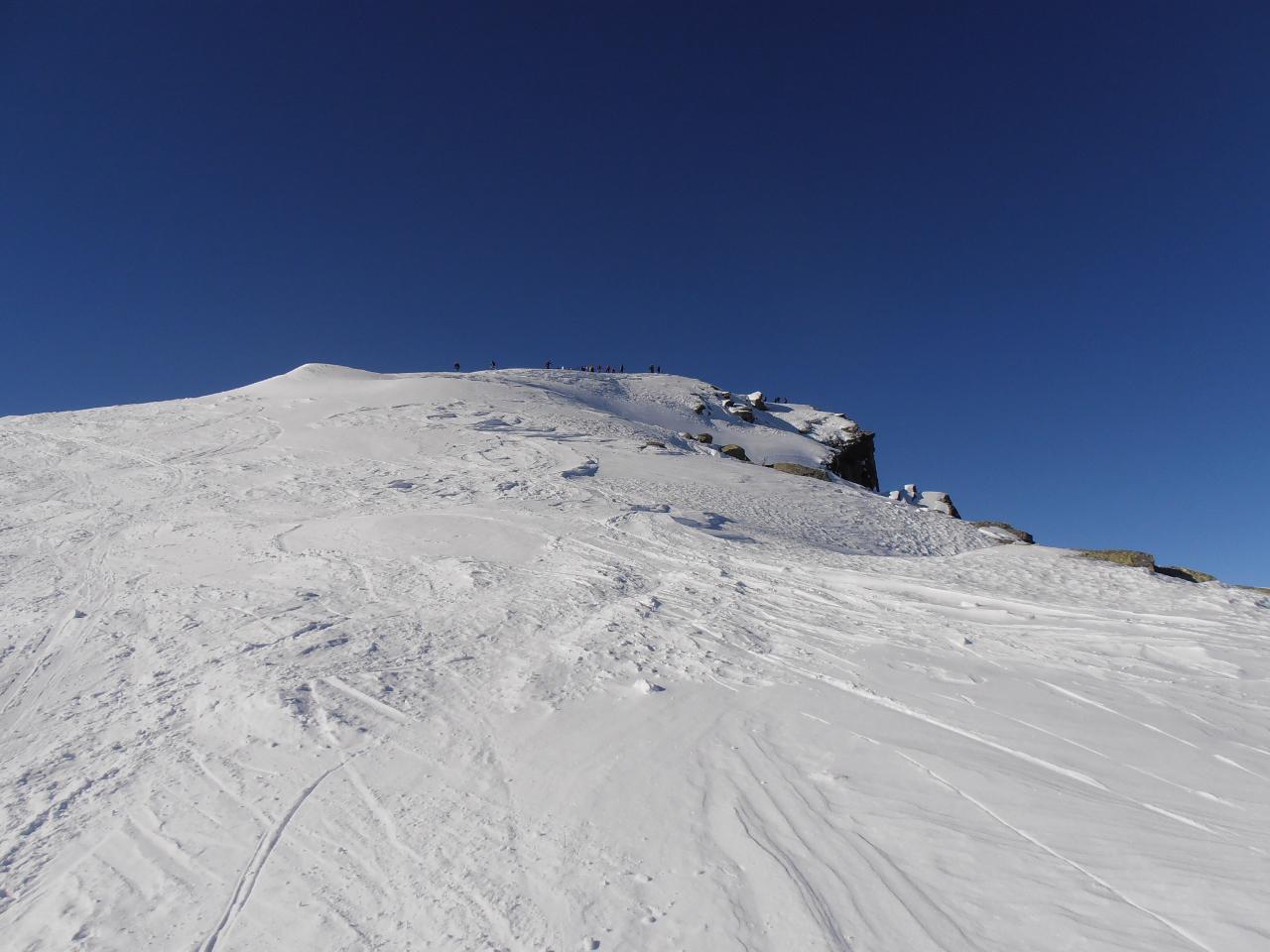Dal piazzale seguire la pista di discesa più a destra e meno ripida, facendo attenzione agli sciatori.
