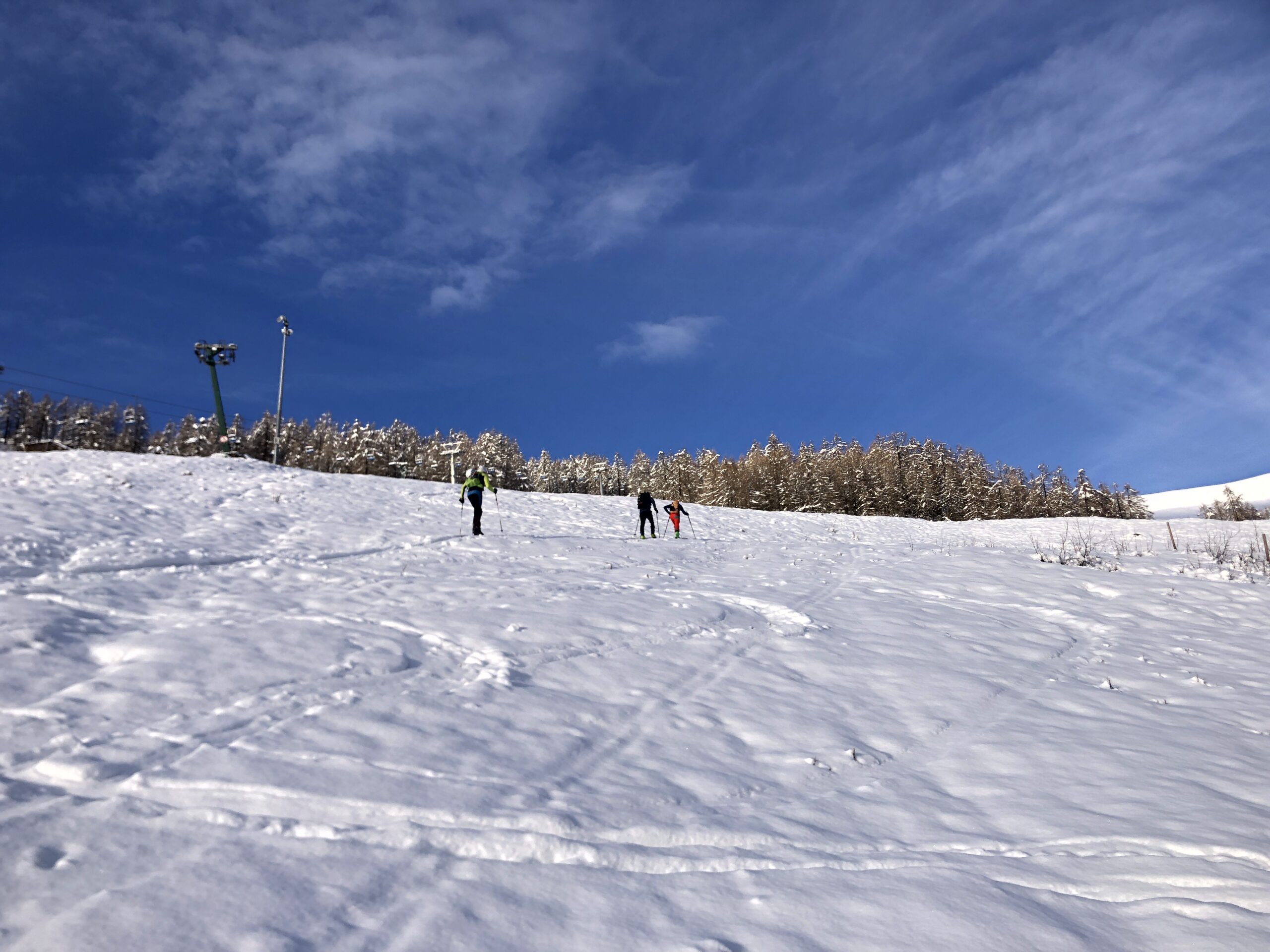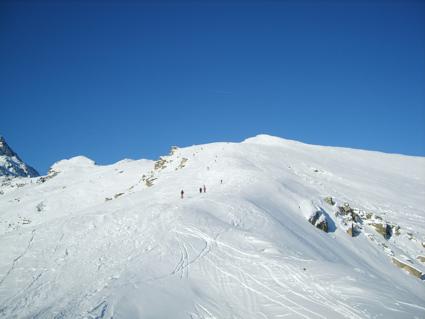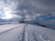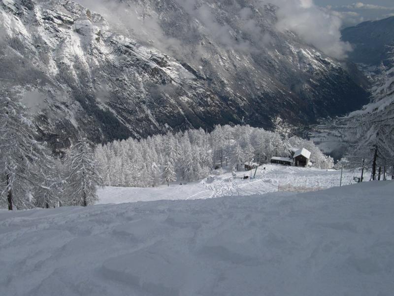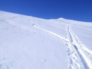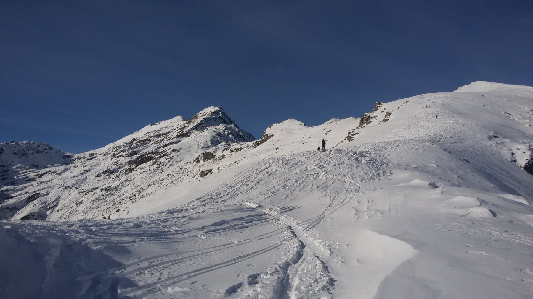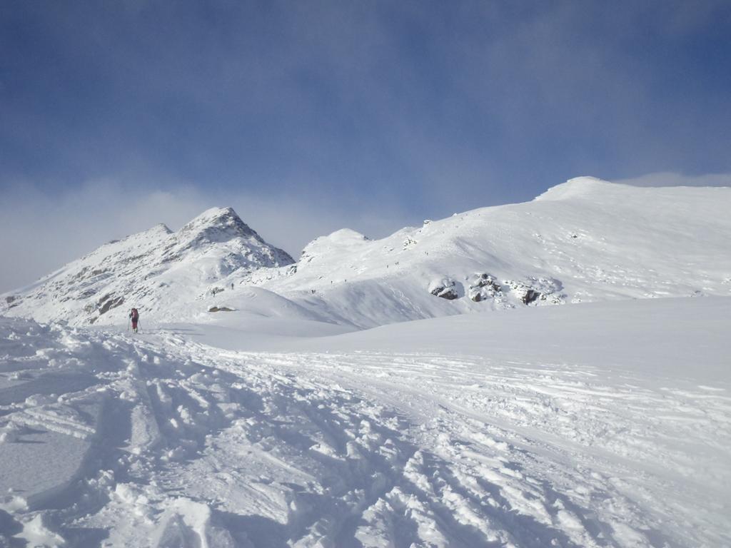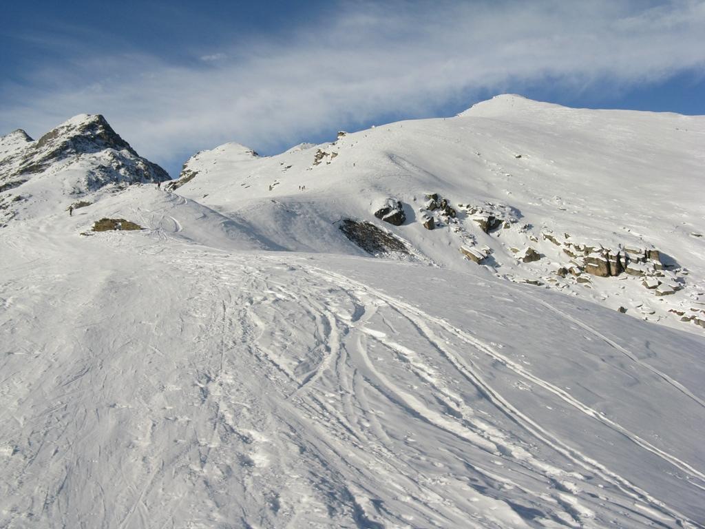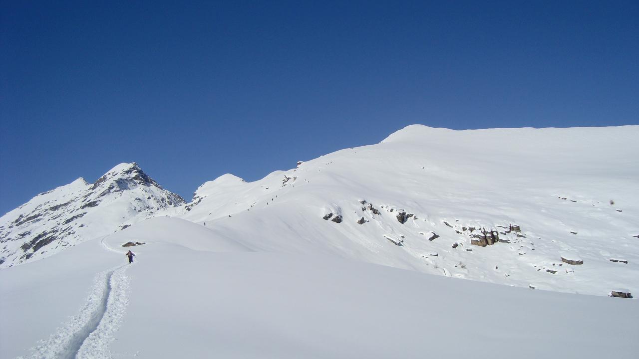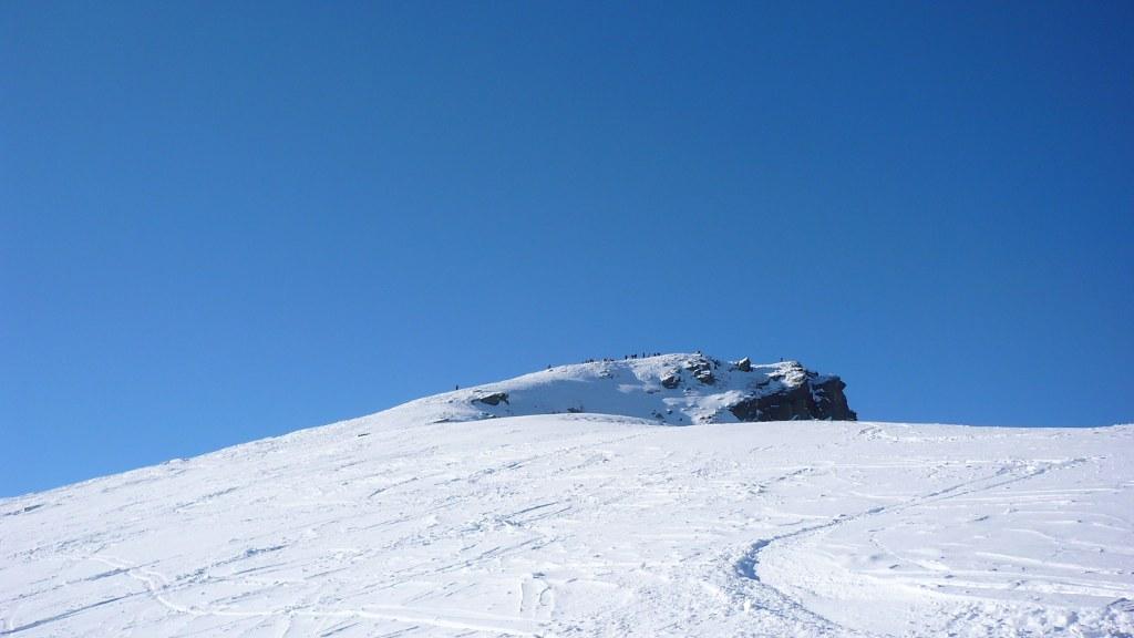Dal piazzale seguire la pista di discesa più a destra e meno ripida, facendo attenzione agli sciatori.