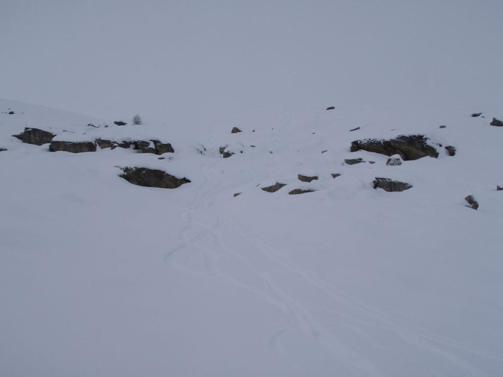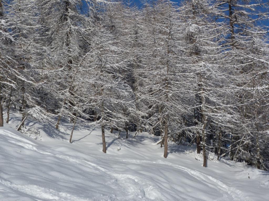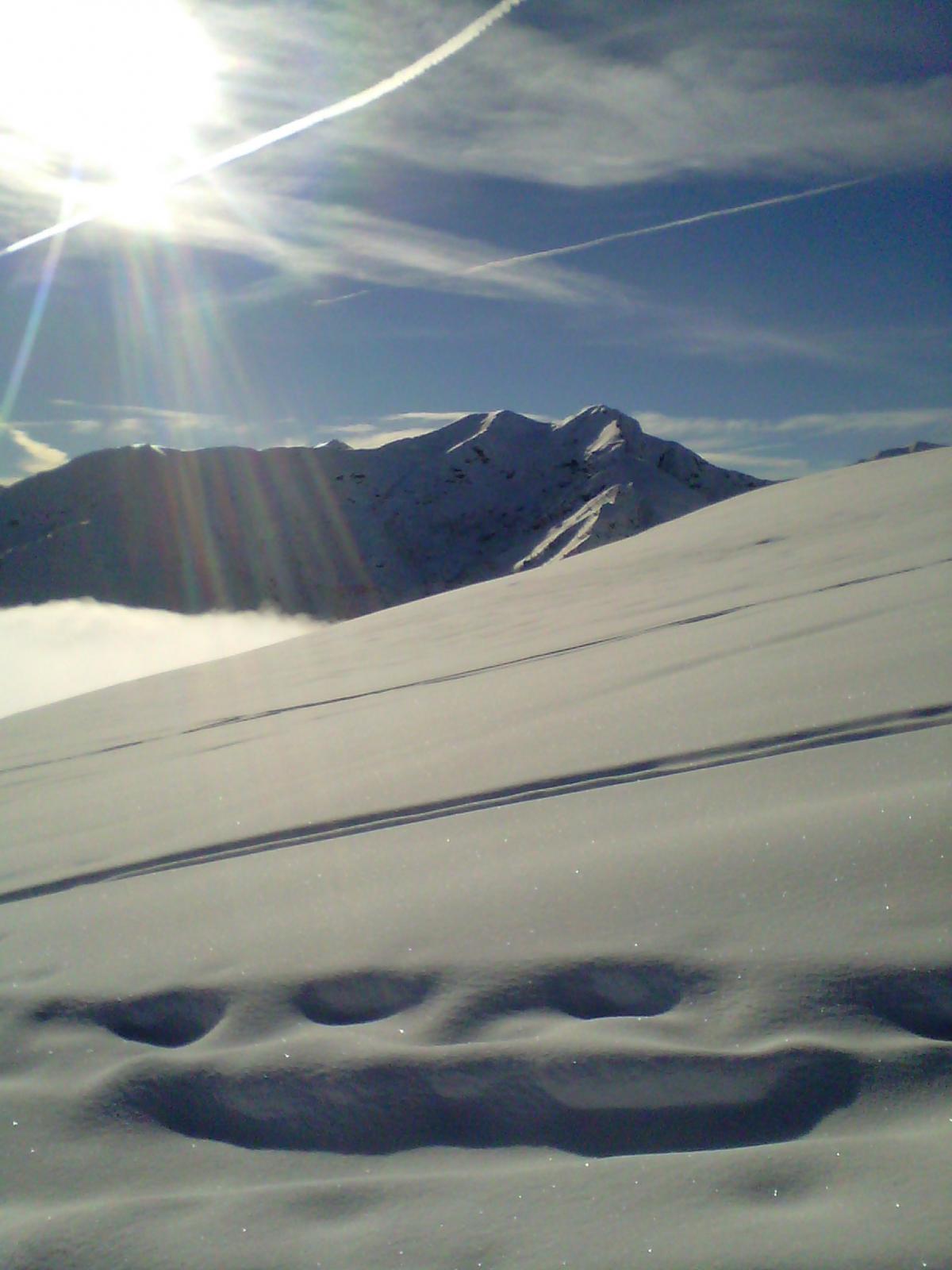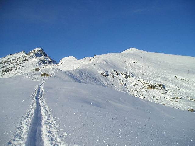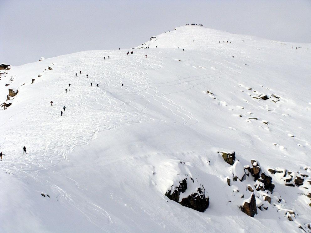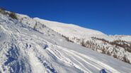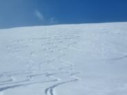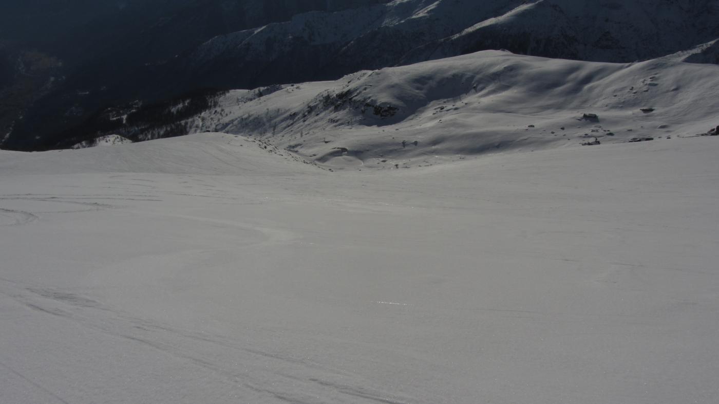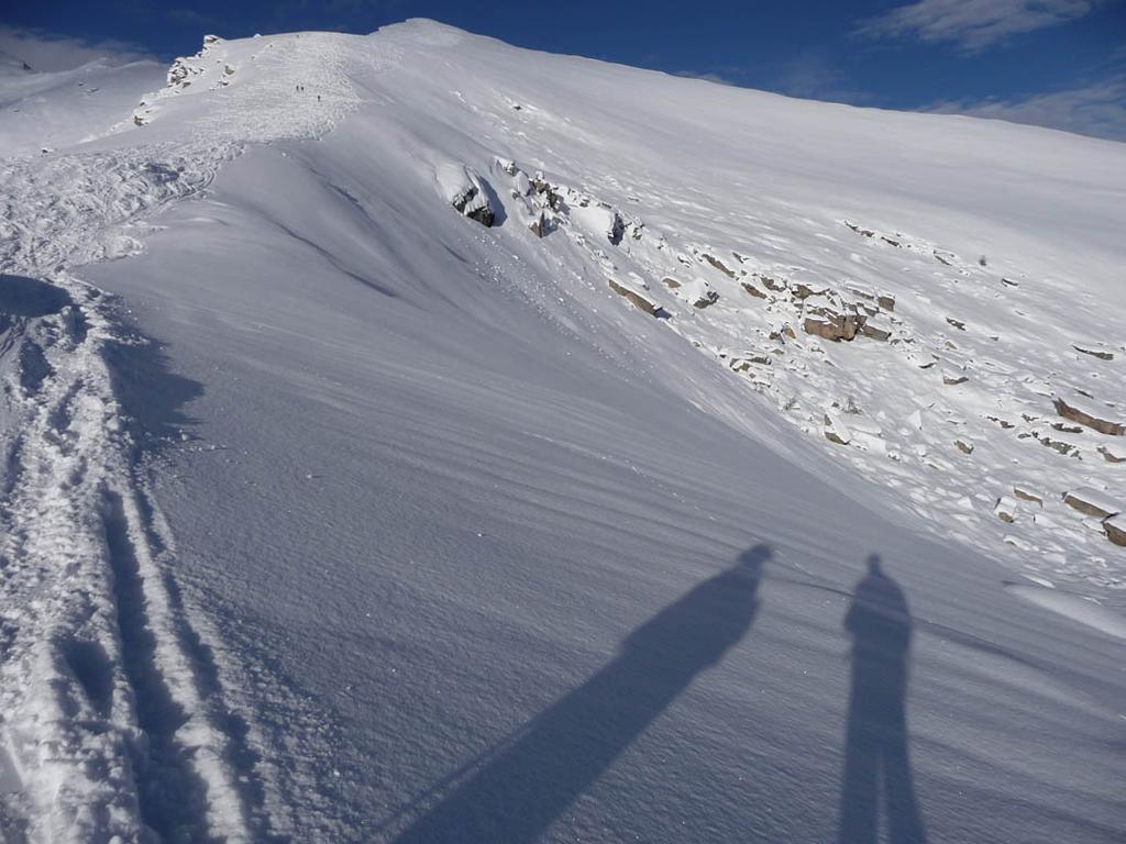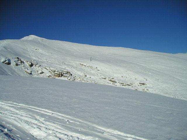 Dal piazzale seguire la pista di discesa più a destra e meno ripida, facendo attenzione agli sciatori.