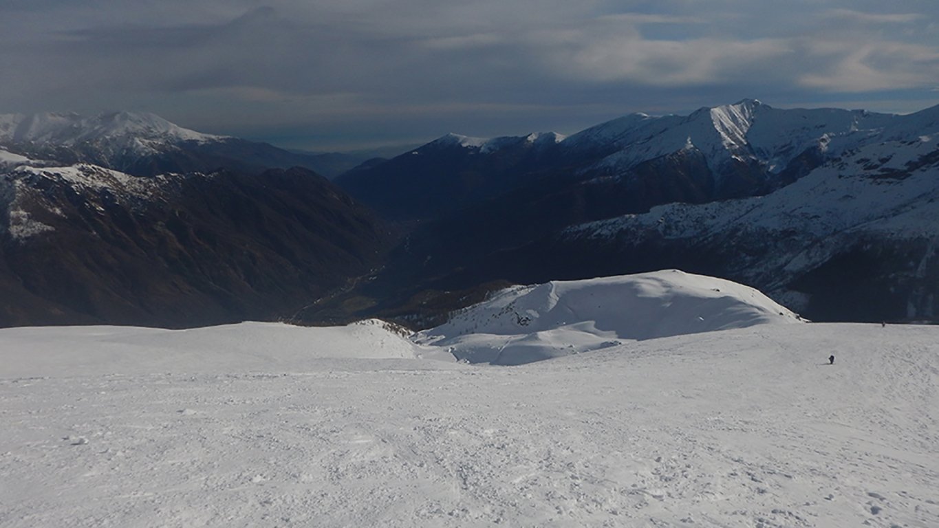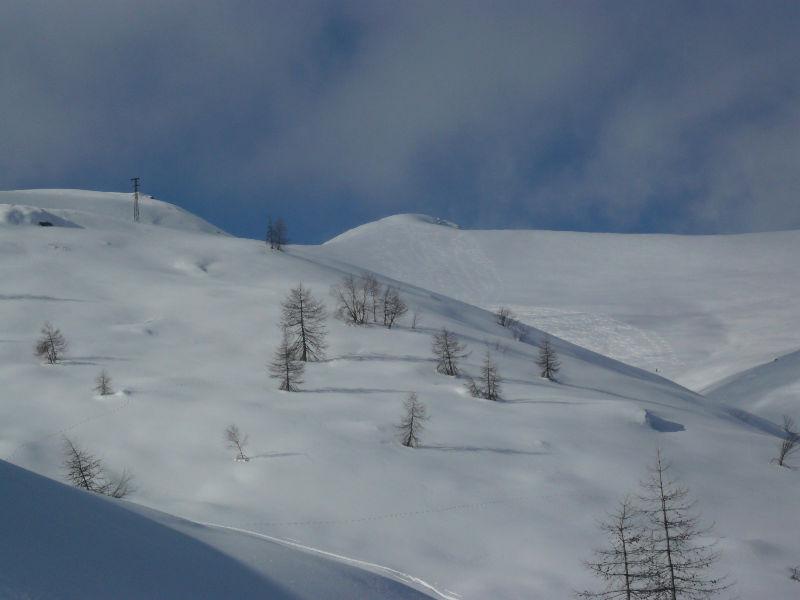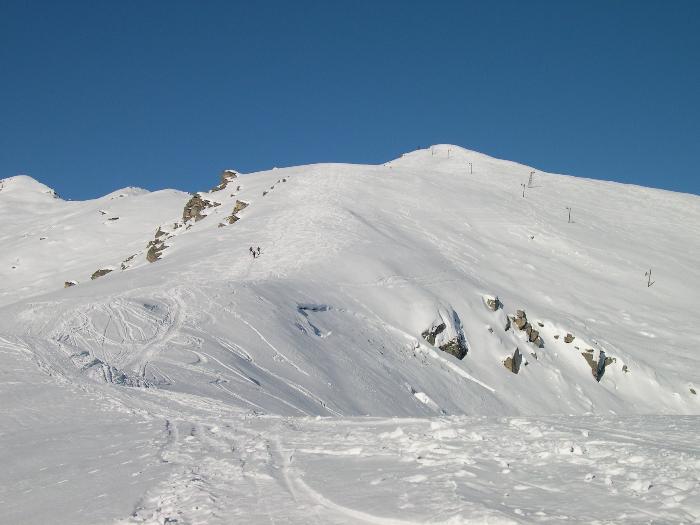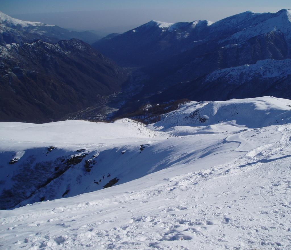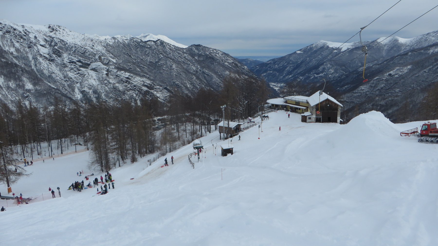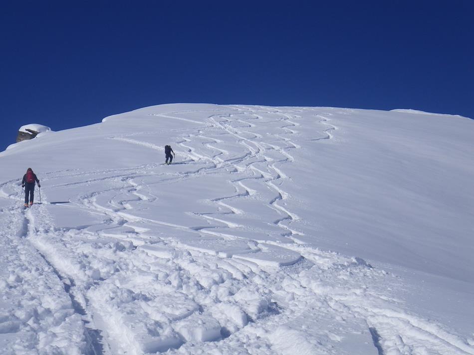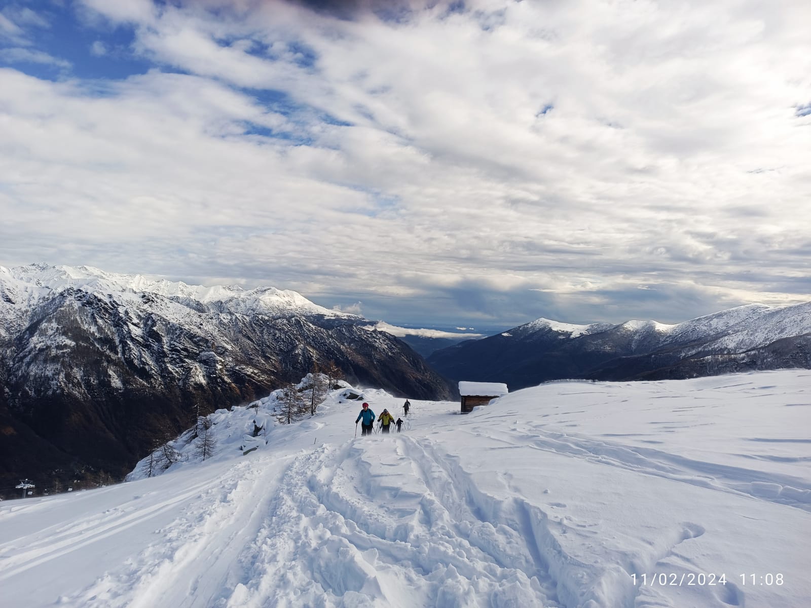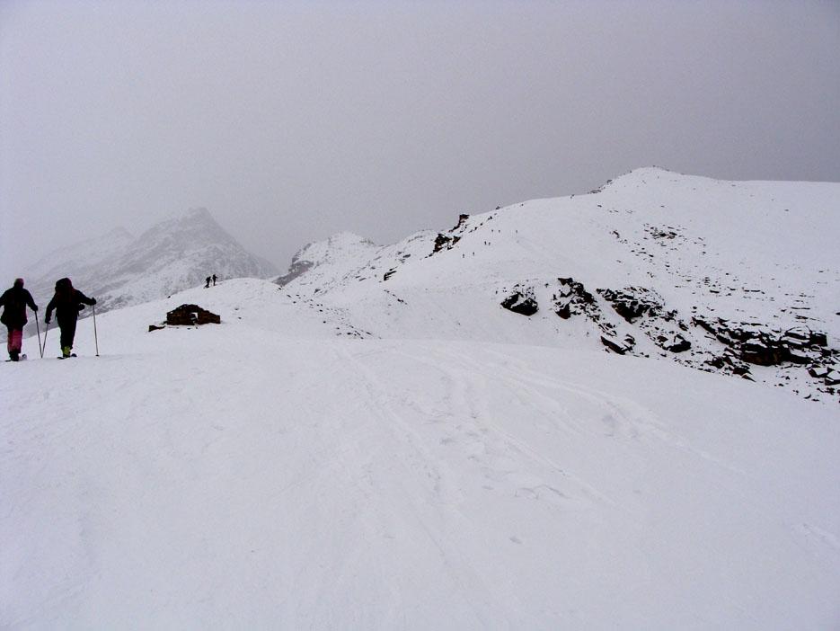 Dal piazzale seguire la pista di discesa più a destra e meno ripida, facendo attenzione agli sciatori.