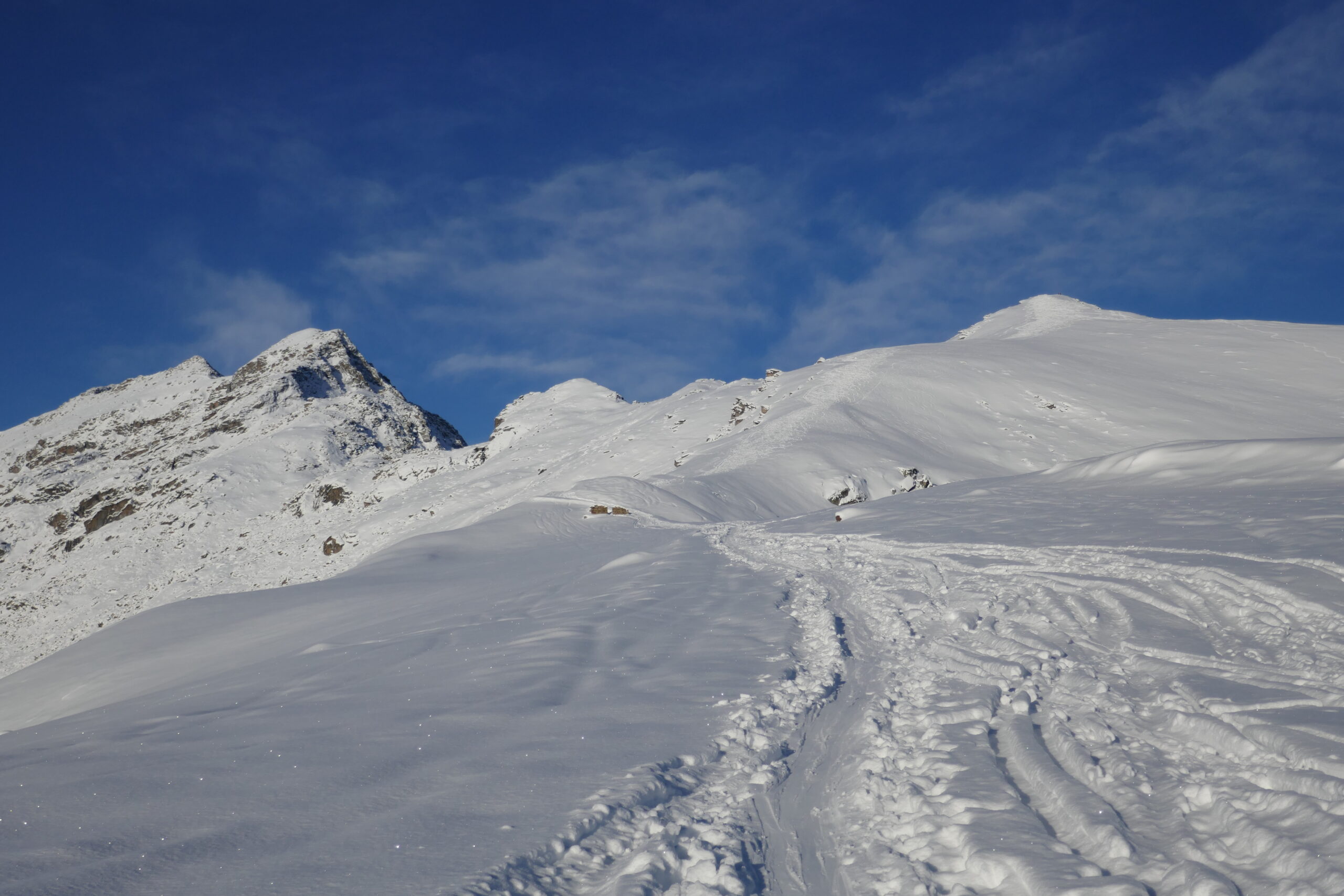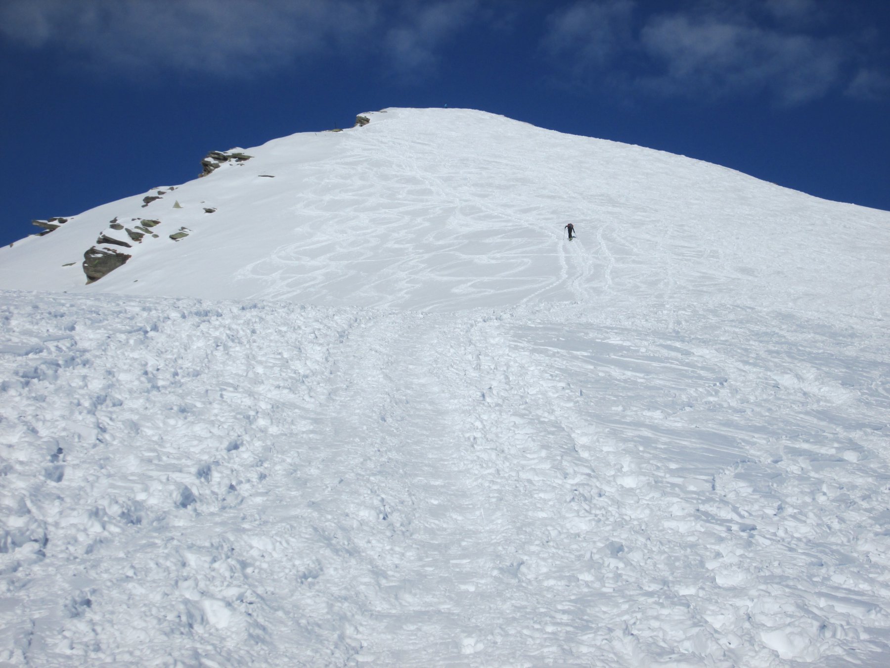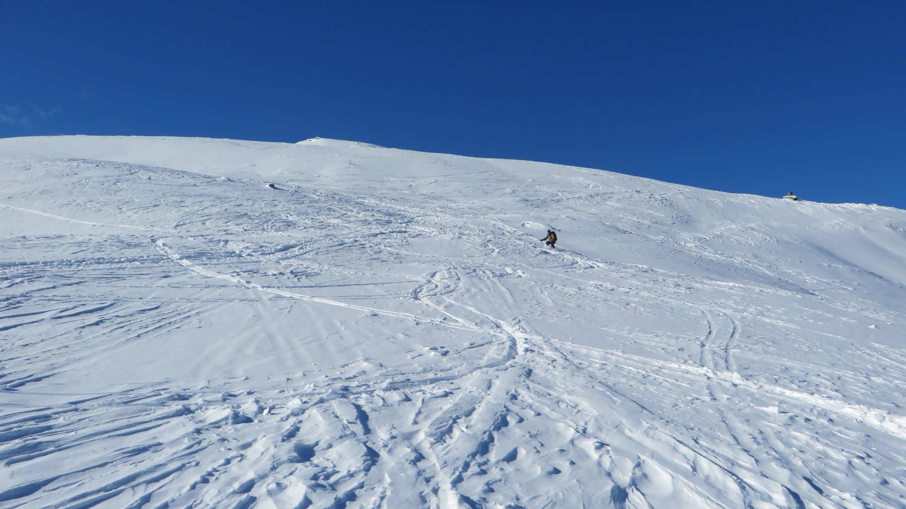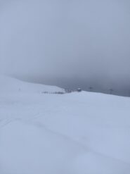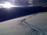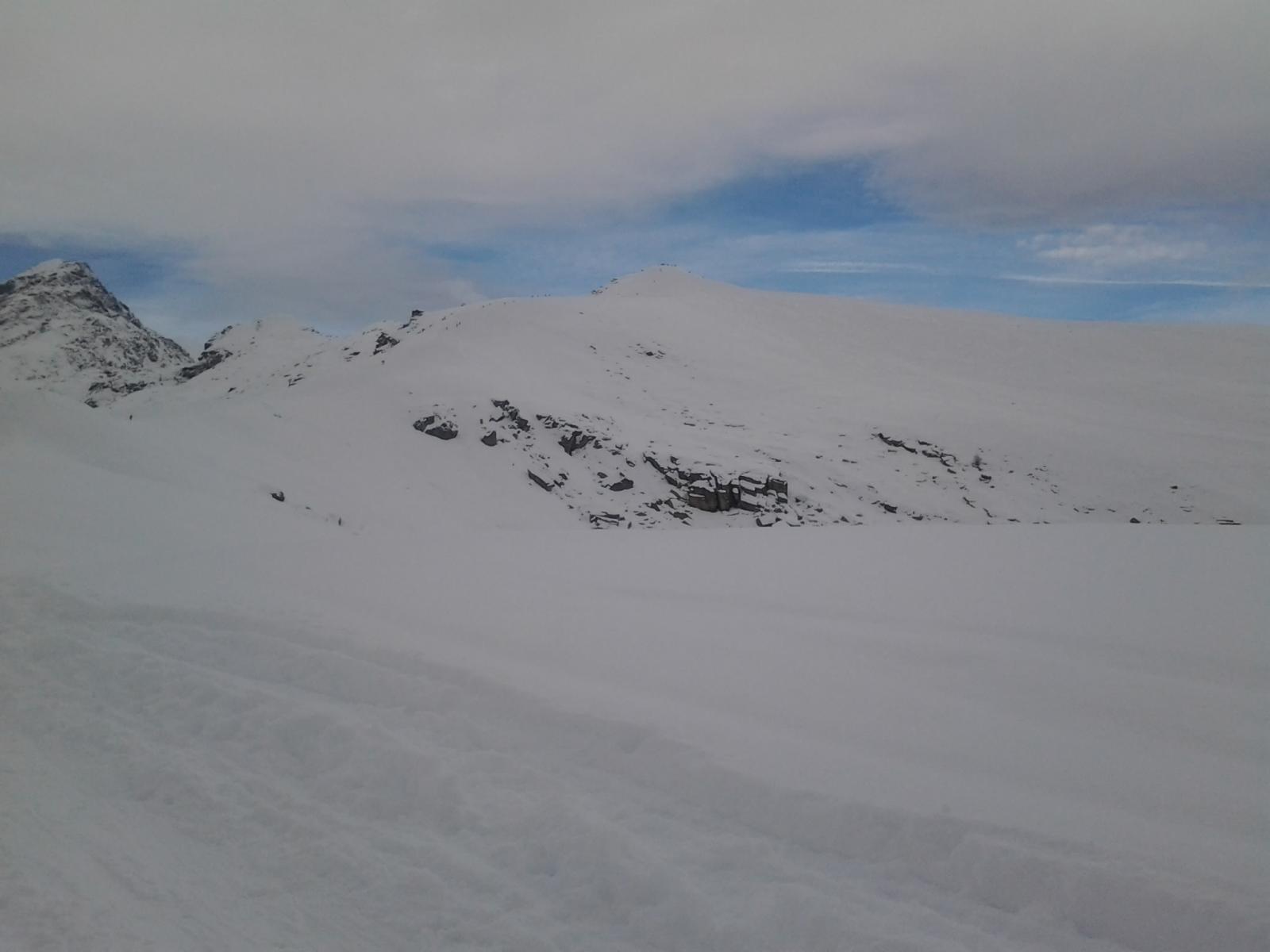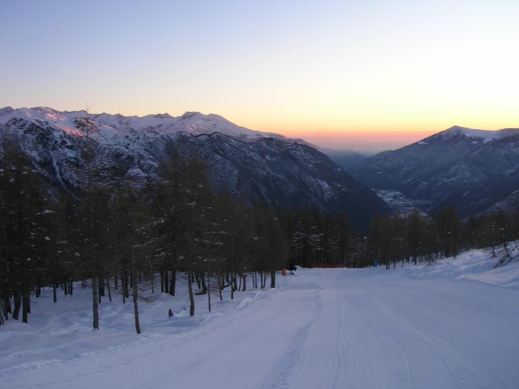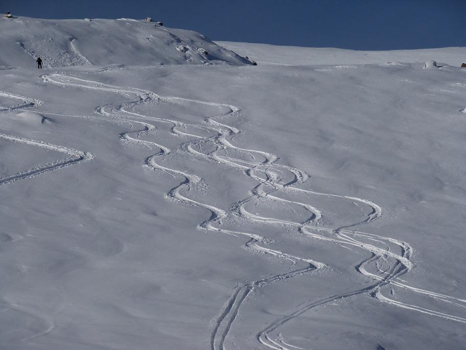 Dal piazzale seguire la pista di discesa più a destra e meno ripida, facendo attenzione agli sciatori.