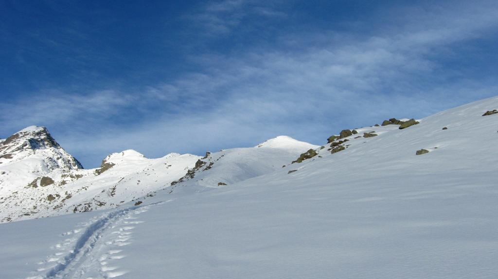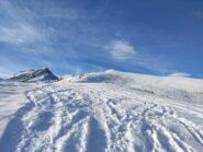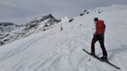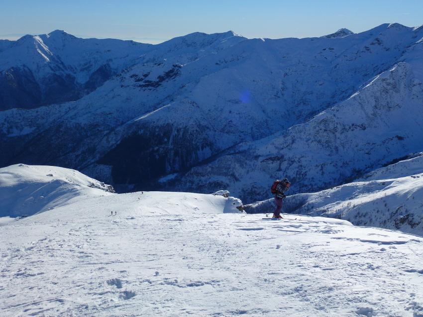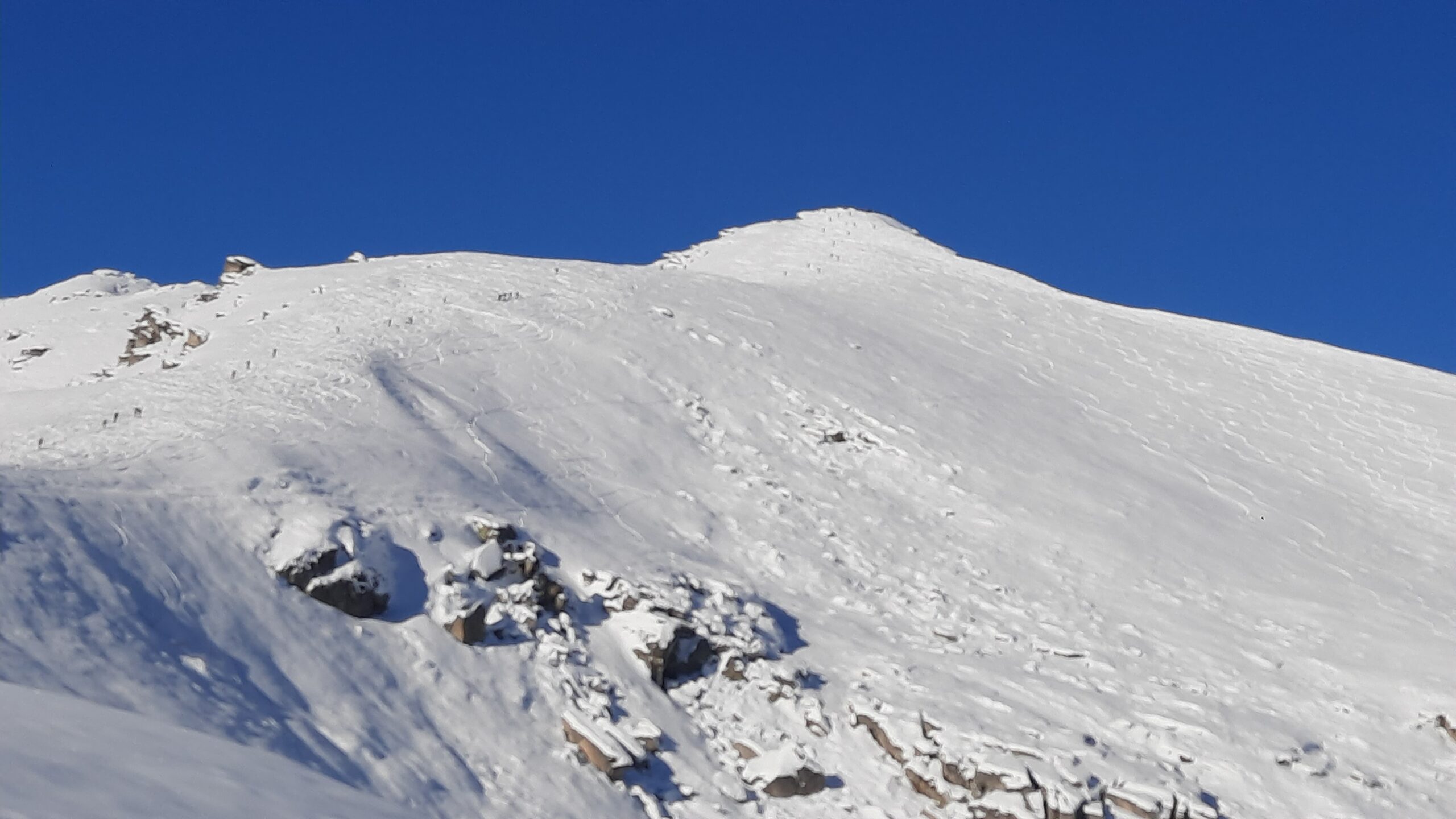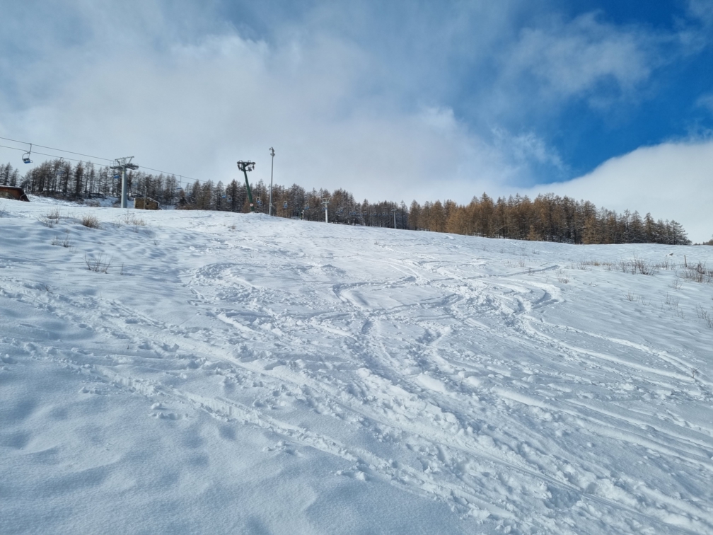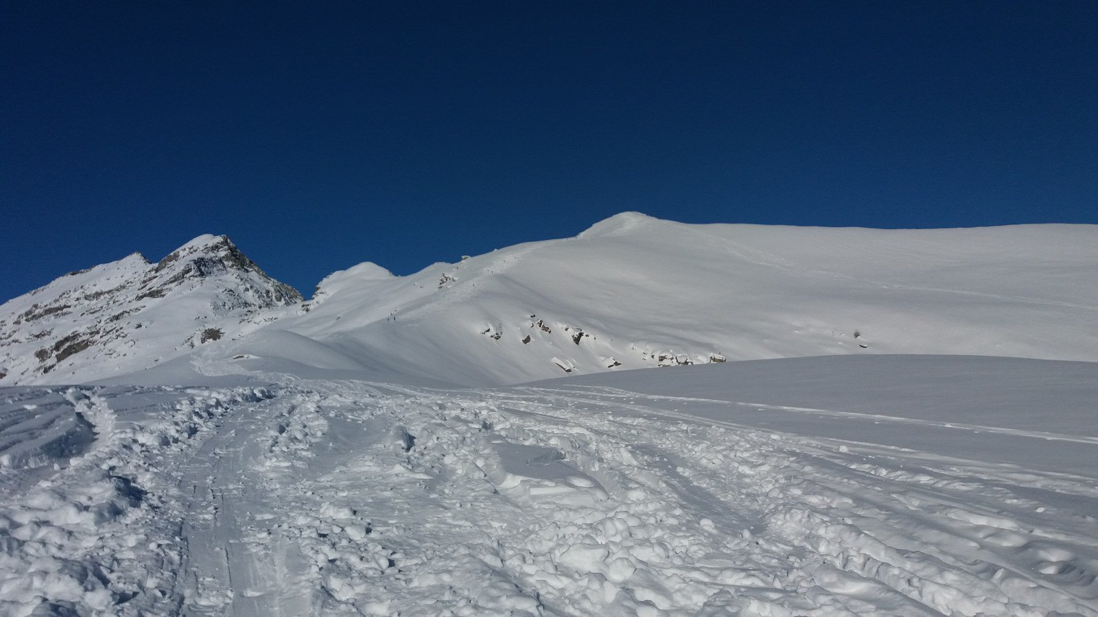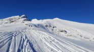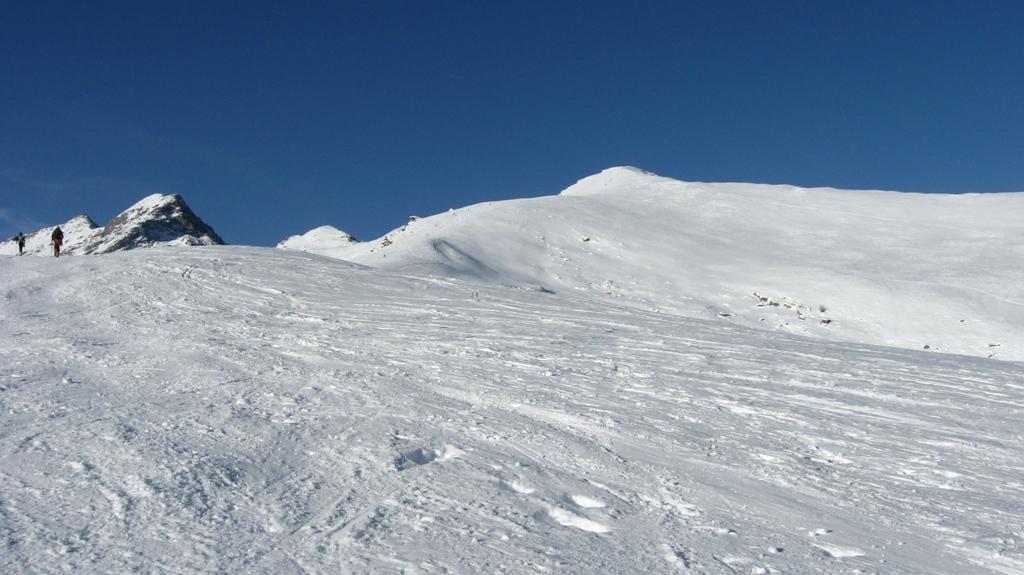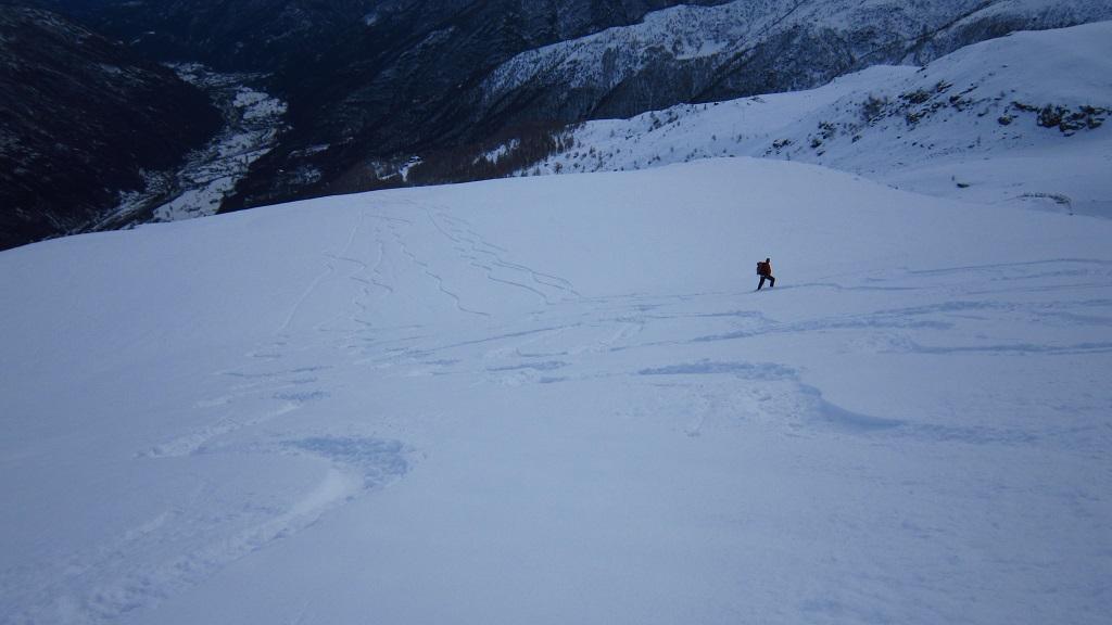 Dal piazzale seguire la pista di discesa più a destra e meno ripida, facendo attenzione agli sciatori.