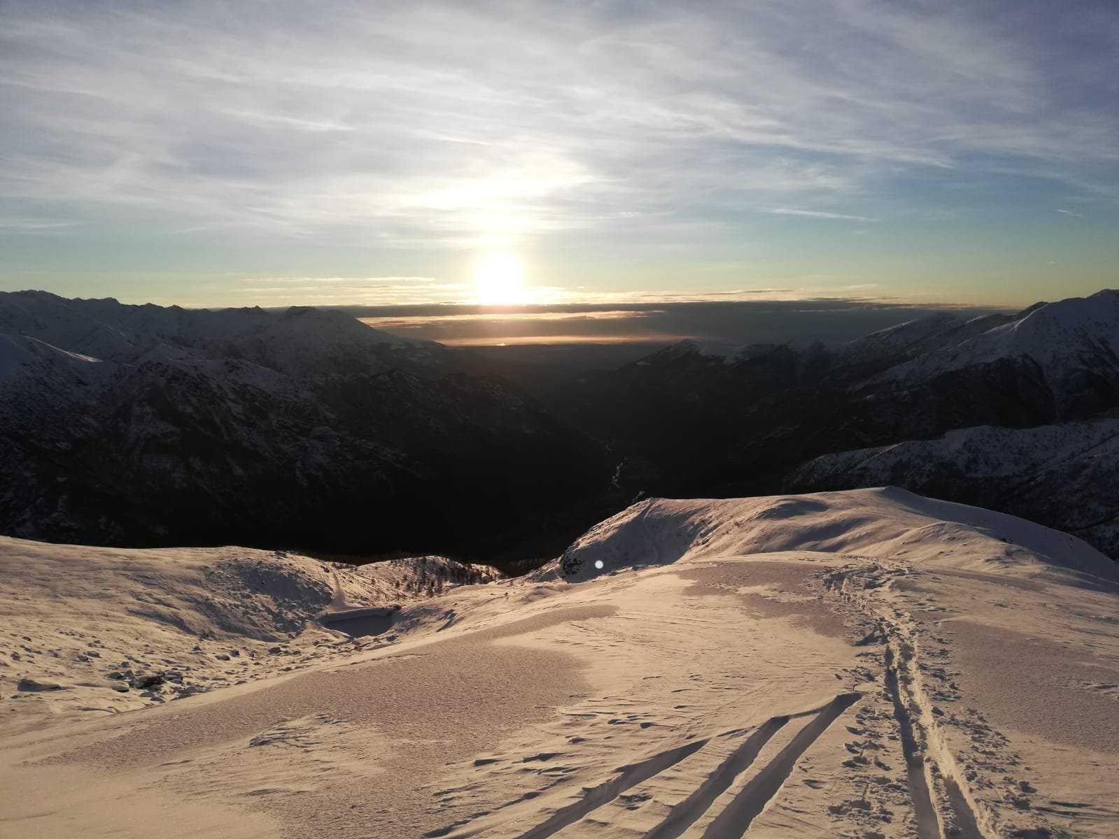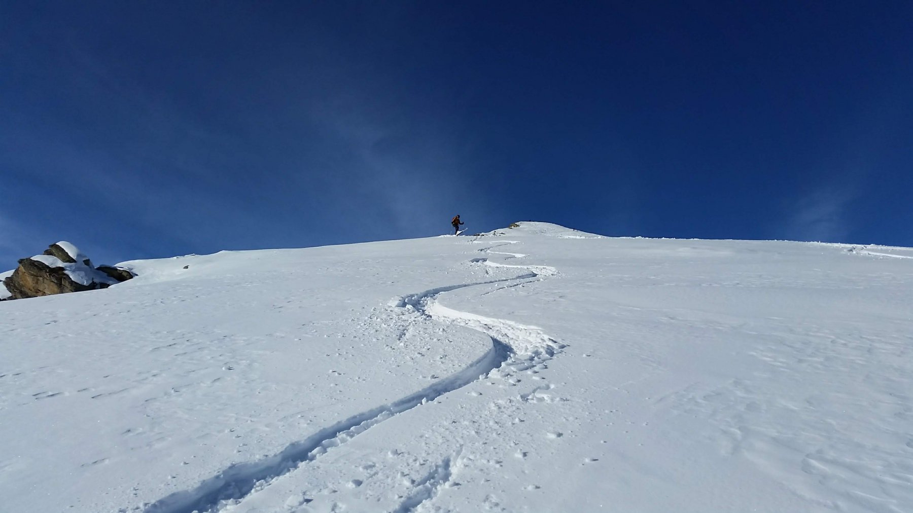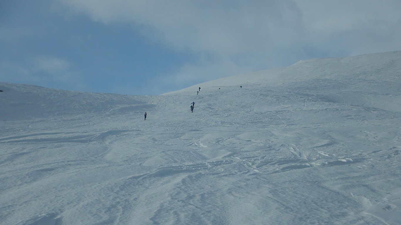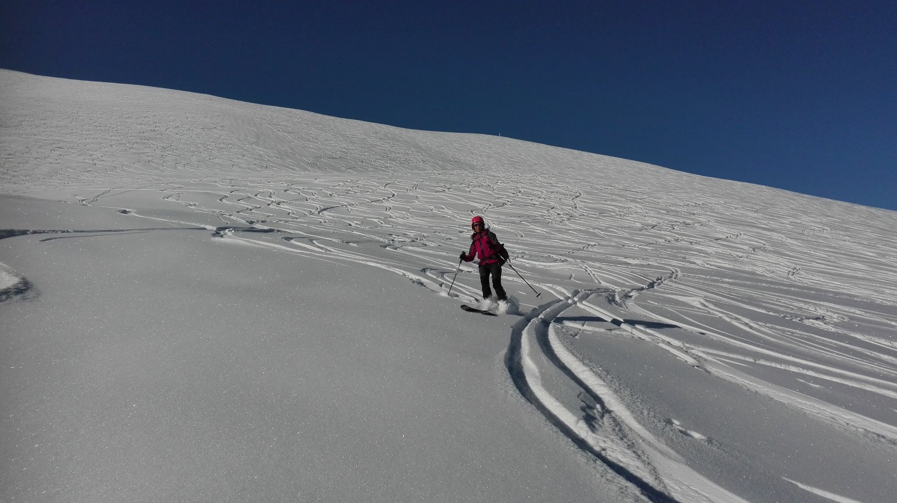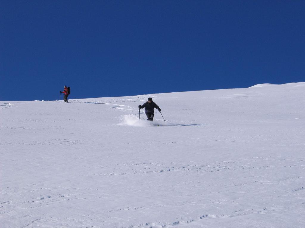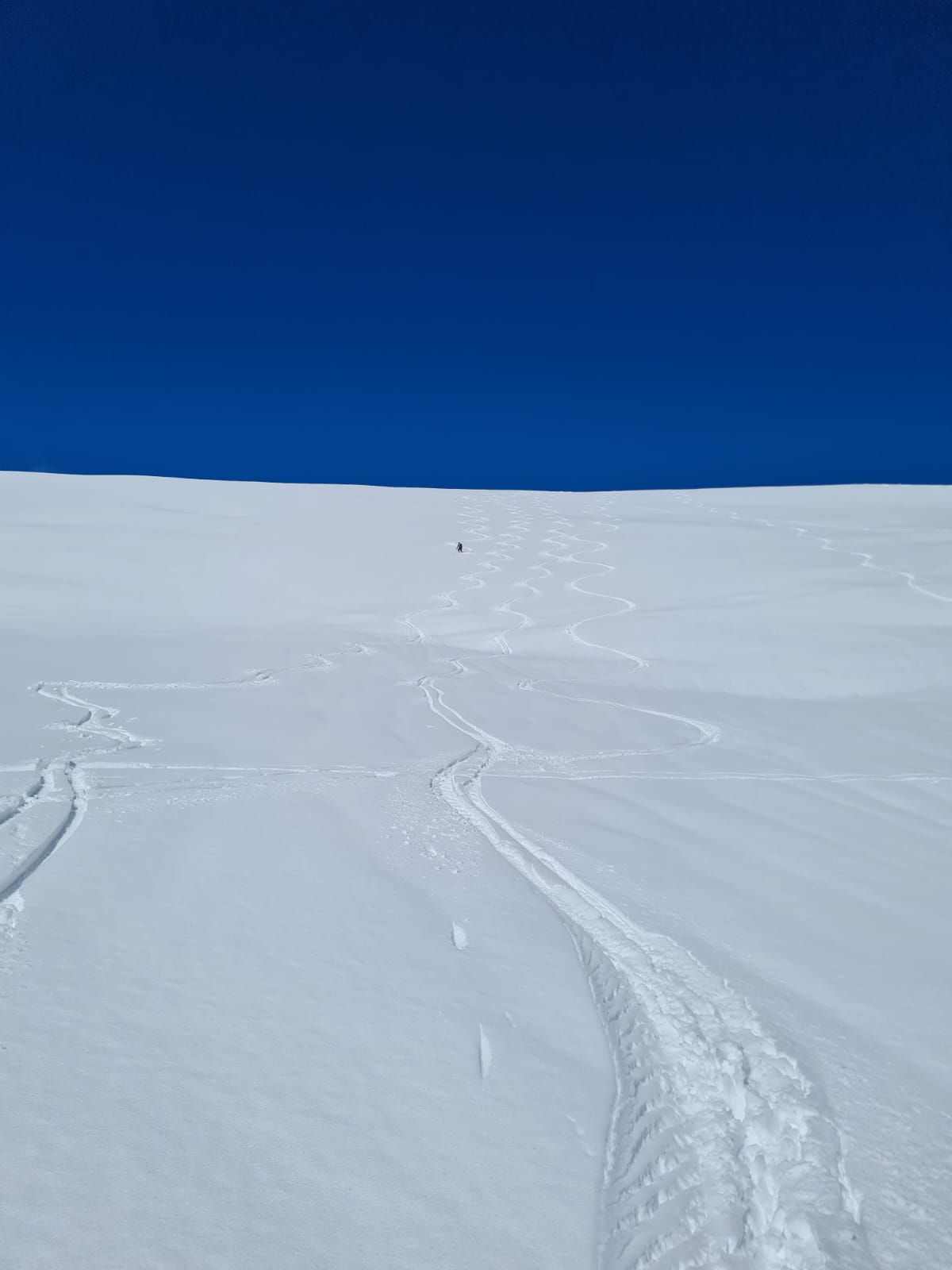 Dal piazzale seguire la pista di discesa più a destra e meno ripida, facendo attenzione agli sciatori.