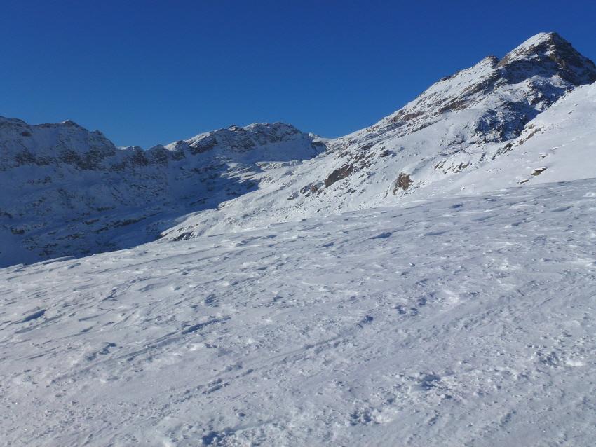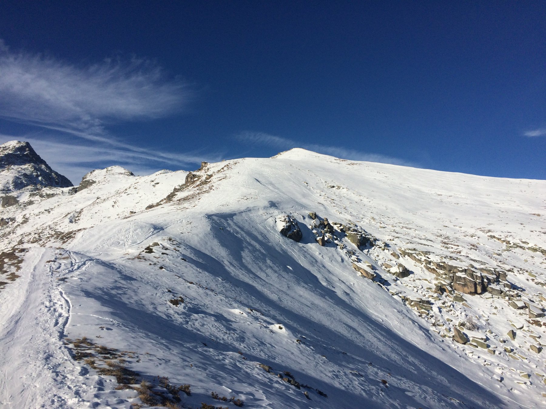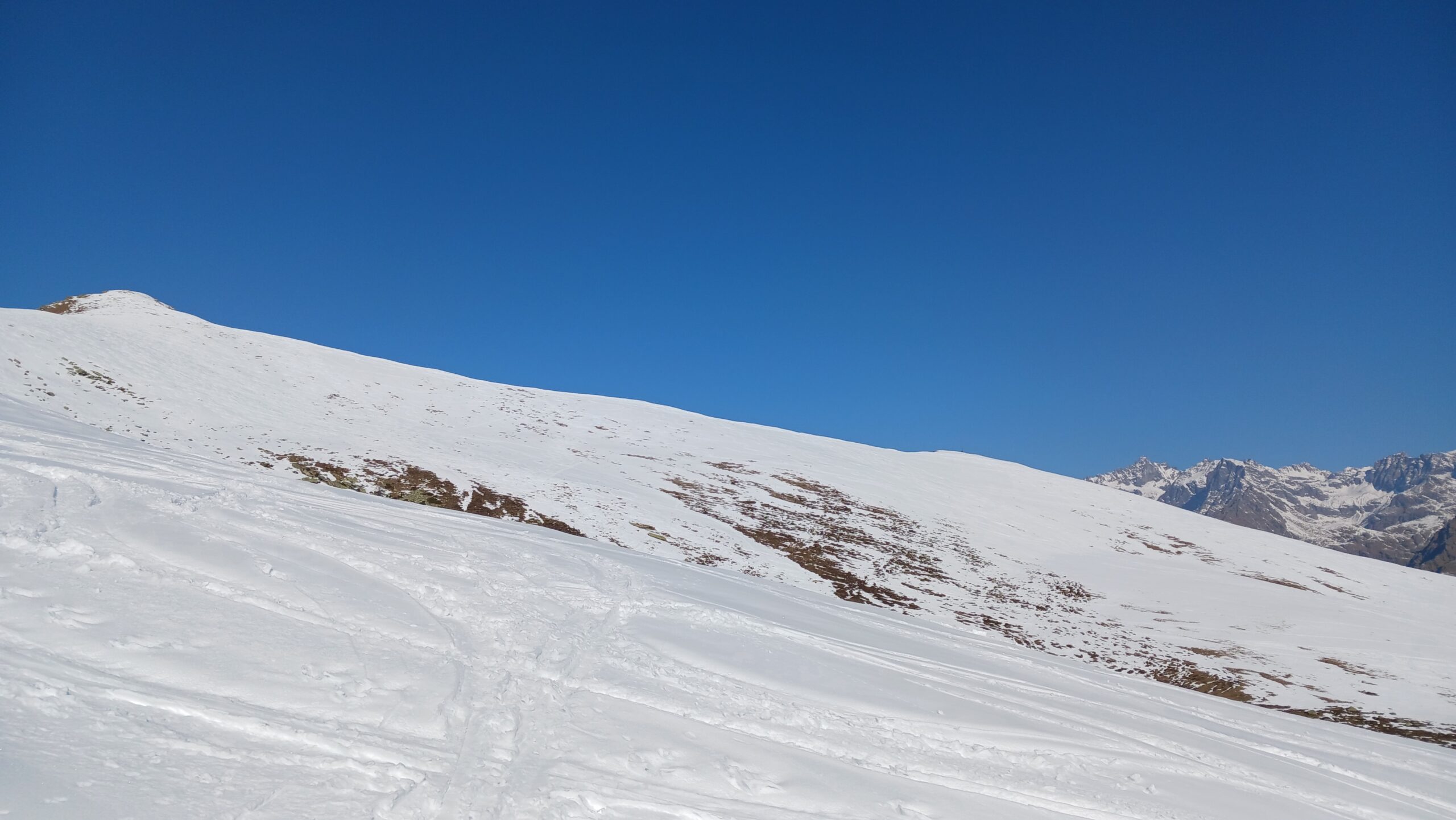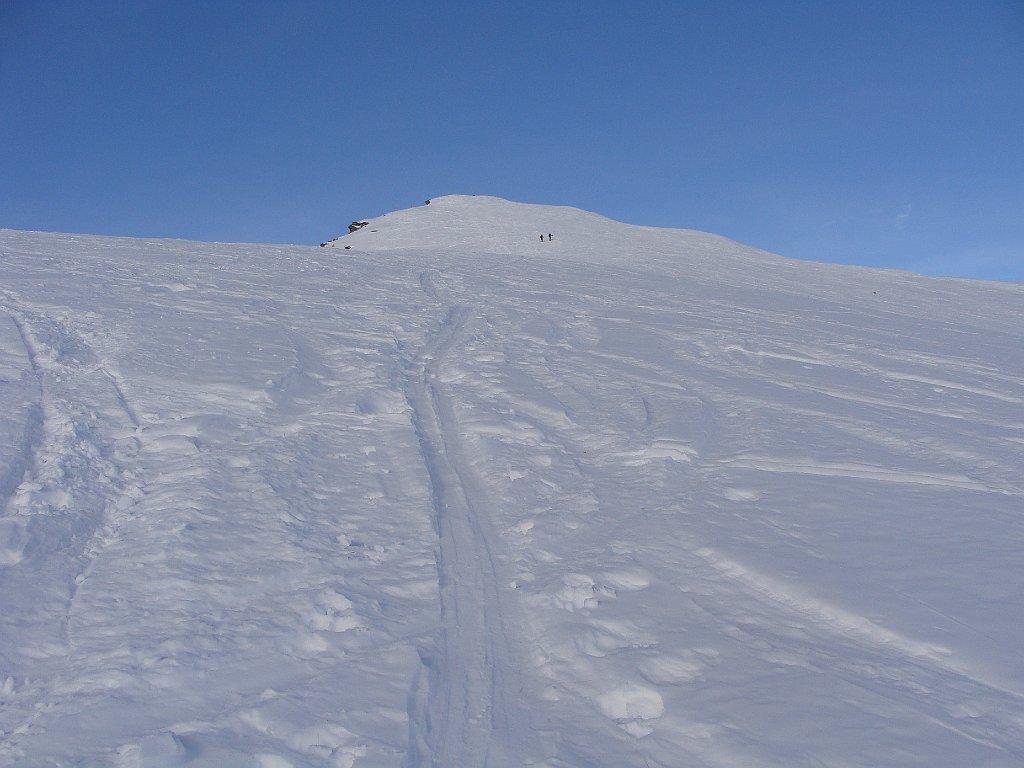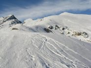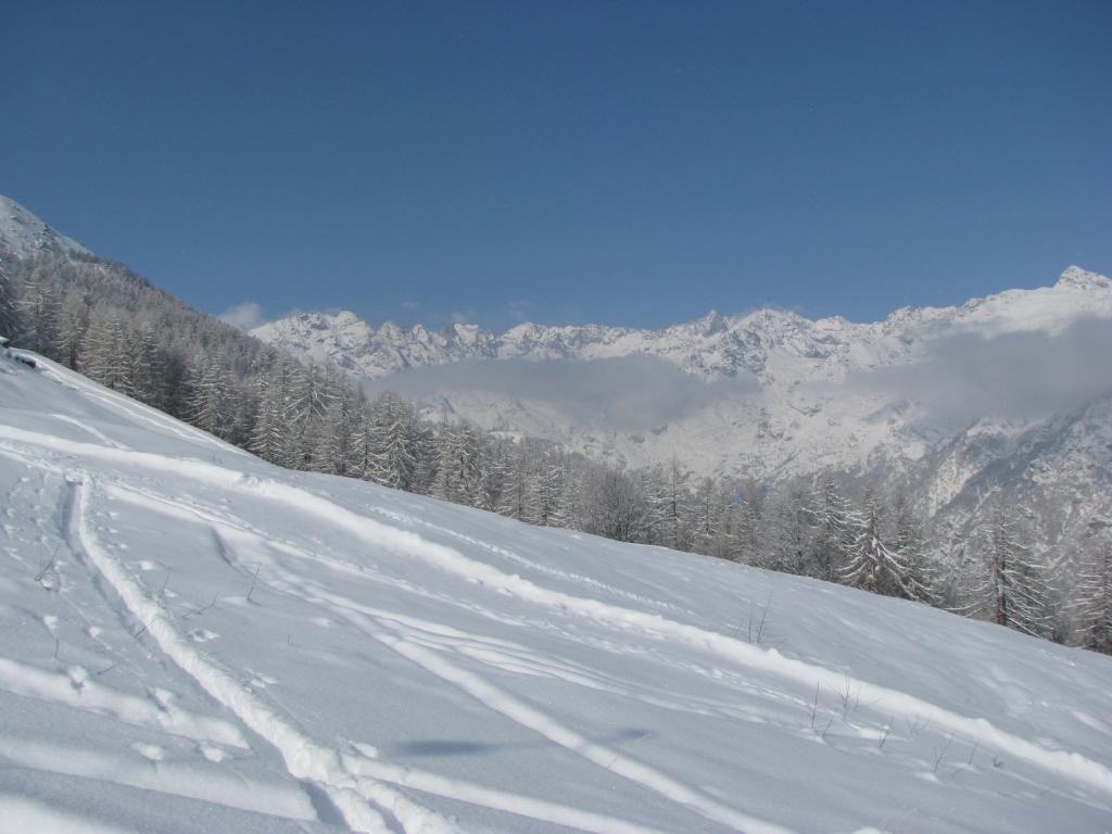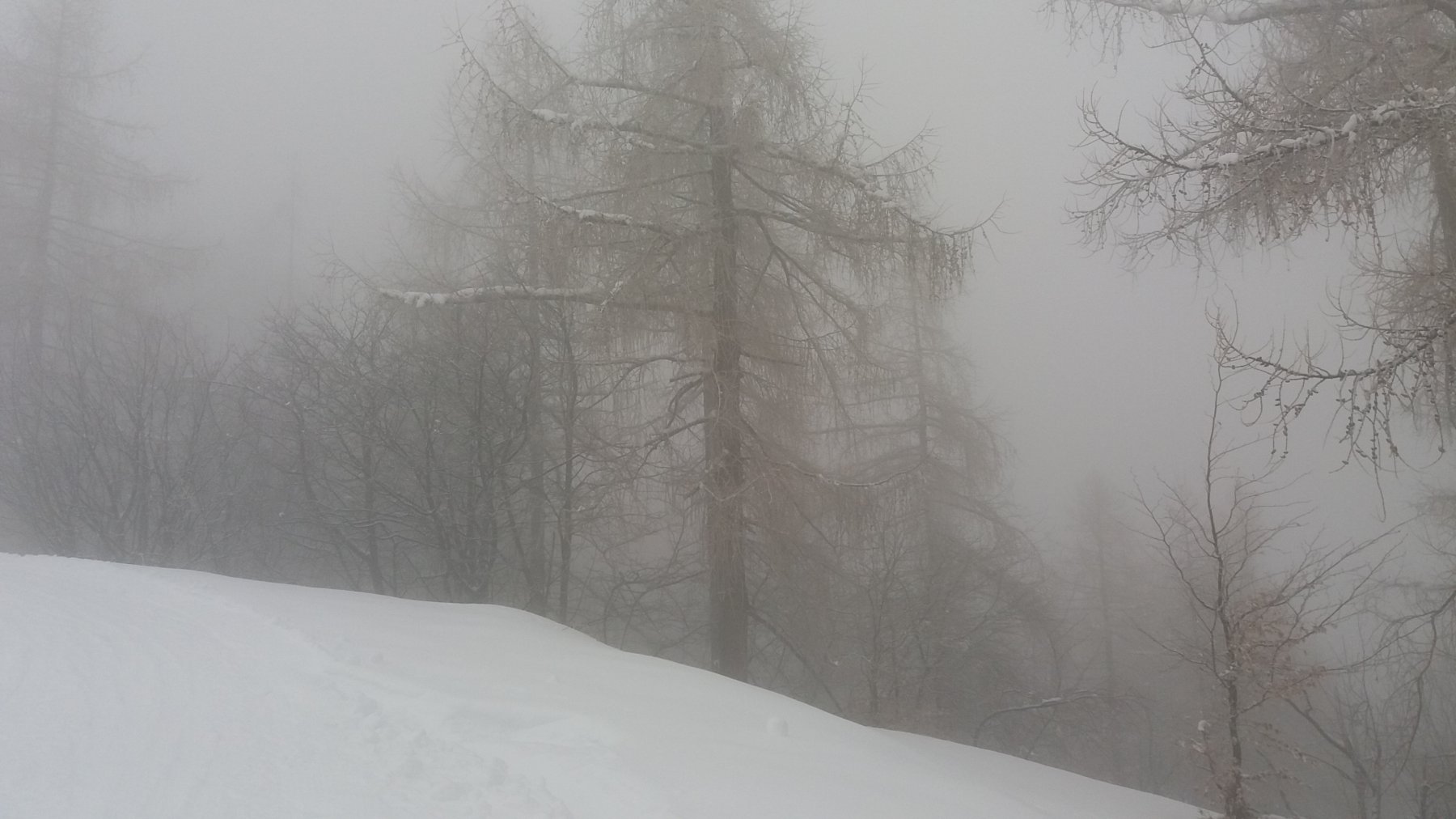 Dal piazzale seguire la pista di discesa più a destra e meno ripida, facendo attenzione agli sciatori.